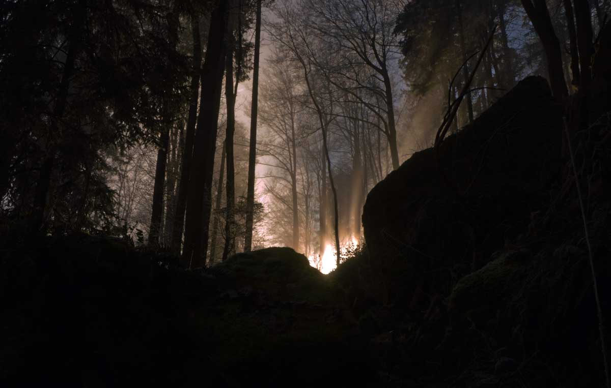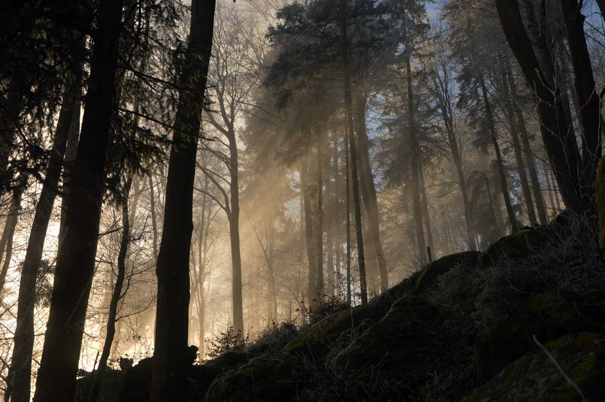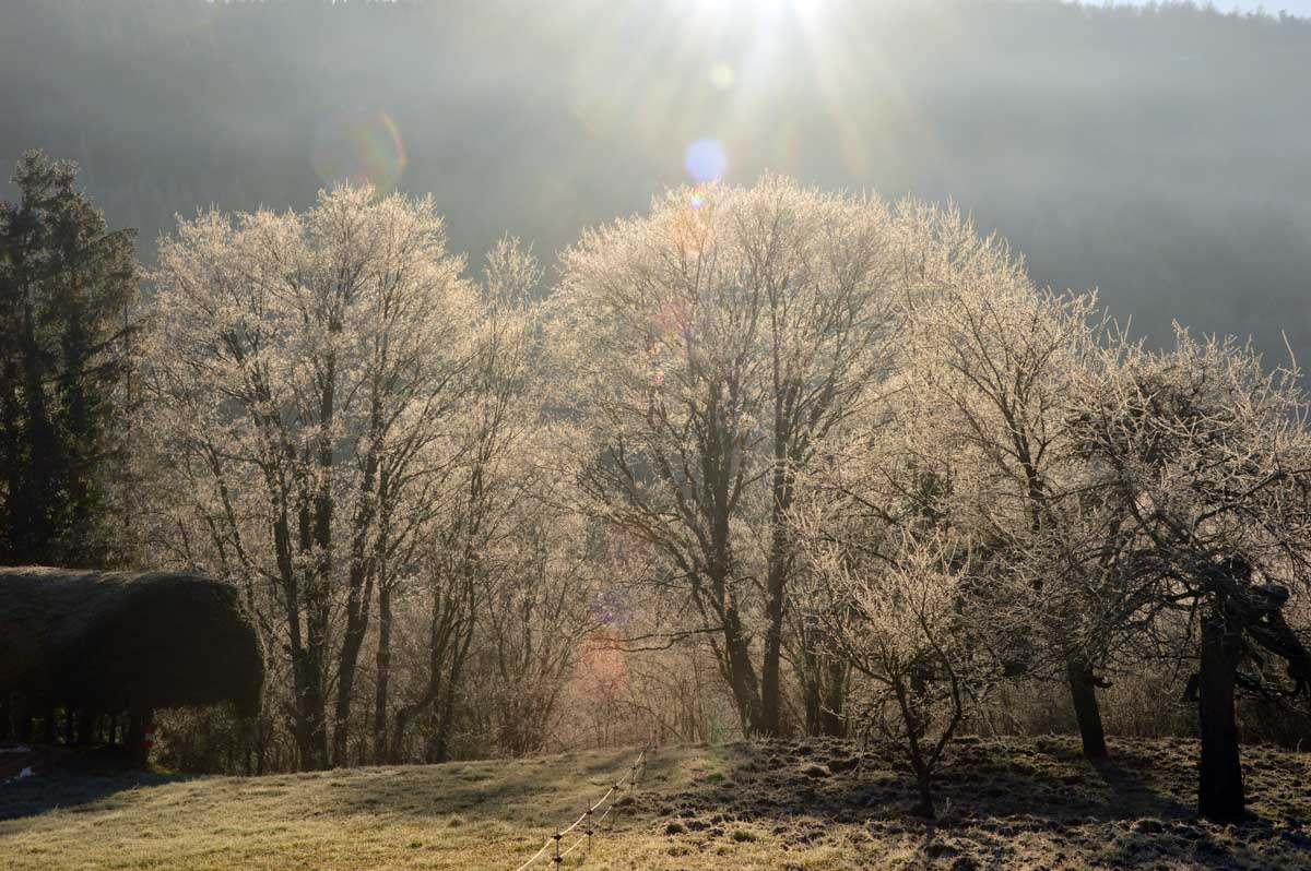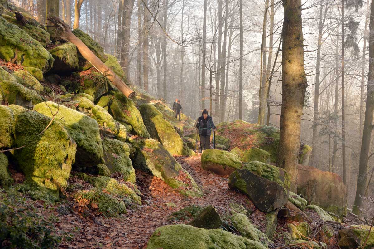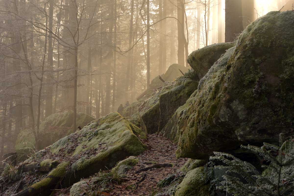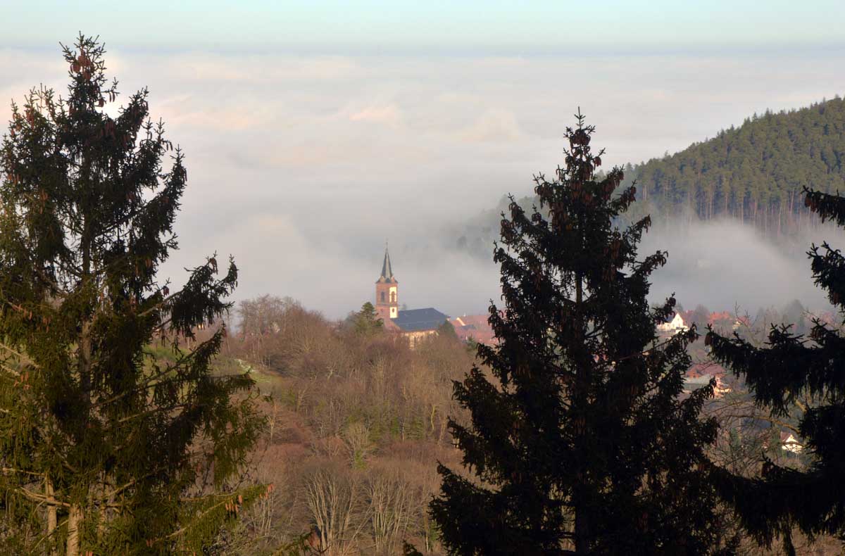 Direction Grendelbruch avant une marche dans l’ombre de la forêt. Encore une belle idée ça, marcher à l’ombre dans ce froid, sous les arbres gelés ! M’enfin bon, je râle pas, je me retiens, tout va bien. Finalement, c’était pas si irréfléchi que ça puisque comme on contournait un sommet, on a fini par se retrouver sur la face sud et donc un peu moins au froid.