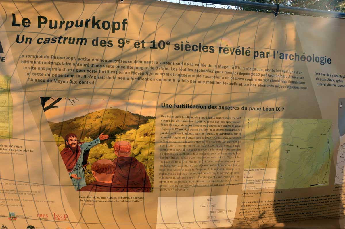 Vers 2022, t’as les gars d’Archéologie Alsace qui ont dû s’ennuyer un matin et se sont mis à fouiller le sommet pour déterminer que c’est en fait un des tous premiers châteaux-forts d’Alsace ! Construit en bois sur des fondations en grès. Il daterait du 10ème siècle et aurait été détruit au 11ème. Figure-toi que le pape Léon IX himself, le fameux alsacien-mosellan, aurait parlé de l’endroit en 1049 dans une de ses bulles (qu’il ne commettait pas dans son bain, lui). Puis plus rien, abandon du site. Du coup, peut-être qu’il y a quand même eu des Celtes puisqu’on a retrouvé des bouts de vaisselle de l’époque. Enfin j’en sais rien, moi j’attends des réponses. Continuez à fouiller les gars et si vous trouvez des poils de sanglier, me le dites pas, j’aurais que des regrets !