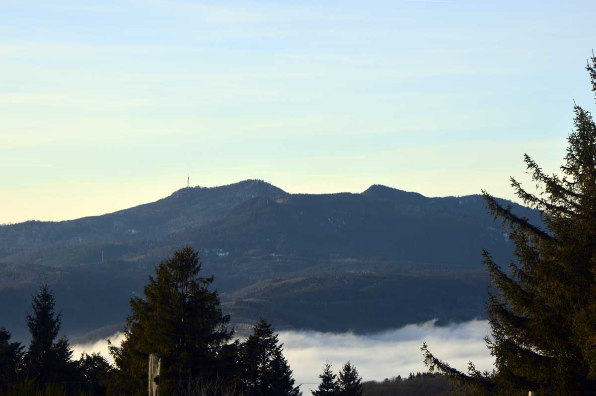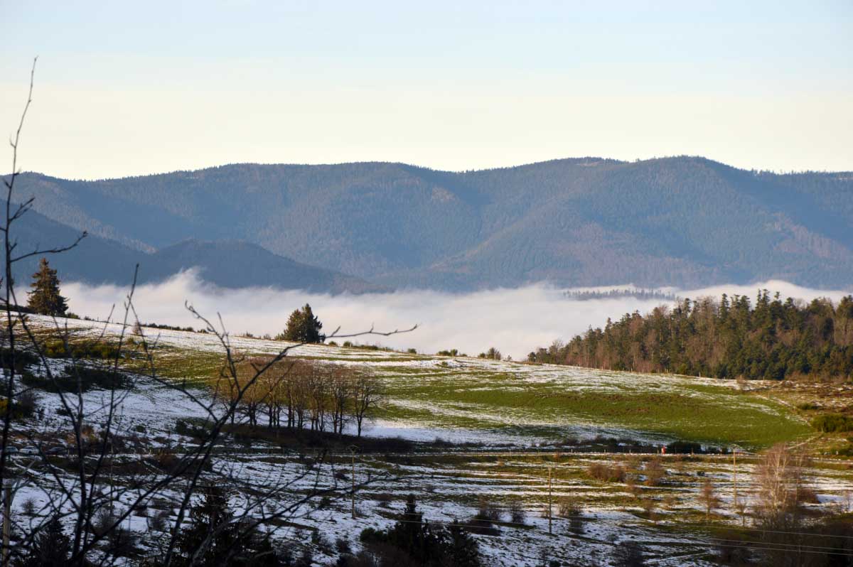 Vu qu’on créchait à sept-cents mètres d’altitude, je pesais moins lourd puisque plus on prend de l’altitude, plus la gravité diminue. Rassure-toi mon canard, à sept-cents mètres, ça fait moins de 0,2 % de mon poids, alors il en reste encore, tu risques pas de me voir disparaître ! Par contre, nous on était en plein soleil et on devinait les vallées sous un océan de brouillard. Ouah, c’est que je tourne poète, moi, en altitude !