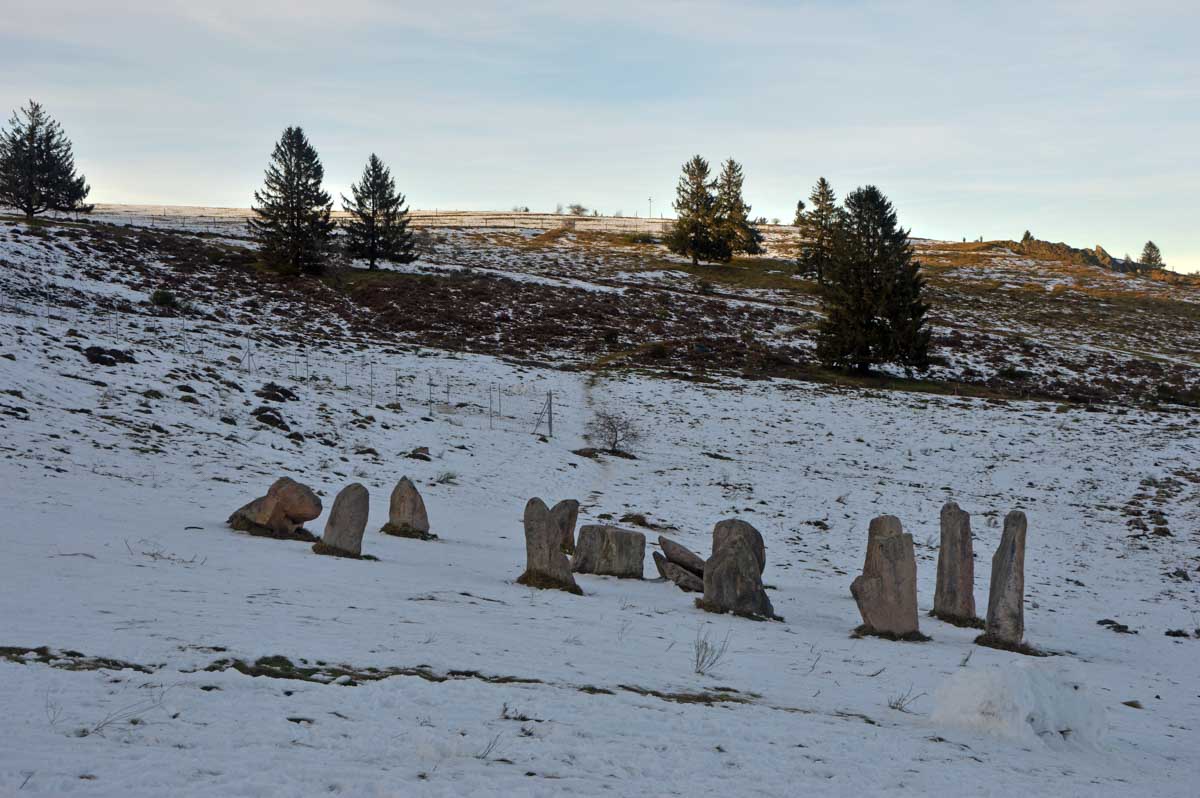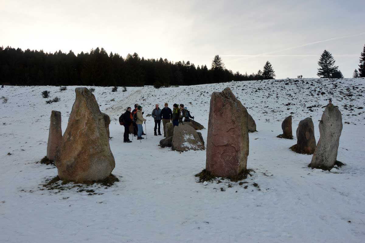 Du coup, on est bons pour lire encore dans tous les guides de rando « Le Mystérieux Purpurkopf » ! Sans réponse claire, frustrée par cette absence de Celte viril, je suis rentrée en montant au Signal de Grendelbruch après le Cercle de Pierres. Le Stonehenge alsacien, tu parles ! Une ronde de petits menhirs. Je t’explique : ce serait un site néo-druidique que des rêveurs ont érigé dans les années 1980 en utilisant néanmoins des pierres couchées dont ils se sont mis à se dire que ça aurait pu être… Je peux essayer de jouer la Grande Prêtresse sur des airs de new wave, tu vas me rire au nez que j’ai réfrigéré, alors je te laisse, je rentre au refuge me faire belle pour le Réveillon. Y’en a un qui a osé un « y’a du boulot », alors oui, y’en a maintenant du boulot, c’est vrai, mais pour le désolidariser du menhir dans lequel je l’ai inscrusté.