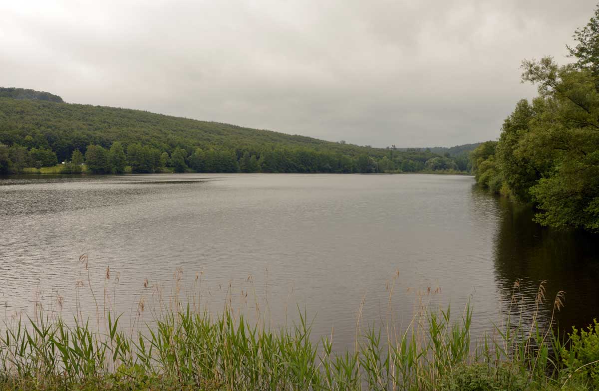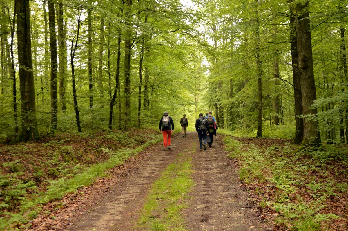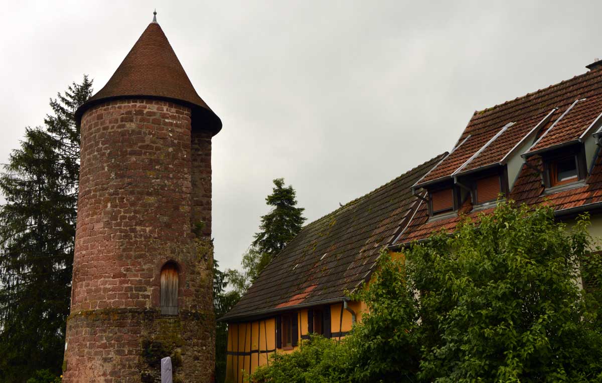 Donc nous voici à Reichshoffen, devant le château De Dietrich. Pour changer, c’est pas une ruine. Et direction la chapelle de Wolfahrtshoffen qui a failli devenir une ruine après l’incendie de novembre 2023. Elément rassurant : le toit est protégé et la reconstruction entamée. Wolfahrtschose, c’est aussi le nom de l’étang que nous longeâmes, courageux, un peu en mode amphibie. Un peu plus, je me transformais en grenouille et je coassais dans l’eau, ne sachant plus si je marchais sur le sentier ou si je nageais dans l’étang. Enfin moi je préfère quand même voir des étangs qui débordent, que des lacs à demi asséchés durant les sécheresses sèches et archi sèches.