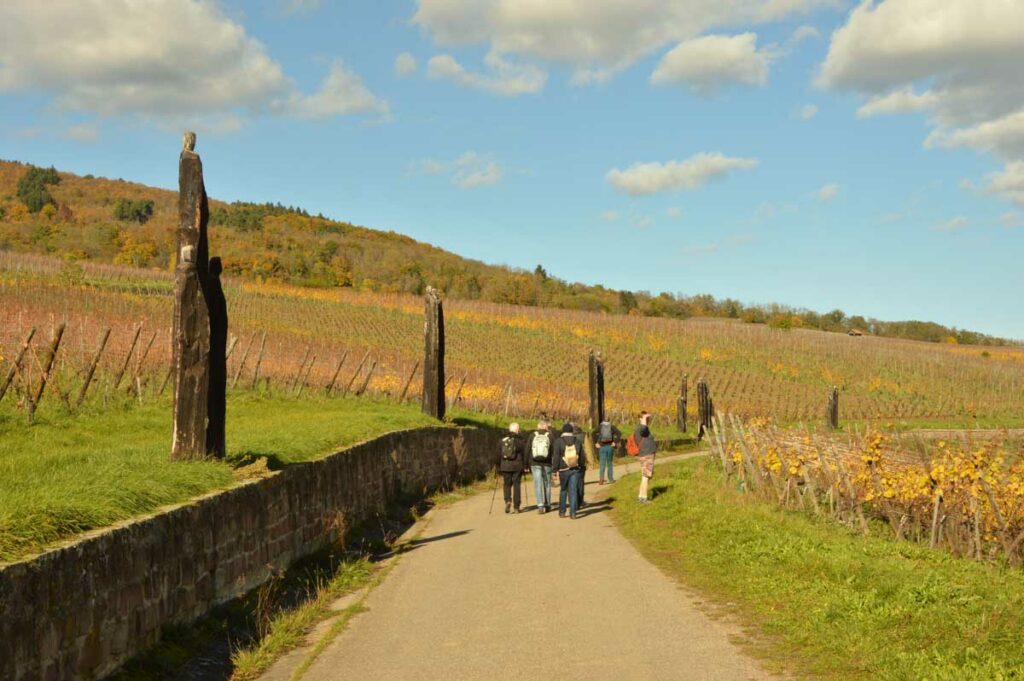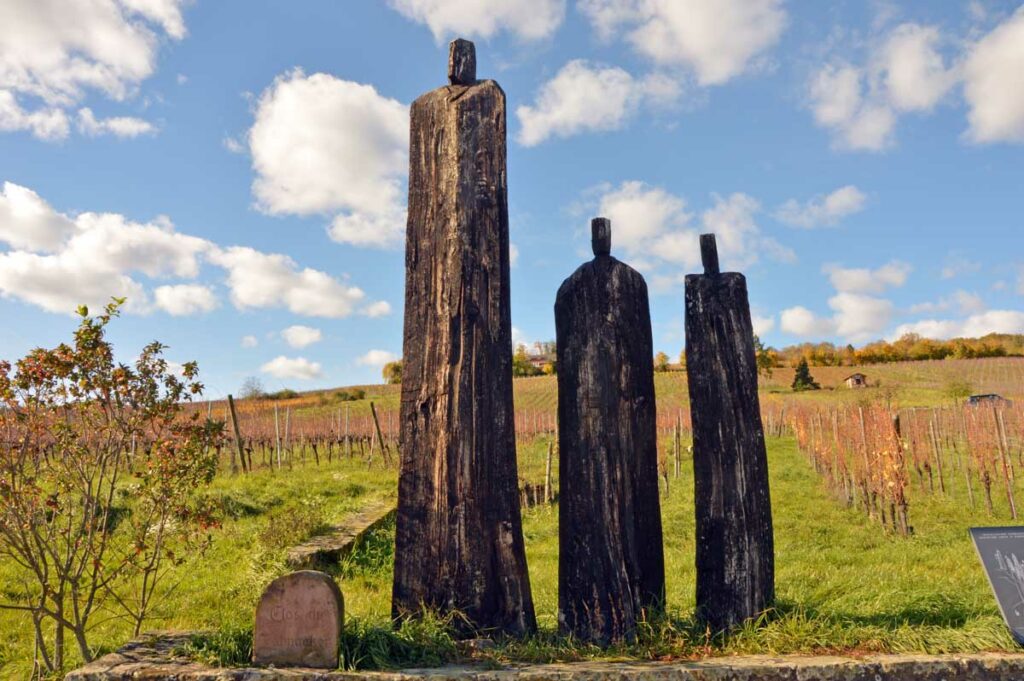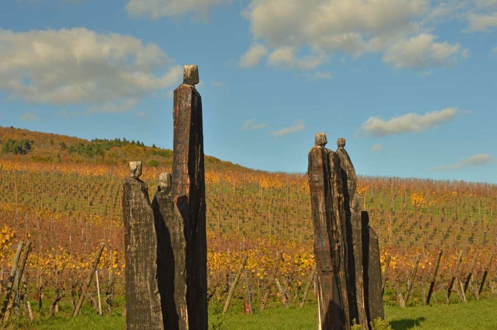 Avec mes émois d’austérité picolesque de début de compte-rendu, j’en ai oublié de te parler de l’assemblée du Clos Zahnacker ; Christian Lapie a installé en 2002 sept groupes de statues réalisées en bois calciné, sur le domaine Zahnacker justement. J’aurais dû commencer par ça d’ailleurs, parce qu’enfin, on est dans le Haut-Rhin et dans les vignes, alors il faut en parler, du pinard !