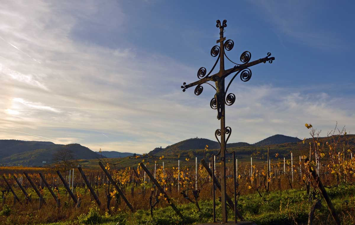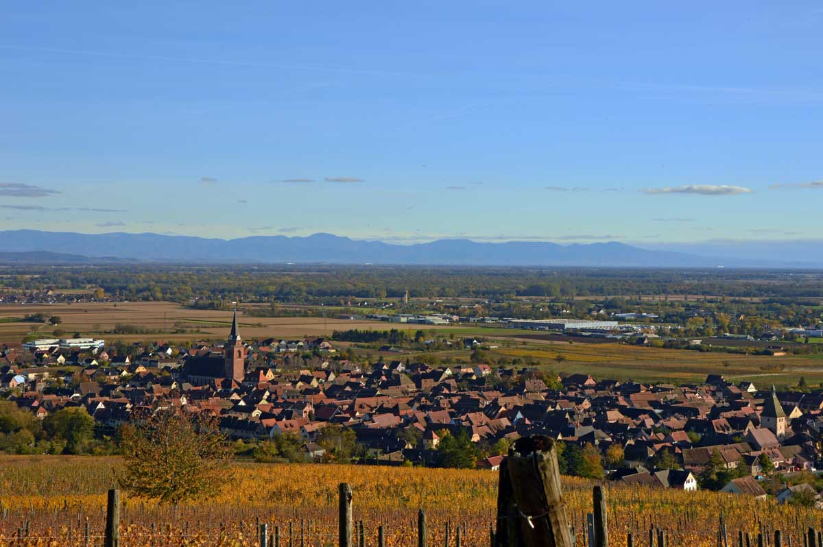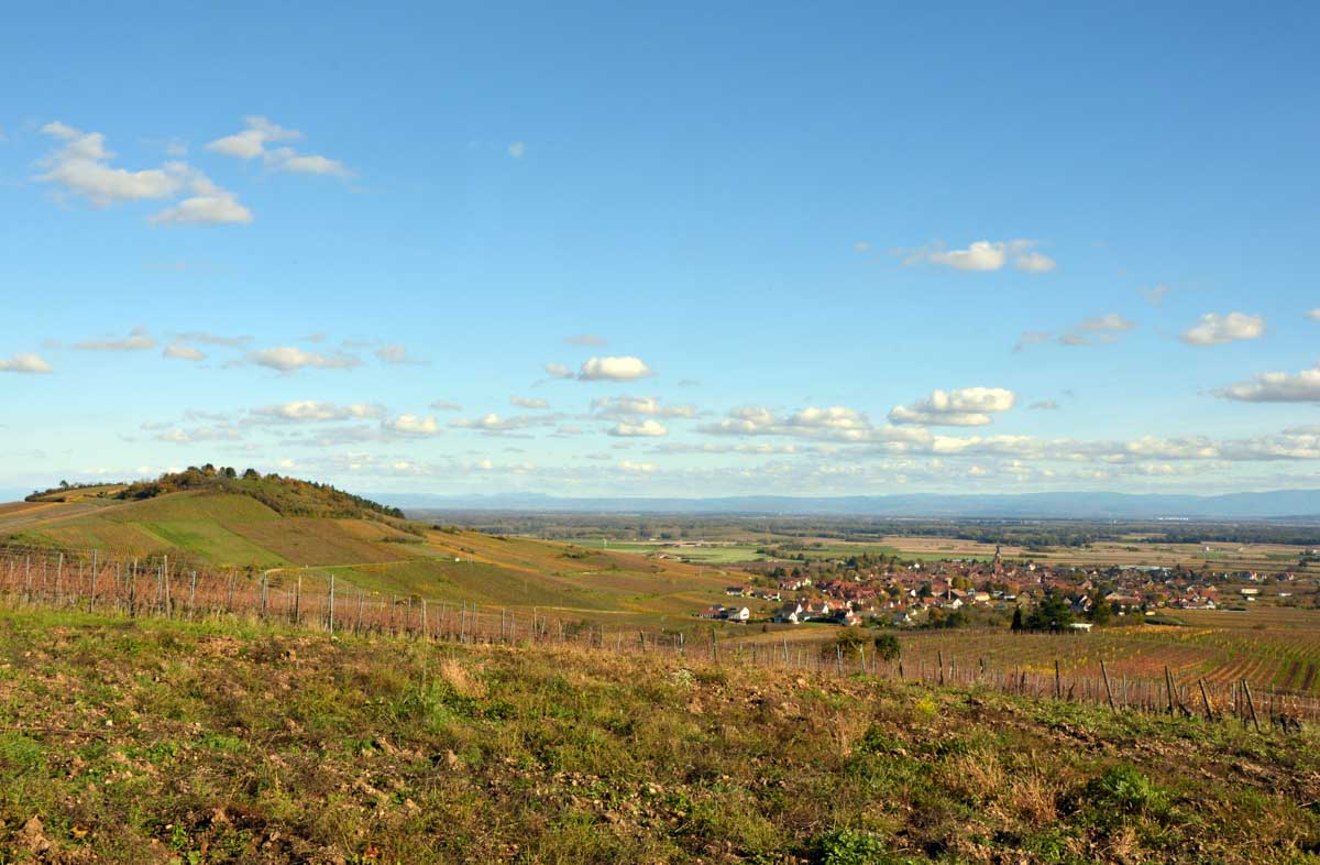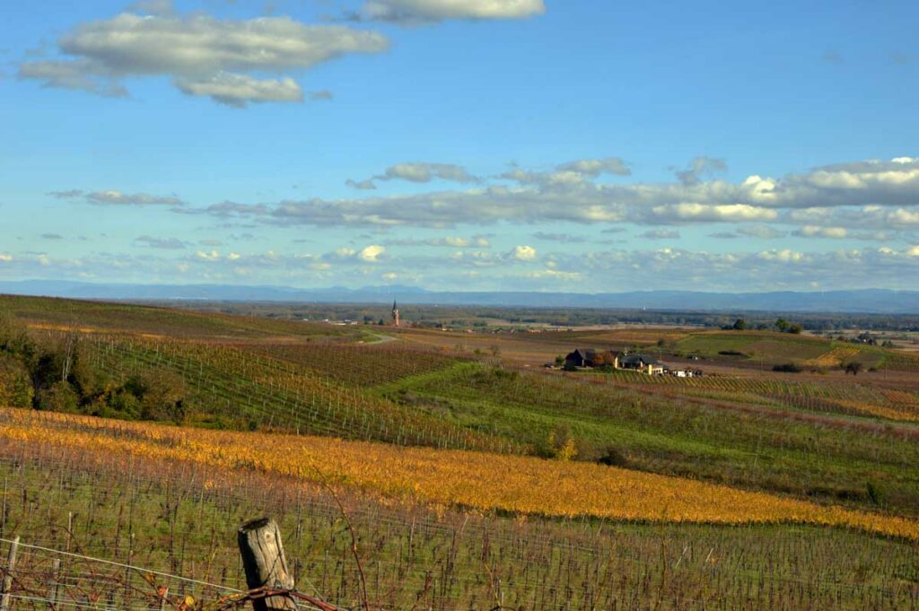 On pouvait partir de la Cave de Ribeauvillé tiens, ça eut été classe, ça. Ou alors le Domaine Ostermann, la Maison Trimbach, le Domaine Sipp, tu vois, enfin un lieu qui parle, un endroit en rapport avec la vigne automnale, quelque chose qui évoque les vendanges, le bon vin blanc bien de chez nous, on est dans le 68, diantre !