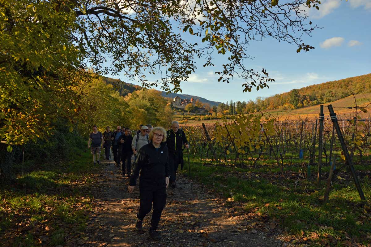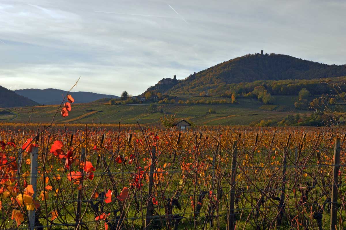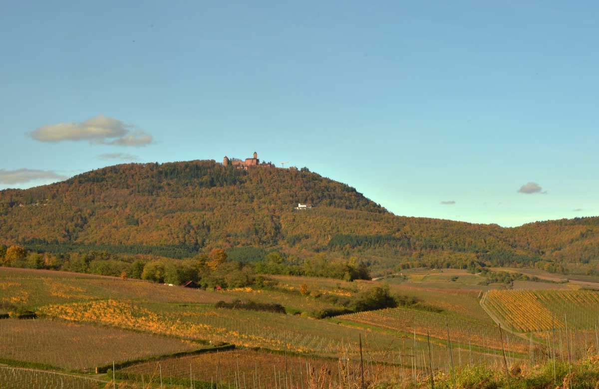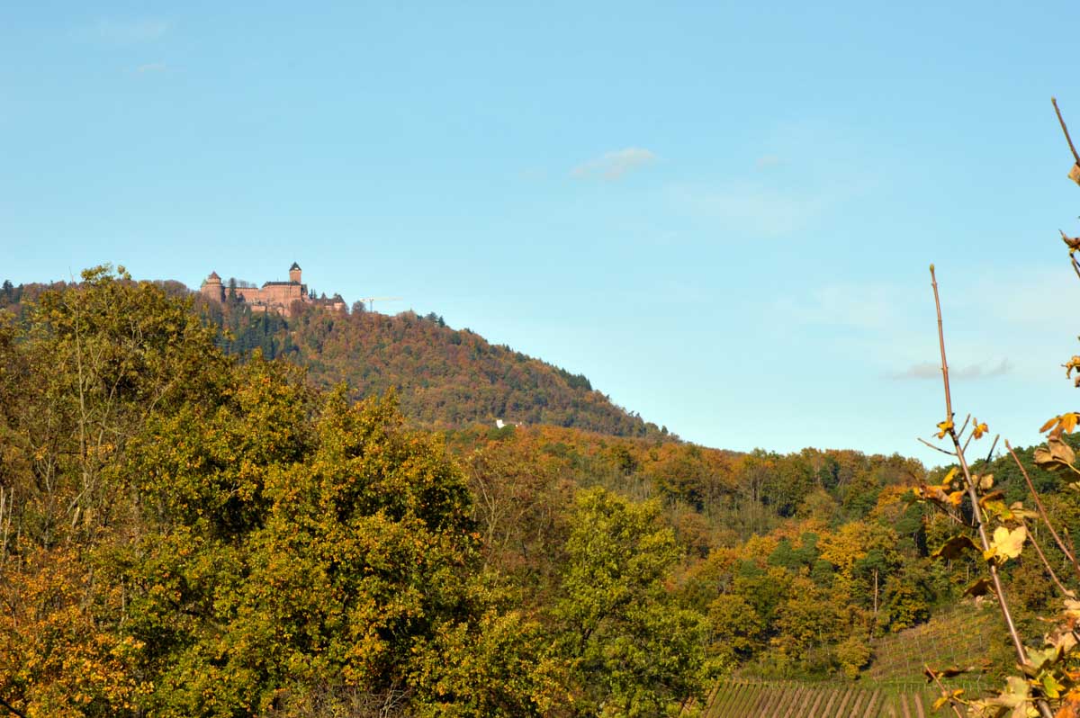 Donc alsabalade dans les vignes par une météo inespérée ! Au 13ème siècle près de Bergheim a été construit un château devenu ruine (à force je me demande pourquoi ils n’ont pas directement construit une ruine), restauré au 19ème siècle, abandonné en 1939/45, il a été acheté dans les années 1950 par un Monsieur Cognacq (ah ben voilà un nom sympa !) en même temps que de la vigne, et depuis est devenu un… domaine viticole renommé. Ah, le niveau de la journée remonte !