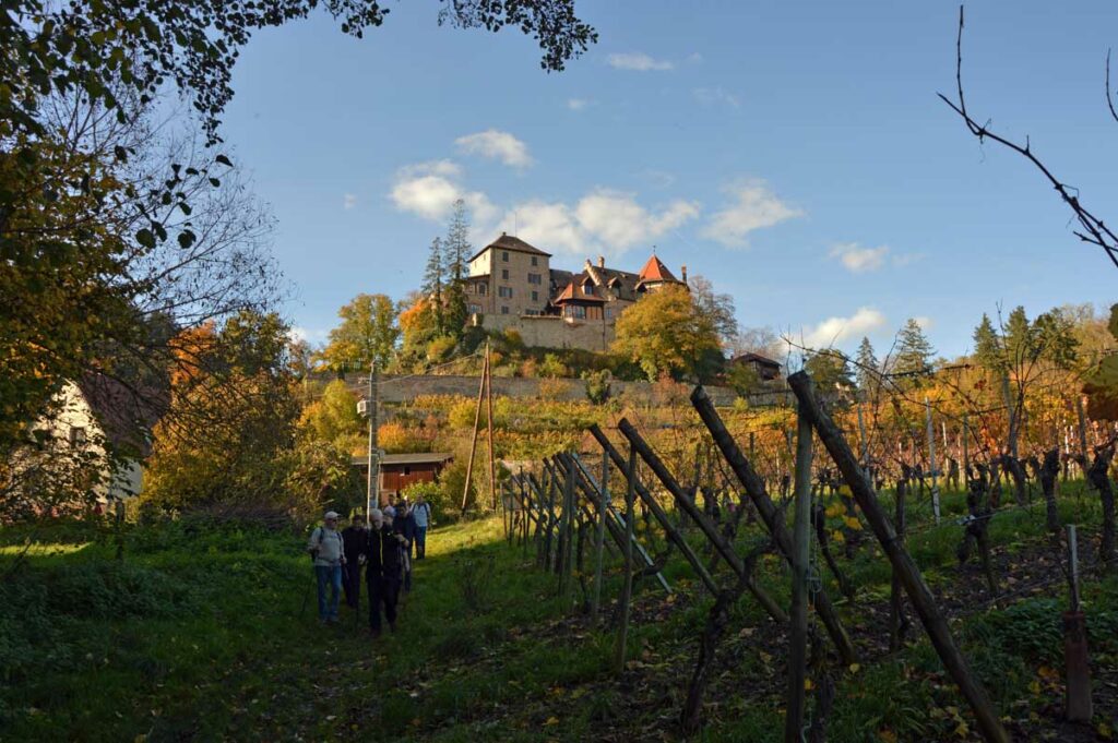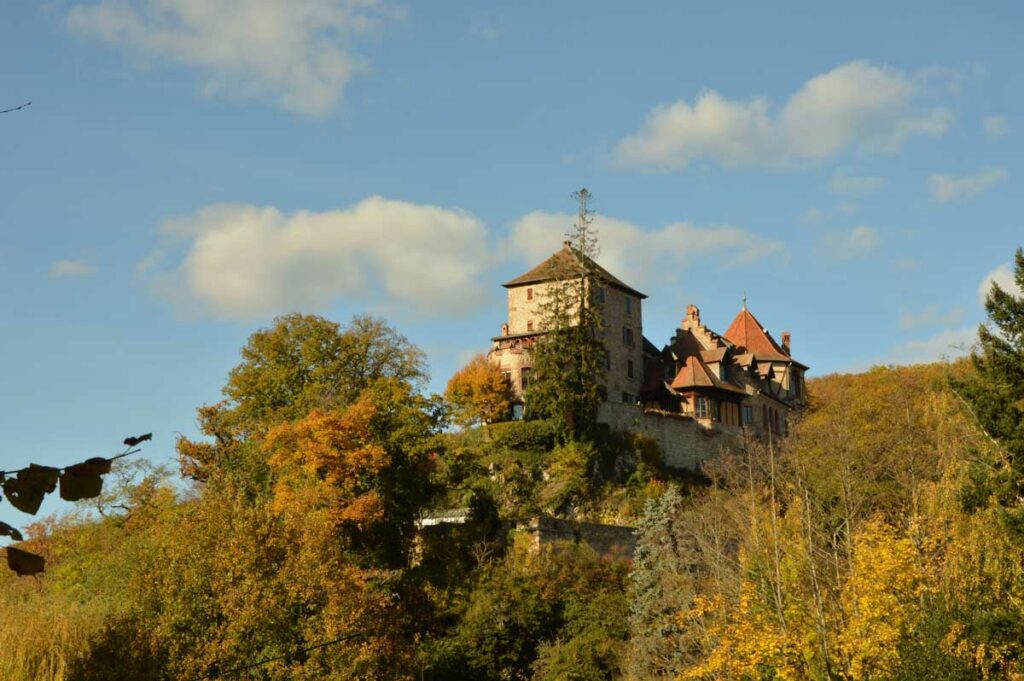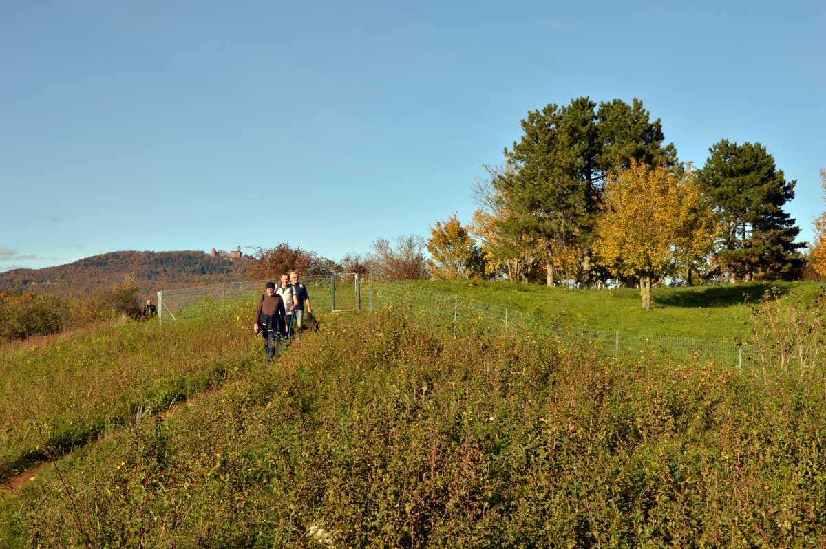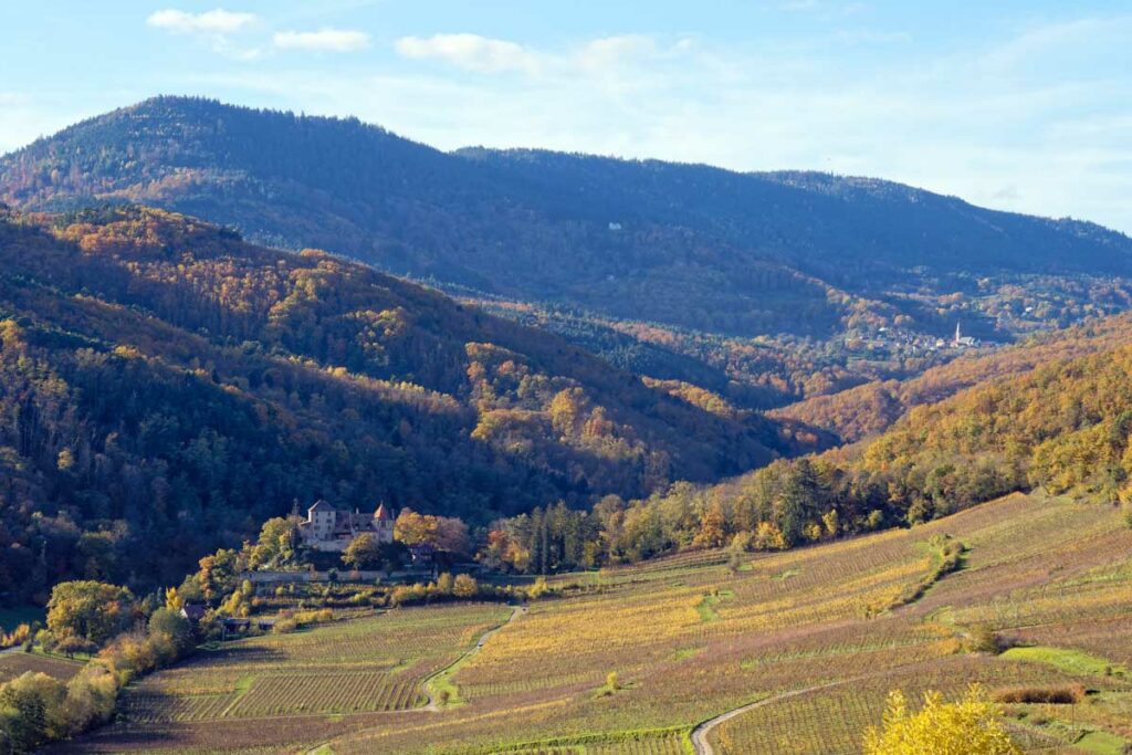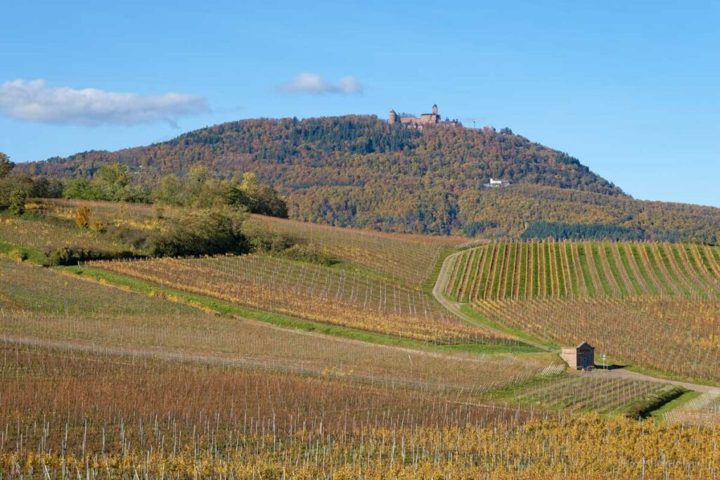 Donc alsabalade dans les vignes par une météo inespérée ! Au 13ème siècle près de Bergheim a été construit un château devenu ruine (à force je me demande pourquoi ils n’ont pas directement construit une ruine), restauré au 19ème siècle, abandonné en 1939/45, il a été acheté dans les années 1950 par un Monsieur Cognacq (ah ben voilà un nom sympa !) en même temps que de la vigne, et depuis est devenu un… domaine viticole renommé. Ah, le niveau de la journée remonte !