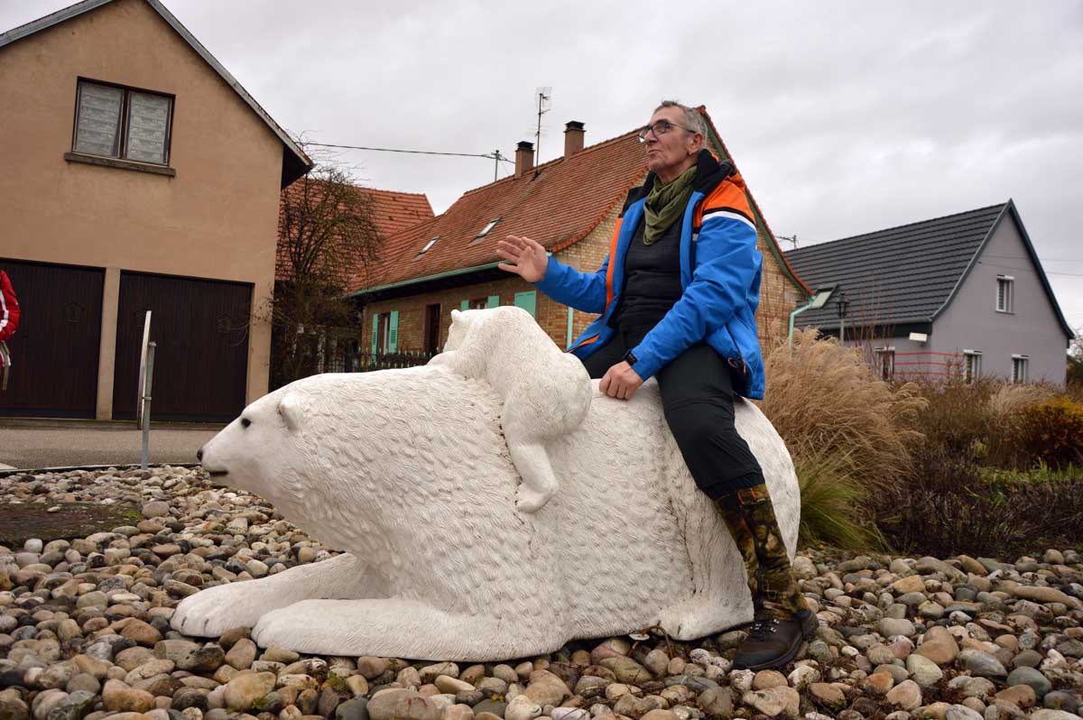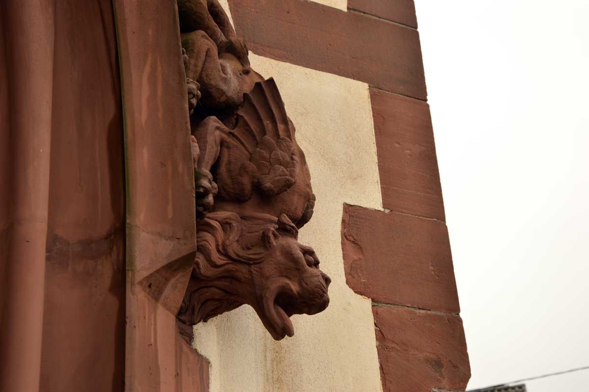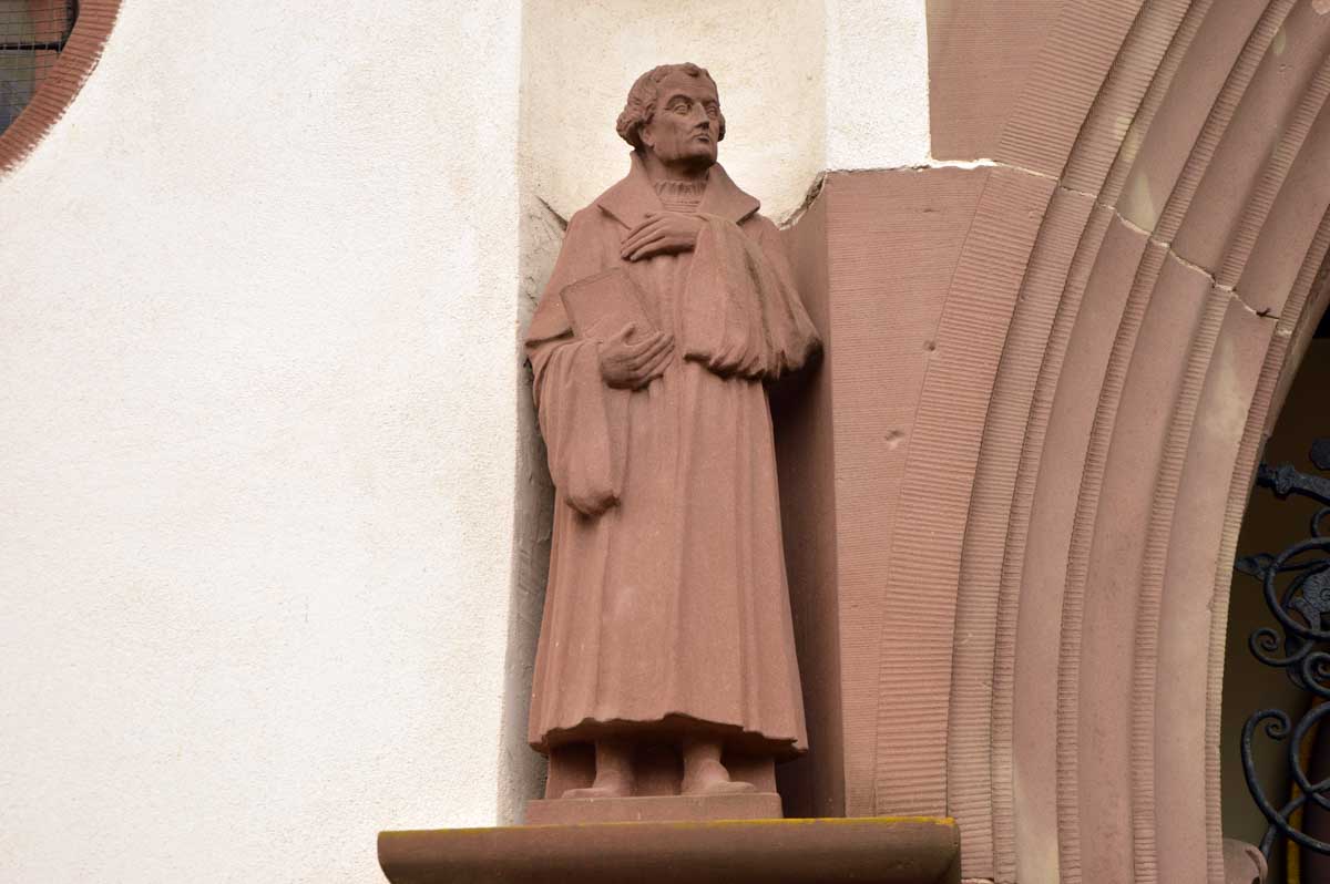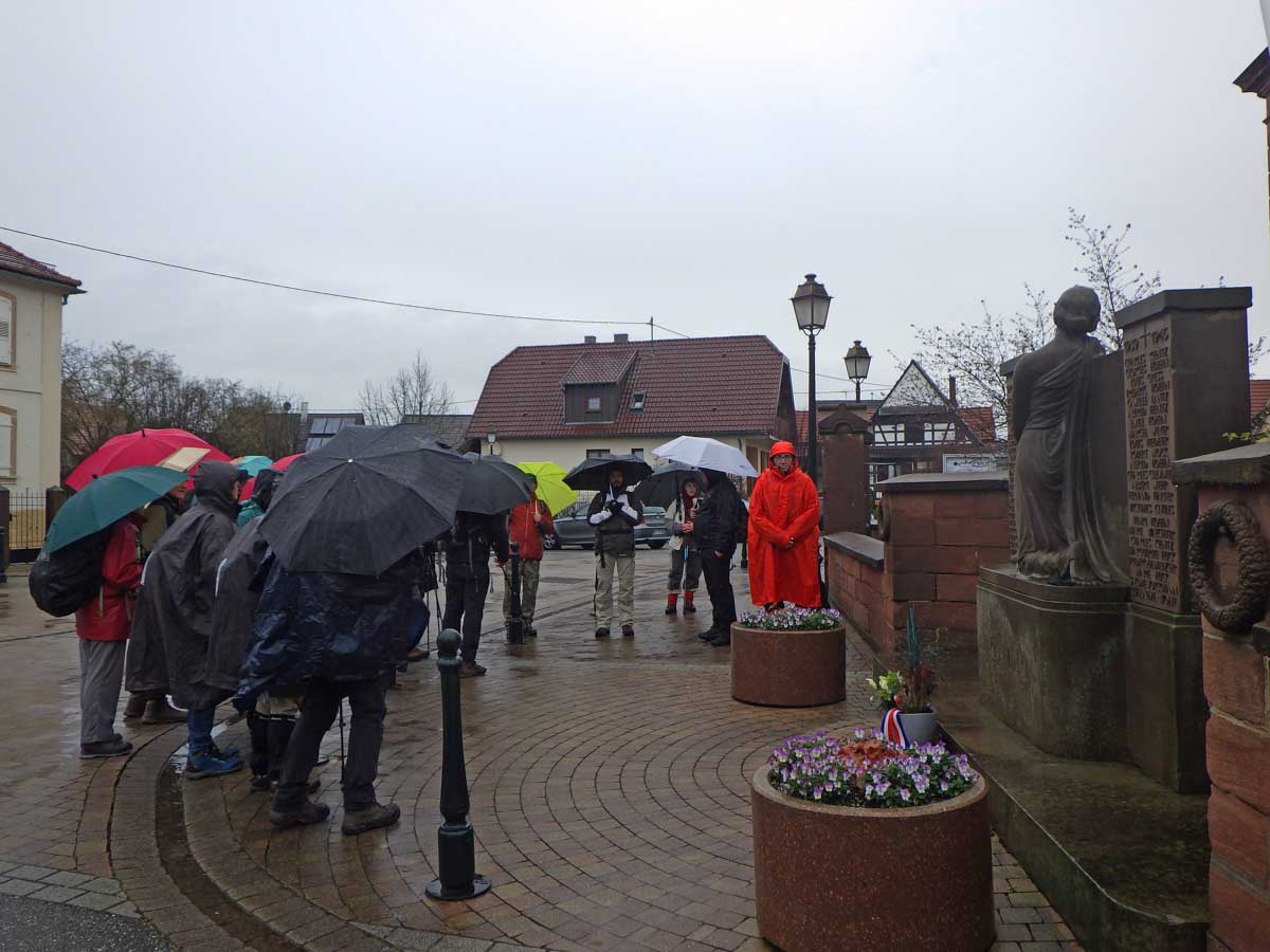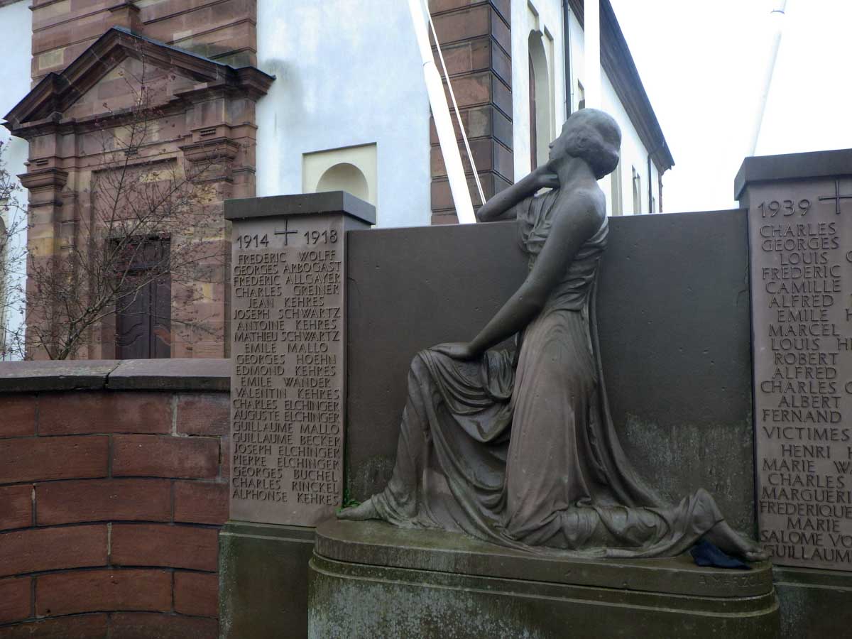 Première étape au monument aux morts de Rountzenheim, sculpté par Alfred Marzolff, celui que l’on nomme le Rodin alsacien. Installé dans le village au début du 20ème siècle, il en réalise le monument en question, et ses œuvres sont visibles un peu partout en Alsace, notamment à Strasbourg, que ce soit sur le pont Wilson, sur la façade de la préfecture, ou sur la Place Broglie, entre autres. Contemporain d’artistes comme Charles Spindler ou Gustave Stosskopf, il a embelli de ses œuvres la Neustadt naissante. Je ne l’ai pas connu, sinon je suis sûre qu’il m’aurait pris comme modèle. Il est aussi l’auteur des modèles des Martins (Luther et Bucer) qui auront finalement été réalisés en 2006 seulement, devant le temple de Sessenheim.