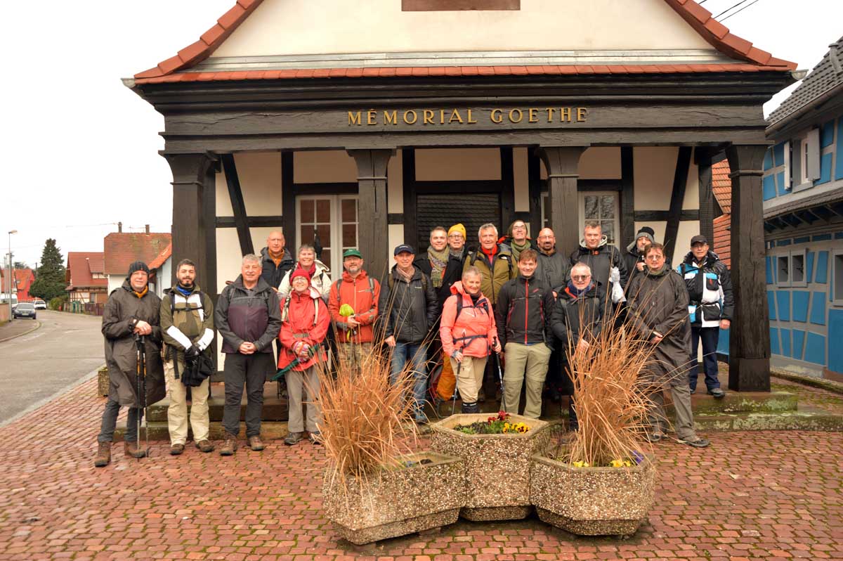 Wer reitet so spät durch Nacht und Wind, es… L’était inspiré le père Goethe quand il a écrit le Roi des Aulnes en 1782. Ce qu’on sait moins, c’est que onze ans plus tôt, il a séjourné à Sessenheim où du coup il a maintenant son mémorial. A côté se trouve la Grange aux Rires, vestige du presbytère qu’a connu notre Johann Wolfgang et où il amusait les jeunes gens du village. Nous avons déjeuné sous l’abri du Tumulus Friederikes Ruh, encore nommé le Goethehügel. En se baladant ici avec sa Frédérique, Goethe pensait aussi aux Celtes qui occupaient déjà le tumulus des siècles avant lui. Puis bien sûr, nous nous sommes rendus au chêne où il a conté fleurette à damoiselle Brion. Deux-cent-cinquante ans après, ledit chêne est devenu un arbre touristique. Moi j’ai fait pipi derrière le deuxième hêtre à droite après les trois frênes, j’suis pas sûre qu’on en fera toute une histoire dans deux siècles…
