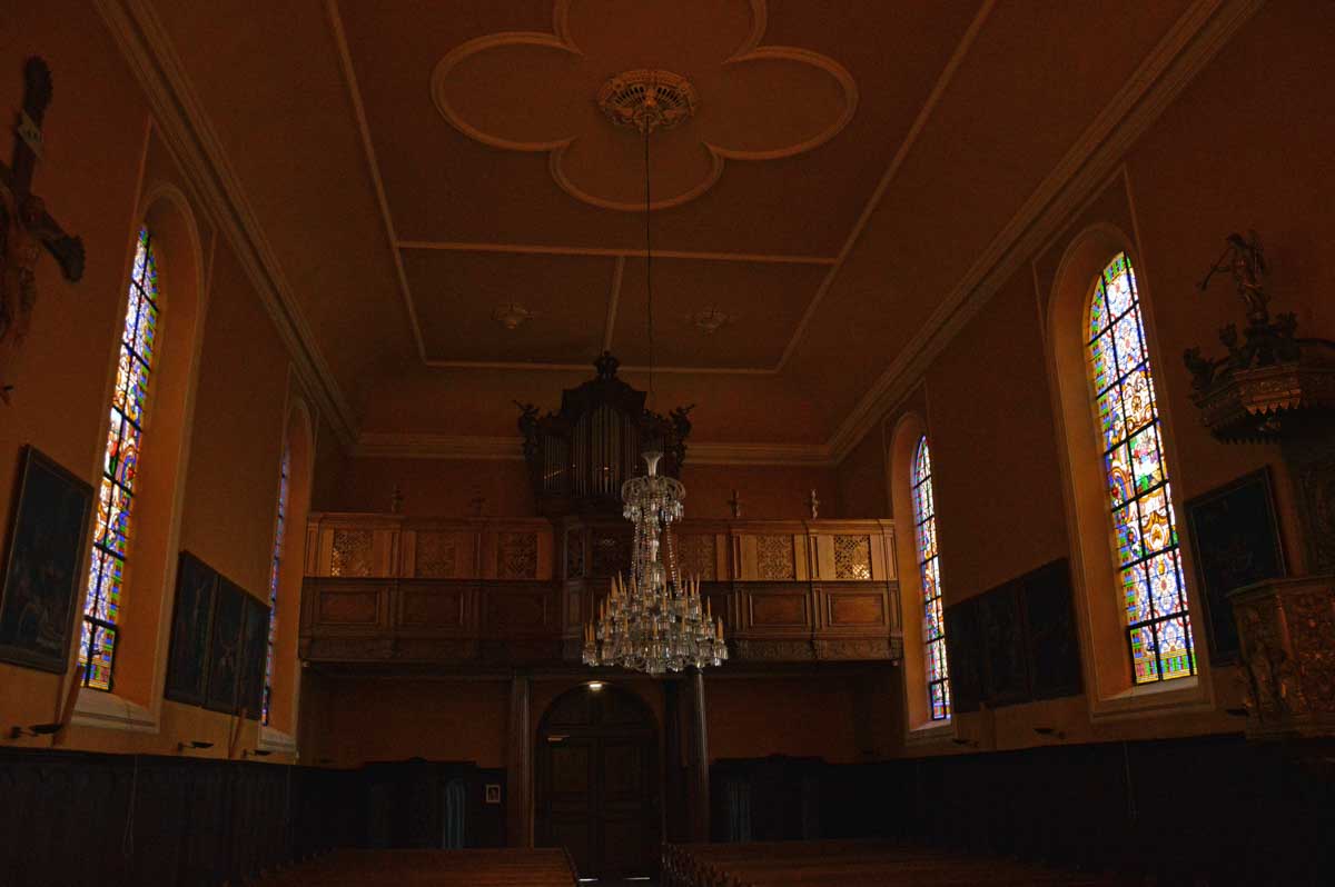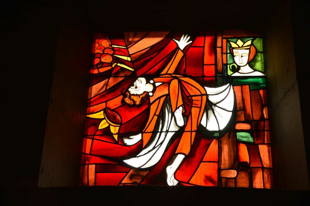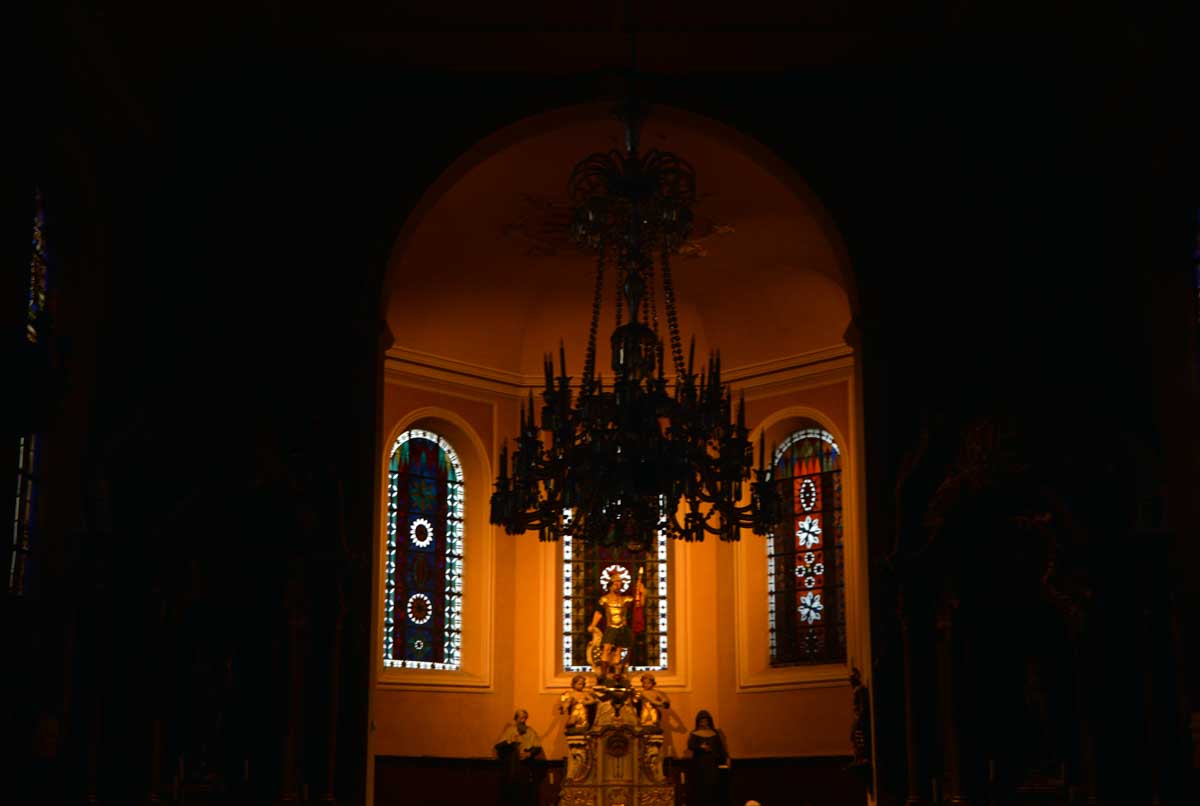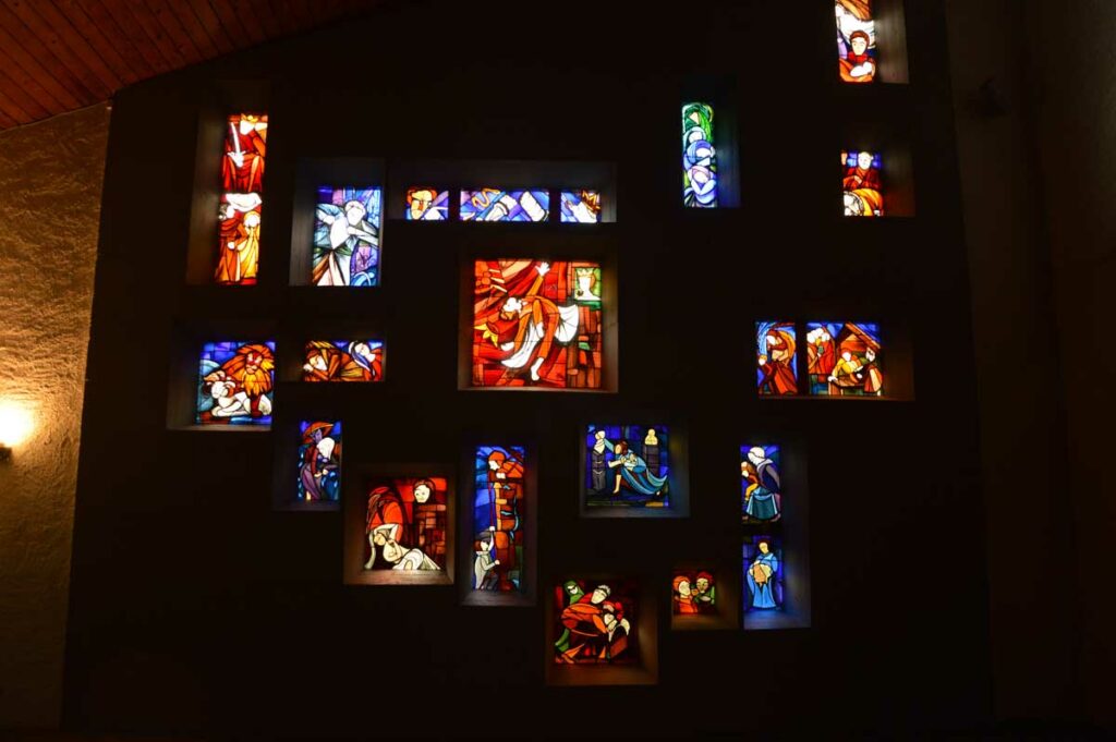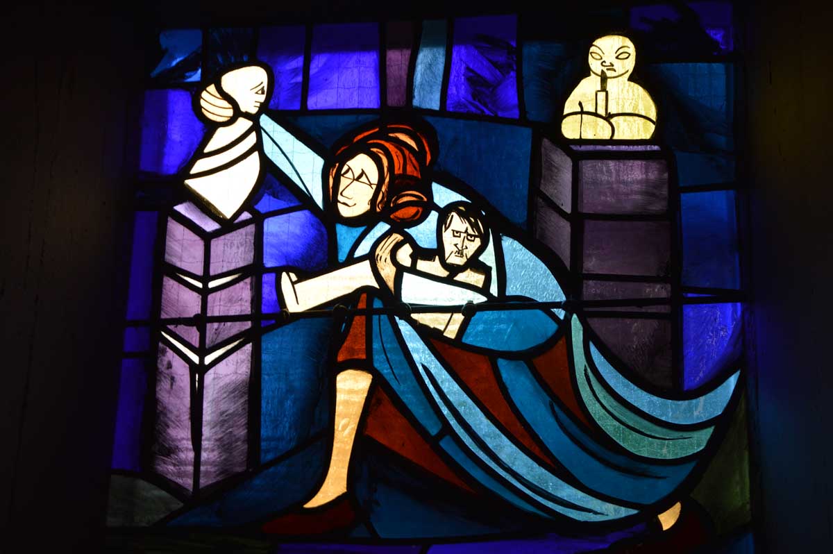 Nous clopinâmes au travers de la forêt donc automnale et entre deux petites rincées, jusqu’à la Rose Rose, l’église Sainte-Thérèse de Vasperviller. En béton, elle date de 1968 et c’est l’intérieur qui vaut le coup. D’abord parce qu’à ce moment-là, hop, une averse, et ensuite pour ses vitraux ! Y’a une des icônes du mal un peu particulière, cherche bien tu reconnaîtras tout de suite.
