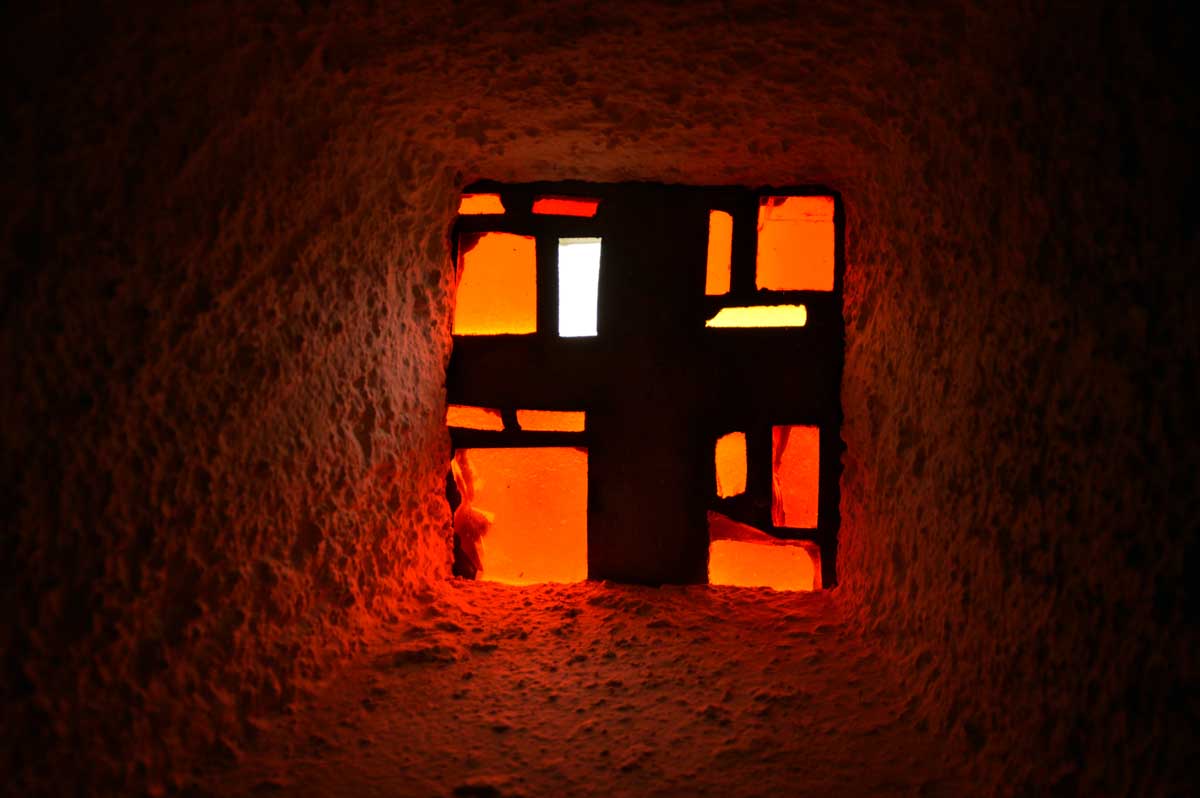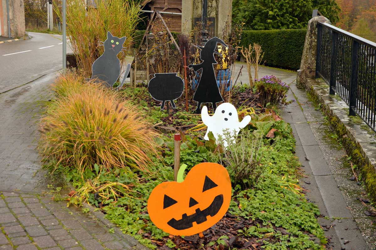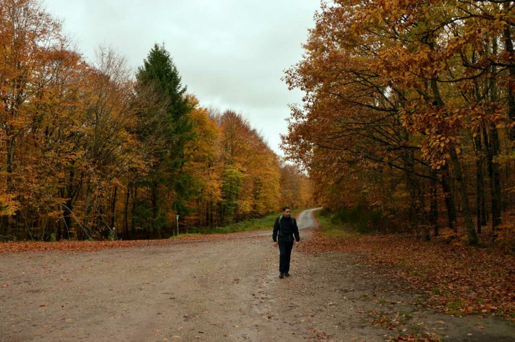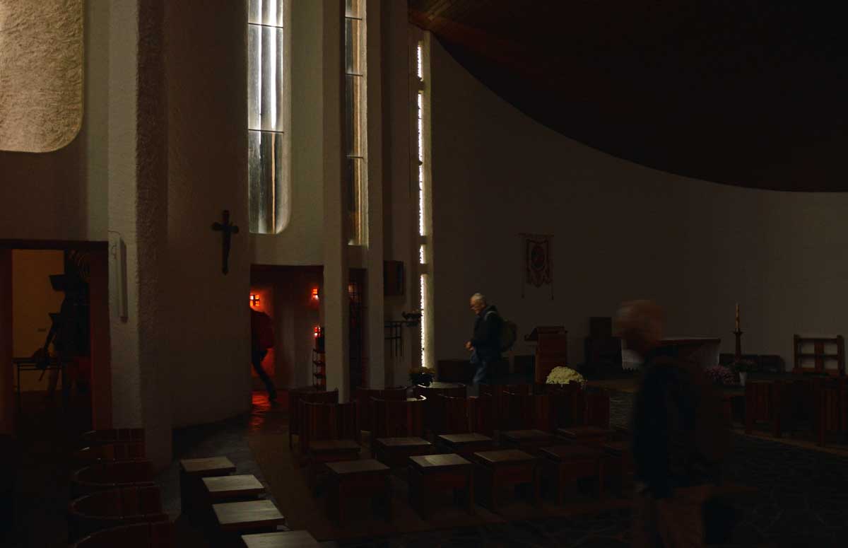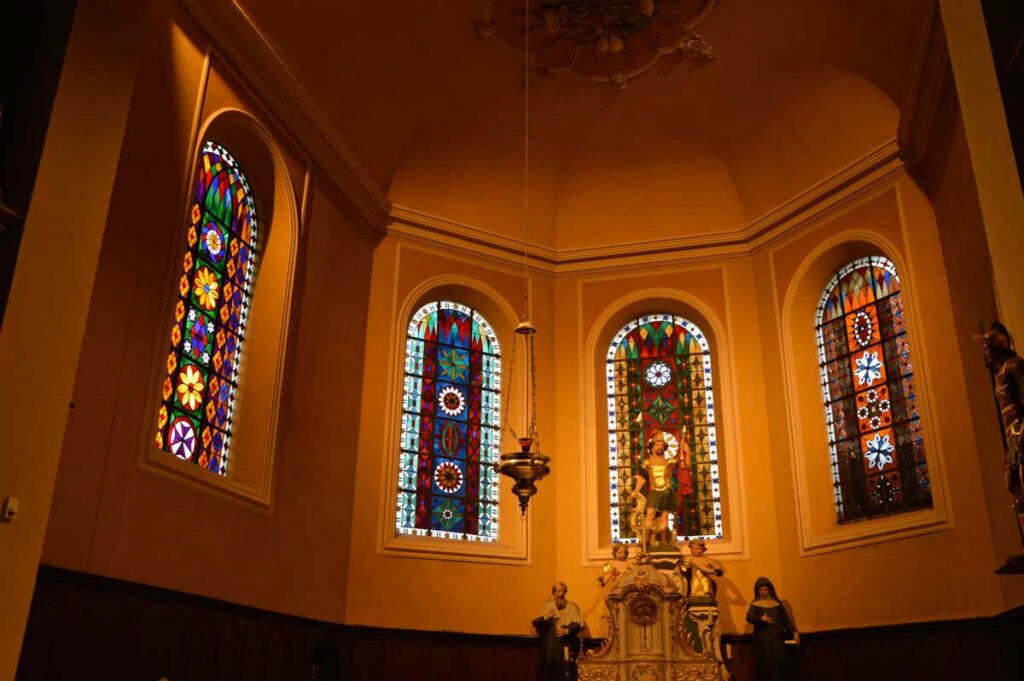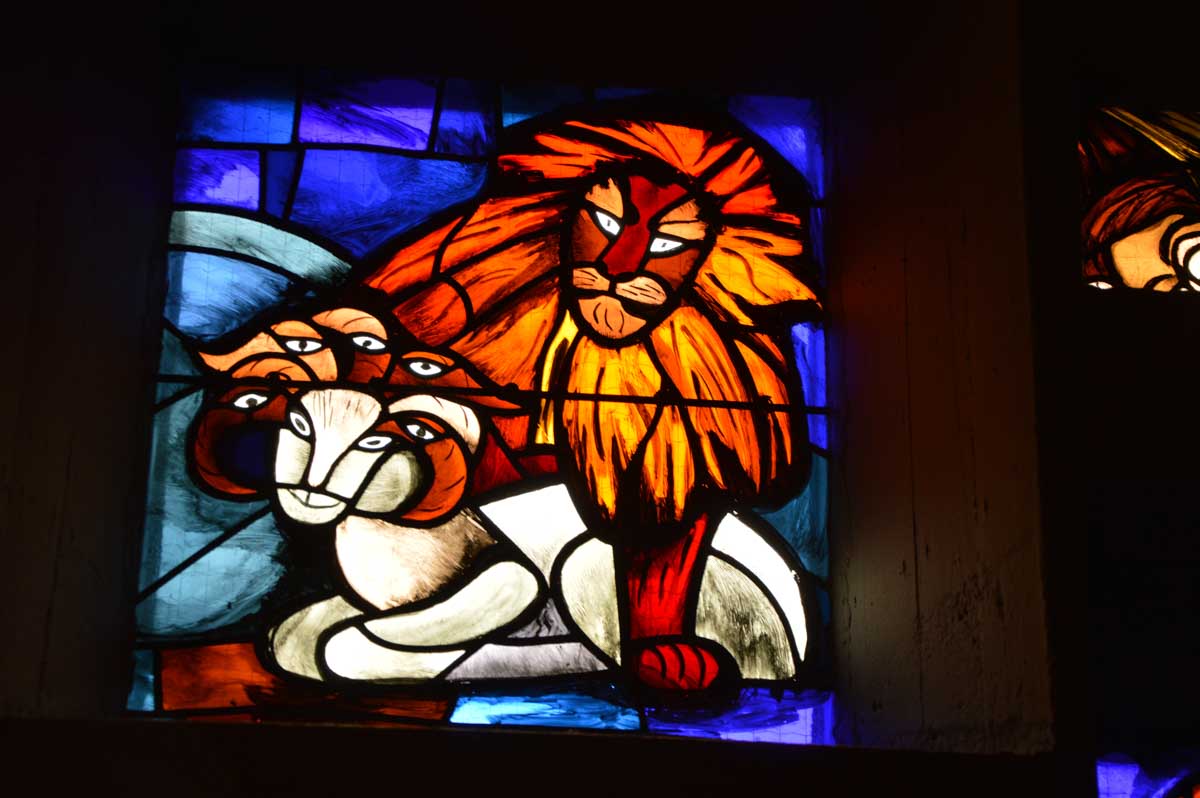 Nous clopinâmes au travers de la forêt donc automnale et entre deux petites rincées, jusqu’à la Rose Rose, l’église Sainte-Thérèse de Vasperviller. En béton, elle date de 1968 et c’est l’intérieur qui vaut le coup. D’abord parce qu’à ce moment-là, hop, une averse, et ensuite pour ses vitraux ! Y’a une des icônes du mal un peu particulière, cherche bien tu reconnaîtras tout de suite.