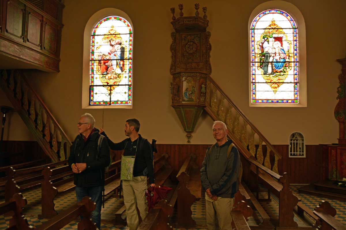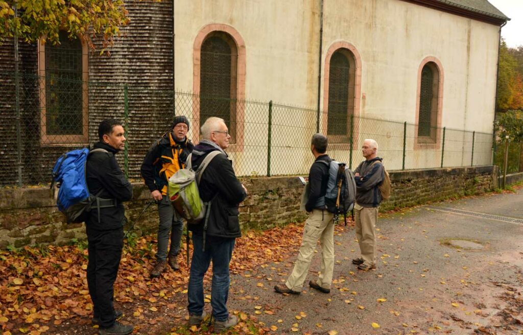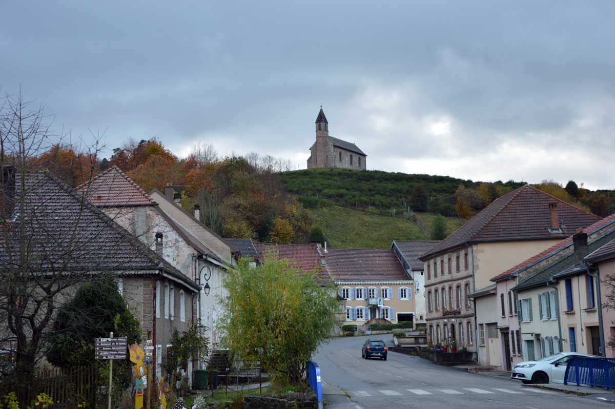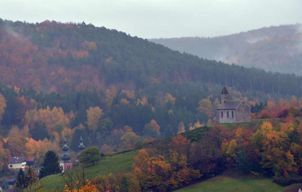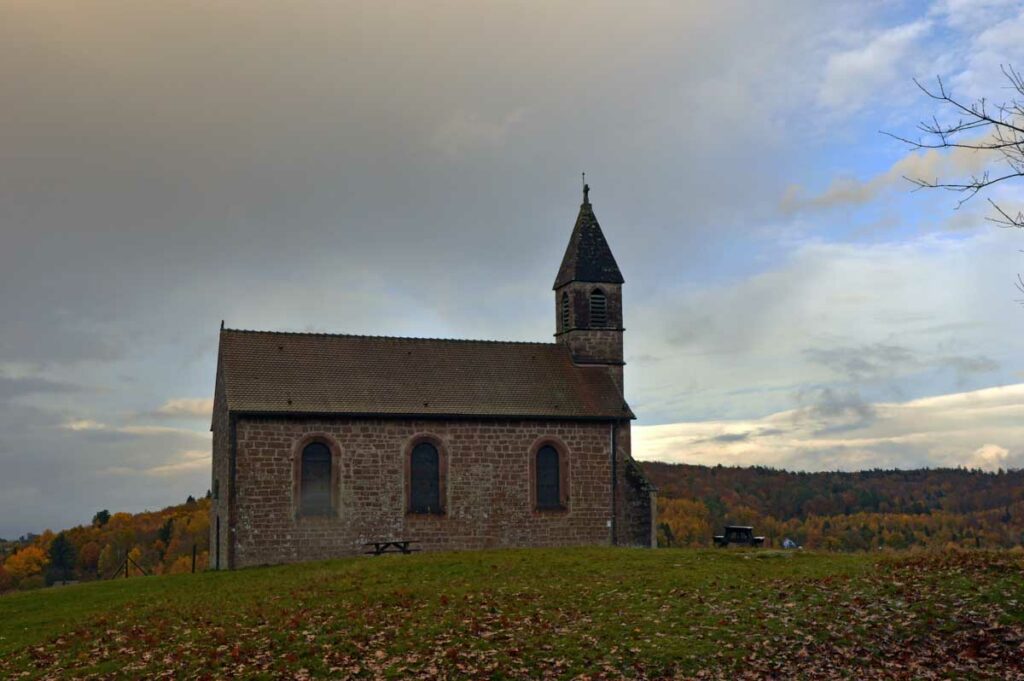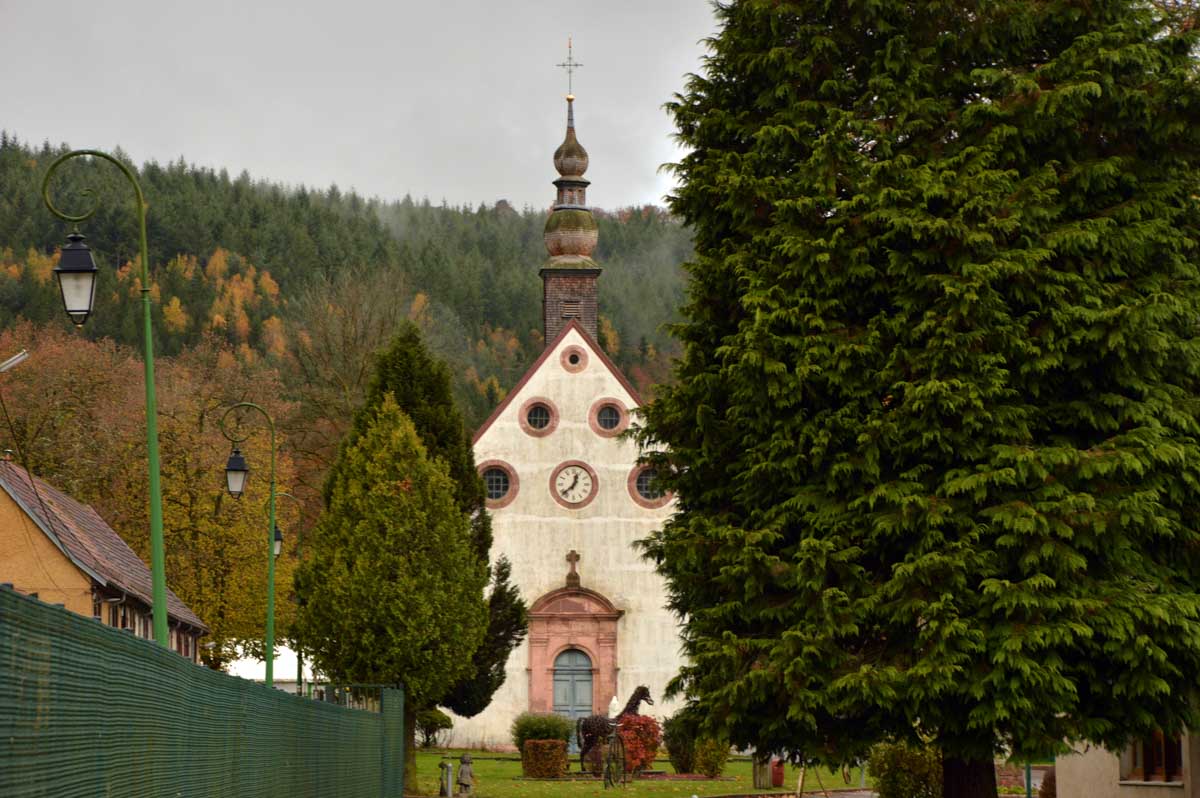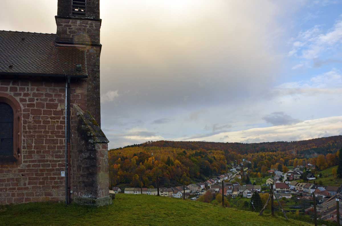 Normalement il y a sept roses à Saint-Quirin et ce n’est pas parce qu’on a vu que six roses que je vais en faire une jaunisse ! T’attends pas à des fleurs, ce sont des chapelles et des églises. La Rose Mauve se trouve trop loin pour notre parcours, alors nous commençâmes par la Rose de Cristal. Eh oui, l’église des Verriers à Lettenbach, avec un pique-nique à l’abri du crachin. Eh oui c’est l’automne !