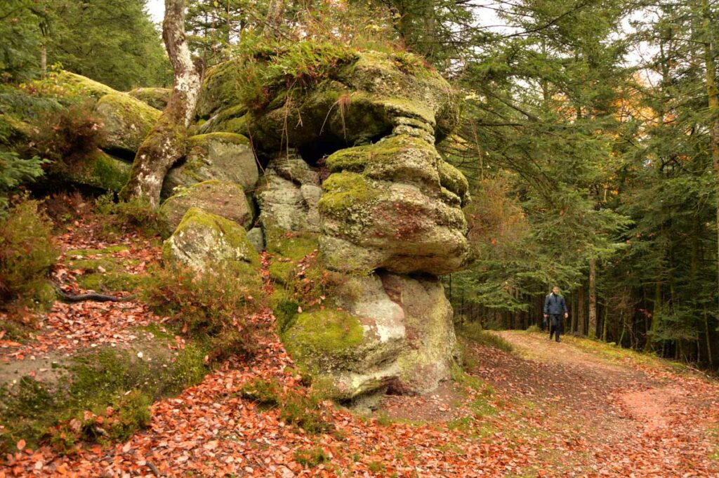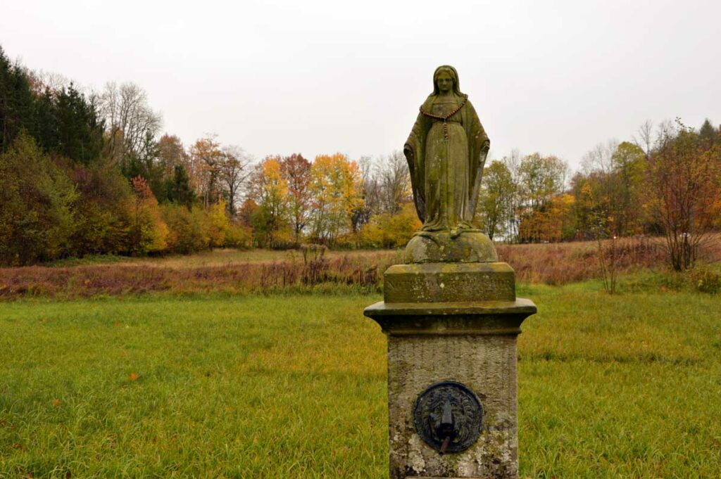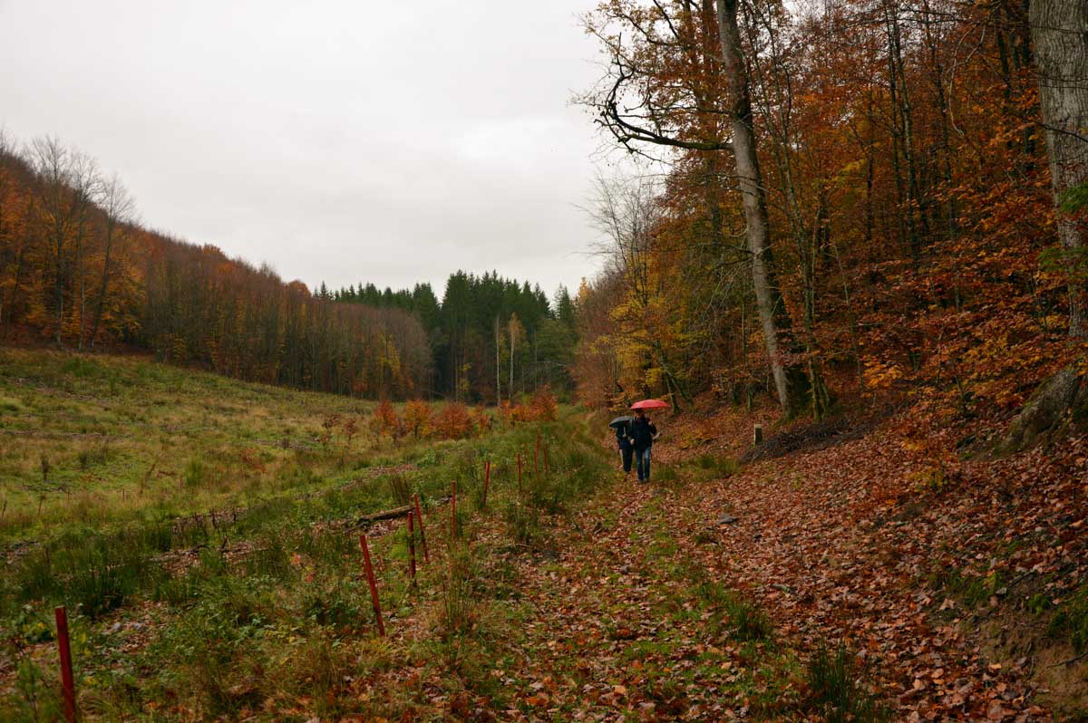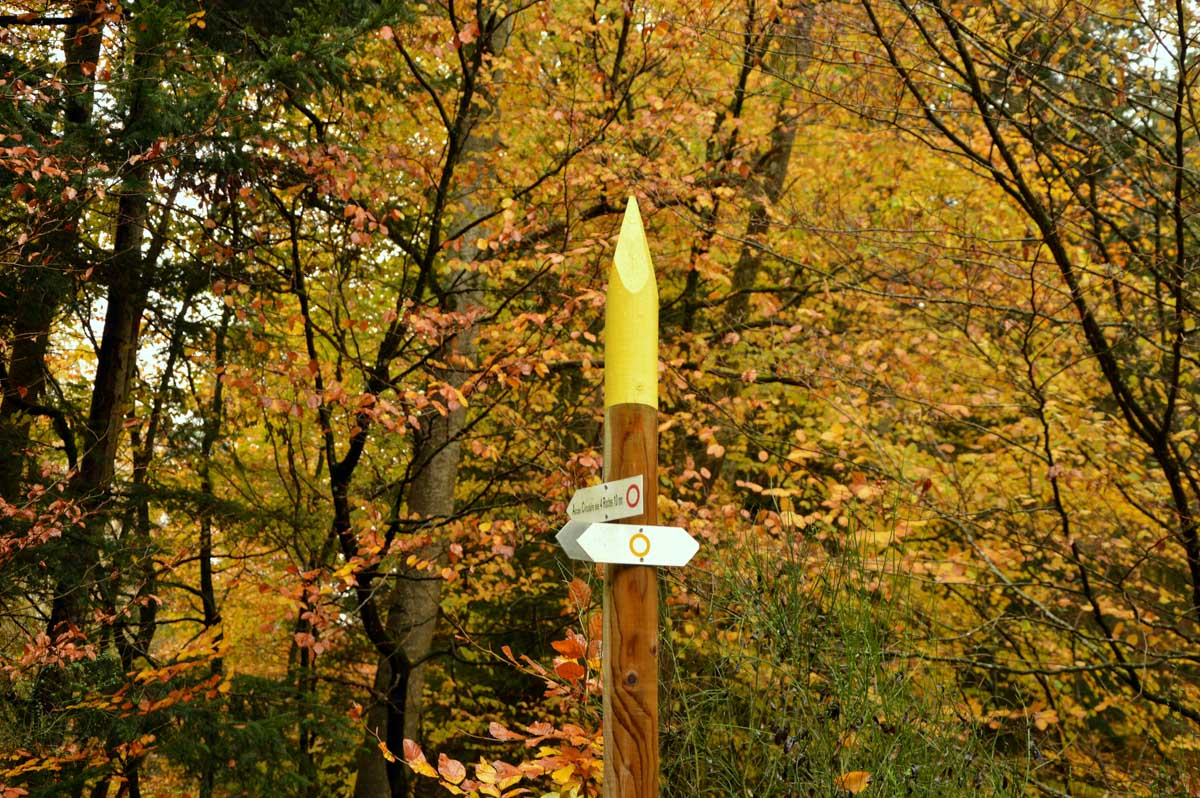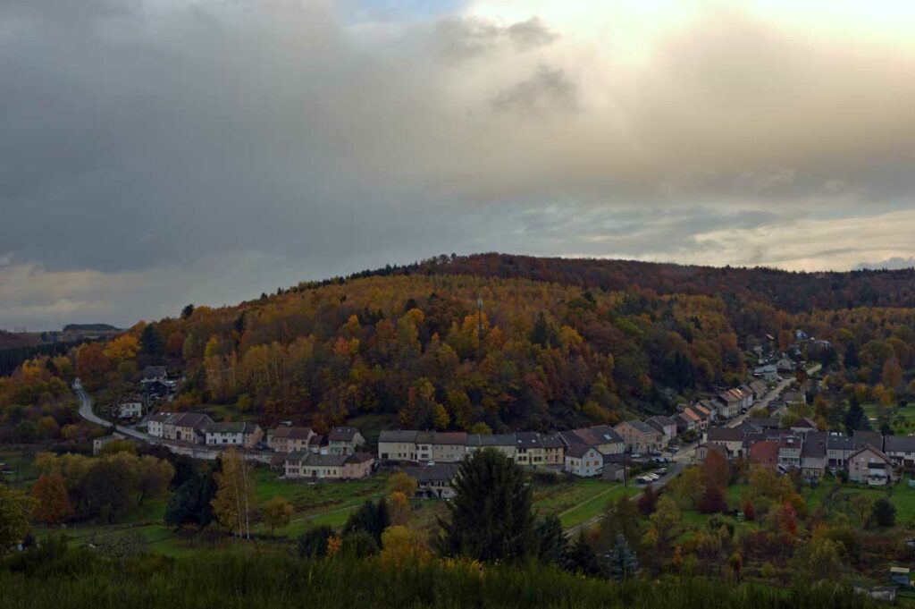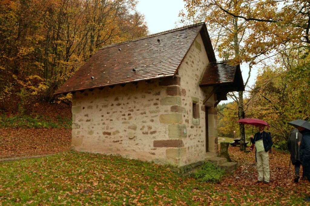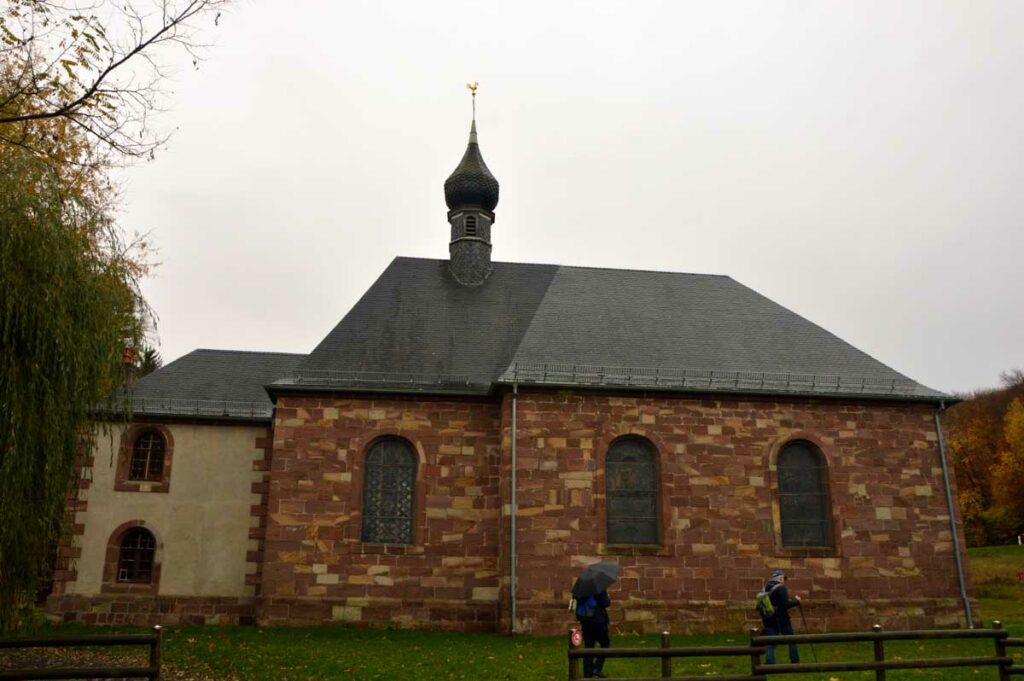 Normalement il y a sept roses à Saint-Quirin et ce n’est pas parce qu’on a vu que six roses que je vais en faire une jaunisse ! T’attends pas à des fleurs, ce sont des chapelles et des églises. La Rose Mauve se trouve trop loin pour notre parcours, alors nous commençâmes par la Rose de Cristal. Eh oui, l’église des Verriers à Lettenbach, avec un pique-nique à l’abri du crachin. Eh oui c’est l’automne !