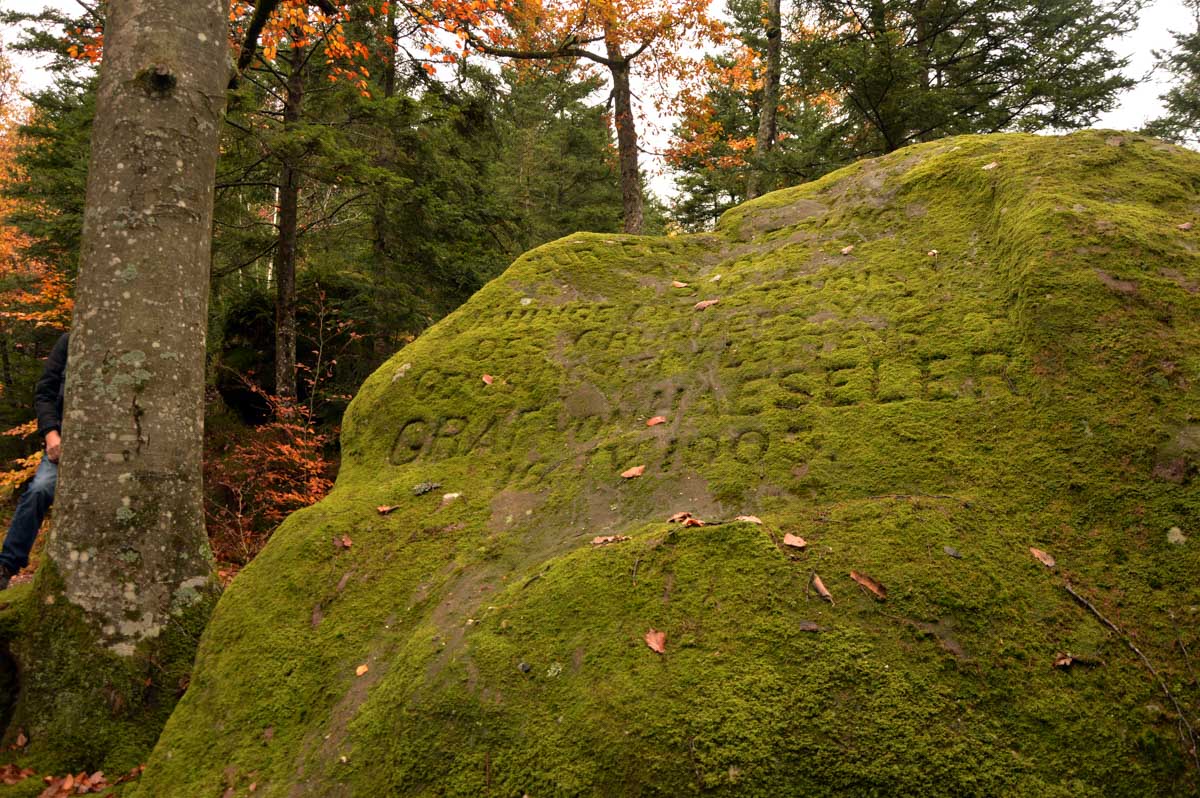 Donc c’était super mais moi, tous ces saints me laissent de glace alors je suis retournée au parking pour changer de pompes. Me suis dit qu’on aurait pu finir la journée autour d’un grand noir sans sucre, ou, rêvons, en trinquant avec un petit jaune même si c’était plus l’heure ? A moins de partir sur un rouge, un blanc sec… J’aurais bien improvisé des digestifs de toutes les couleurs, on les aurait appelés les Gentiane Mauve, Gentiane Grise, Gentiane Orange, Gen… Ah ben non, la pluie reprend alors traversée de la Ligne Bleue des Vosges dans les nuages gris et retour maison !