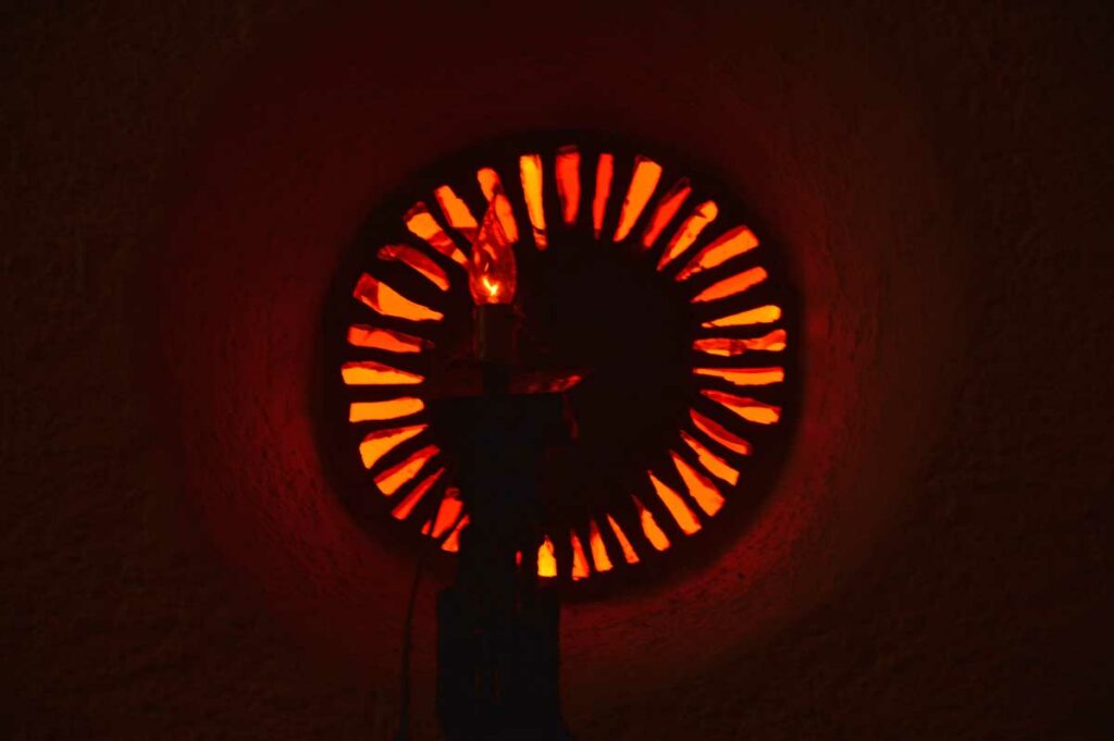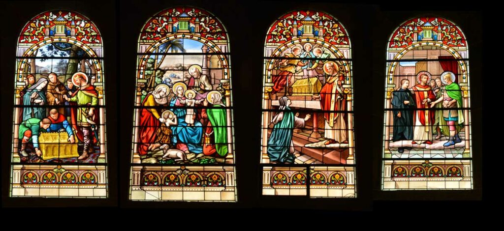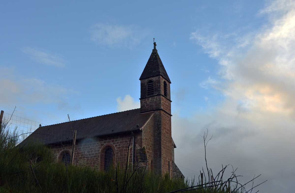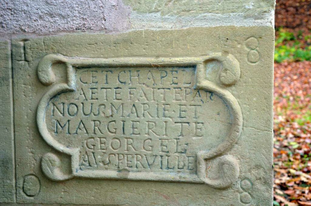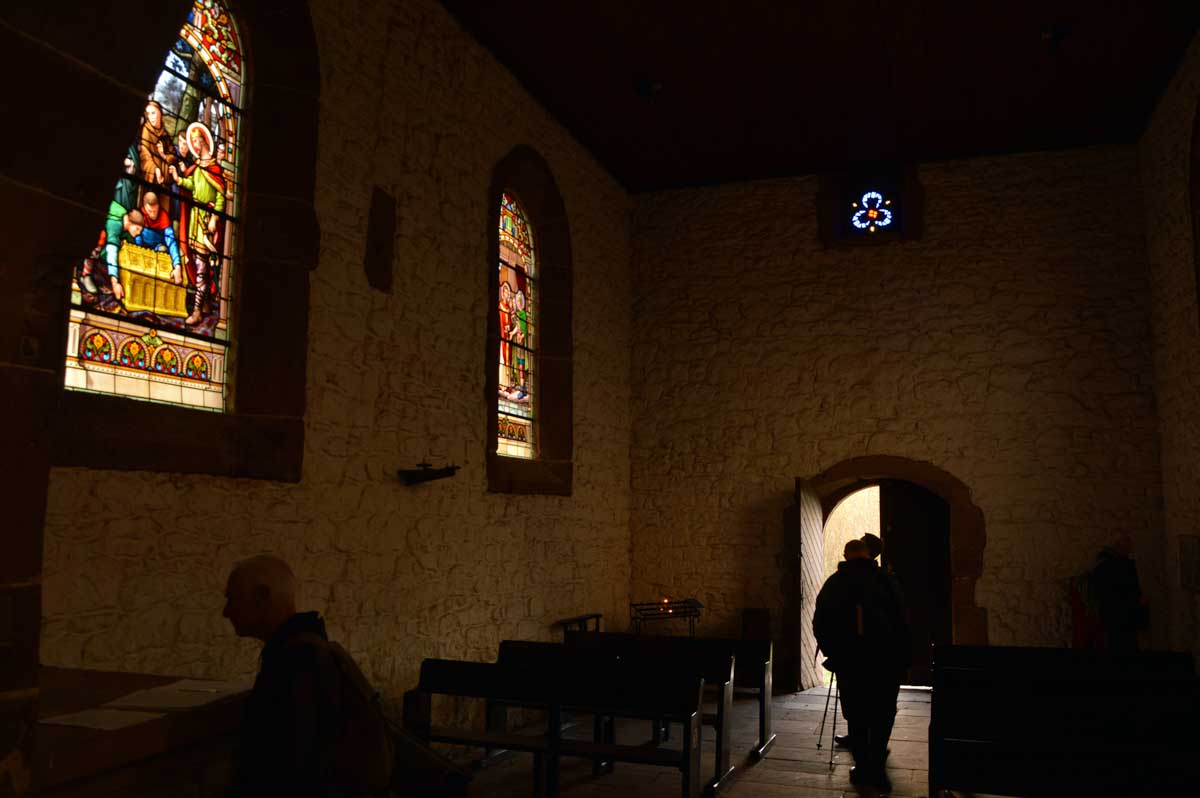 Et toujours à Vasperviller, voilà la Rose Blanche, la chapelle Sainte-Claire. Laquelle sainte est appelée au secours pour les maladies des yeux, d’où sans doute l’expression « y voir clair ». Avec la simplicité de son architecture, on n’en prend pas plein la vue et d’ailleurs on la perd rapidement de vue en remontant en forêt jusqu’à la Rose Bleue, Notre-Dame de l’Hor. Drôle d’assemblage de murs du 15ème et 18ème siècle et une restauration à la fin du 20ème. Avec ses chouettes vitraux, moi je trouve que sur le parcours, c’est la plus belle pour aller prier.