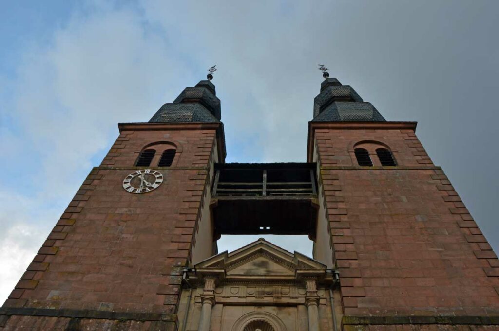 Et pour finir en métamorphose, je te présente la… Non attends, c’est pas le bon. Ah non en effet. Alors donc, pour finir en apothéose, je te présente la Rose d’Or, l’église priorale de Saint-Quirin, sorte de bric-à-brac architectural avec des clochers à bulbes une passerelle, un milieu de façade qui va pas avec les tours, enfin moi j’aurais construit ça, on m’aurait critiquée mais je suis pas architecte. Bien sûr, ça reste classe, dépassant dans la forêt, avec en plus un orgue Silbermann du 18ème siècle !