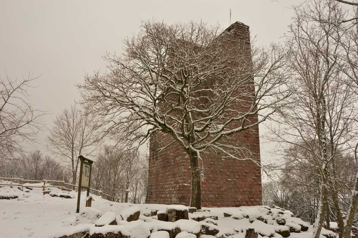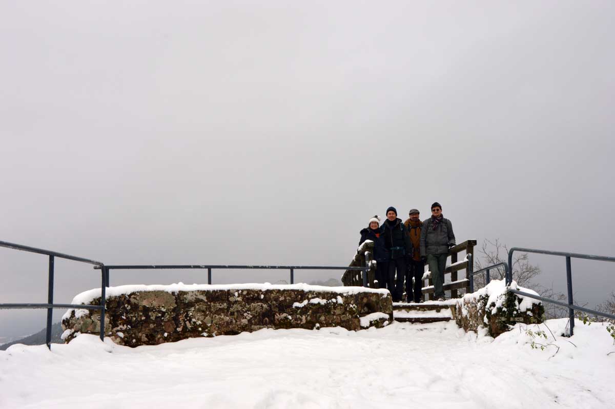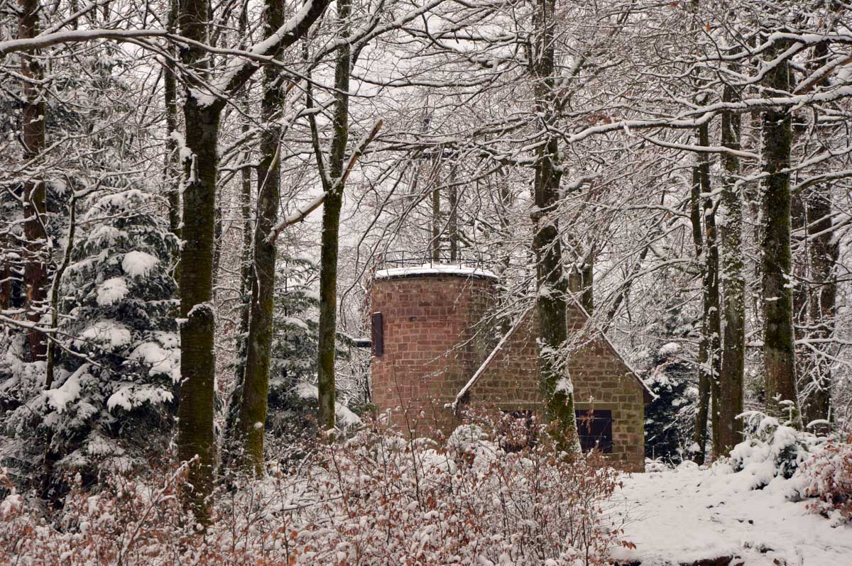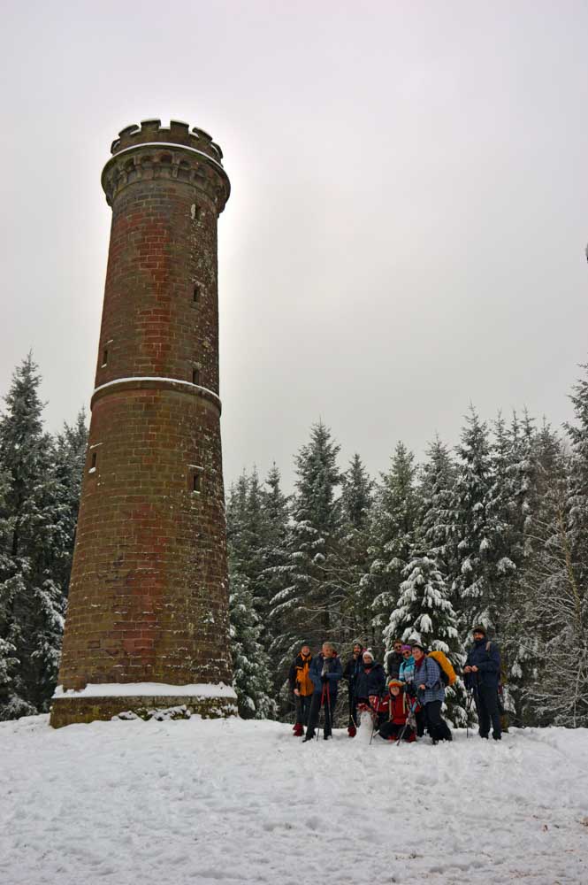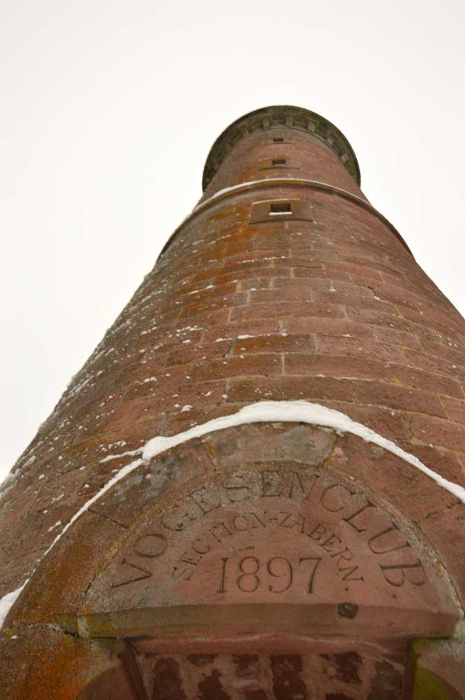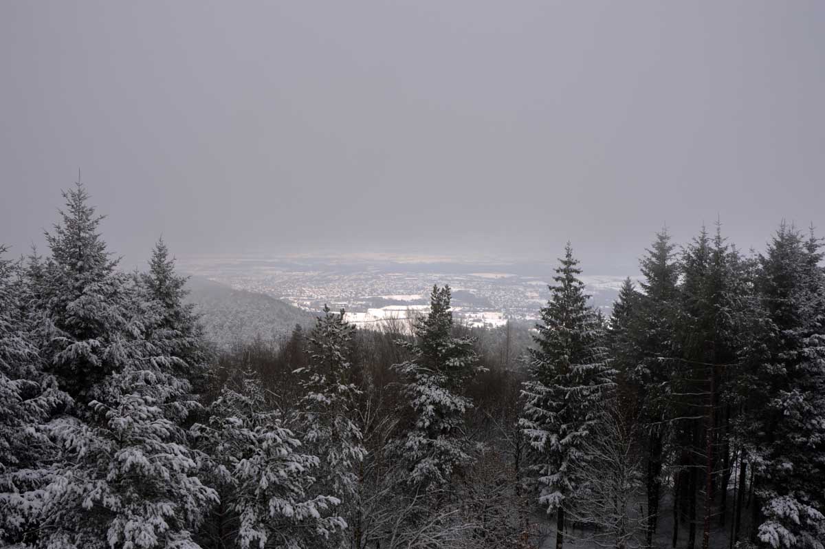 Top départ ensuite pour le point culminant de notre randonnée : la Tour du Brotsch, édifiée en 1897 par le Club Vosgien à 530 mètres d’altitude au sommet du… Brotschberg. Que c’est original. On en a profi… enfin nous en profitâmes pour admirer la vue à 350° (je n’ai pas vu les dix autres à cause du vertige) sur le massif et la plaine enneigés.