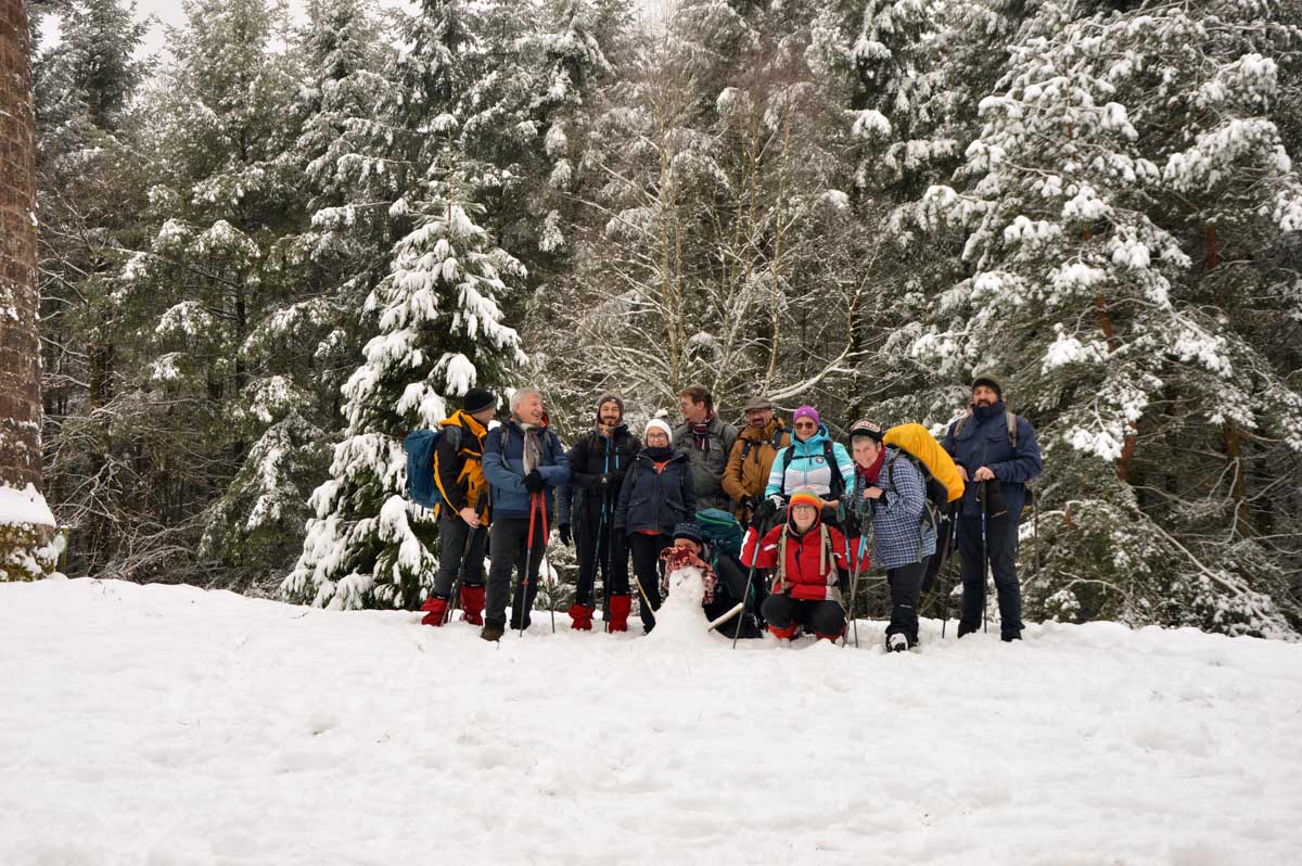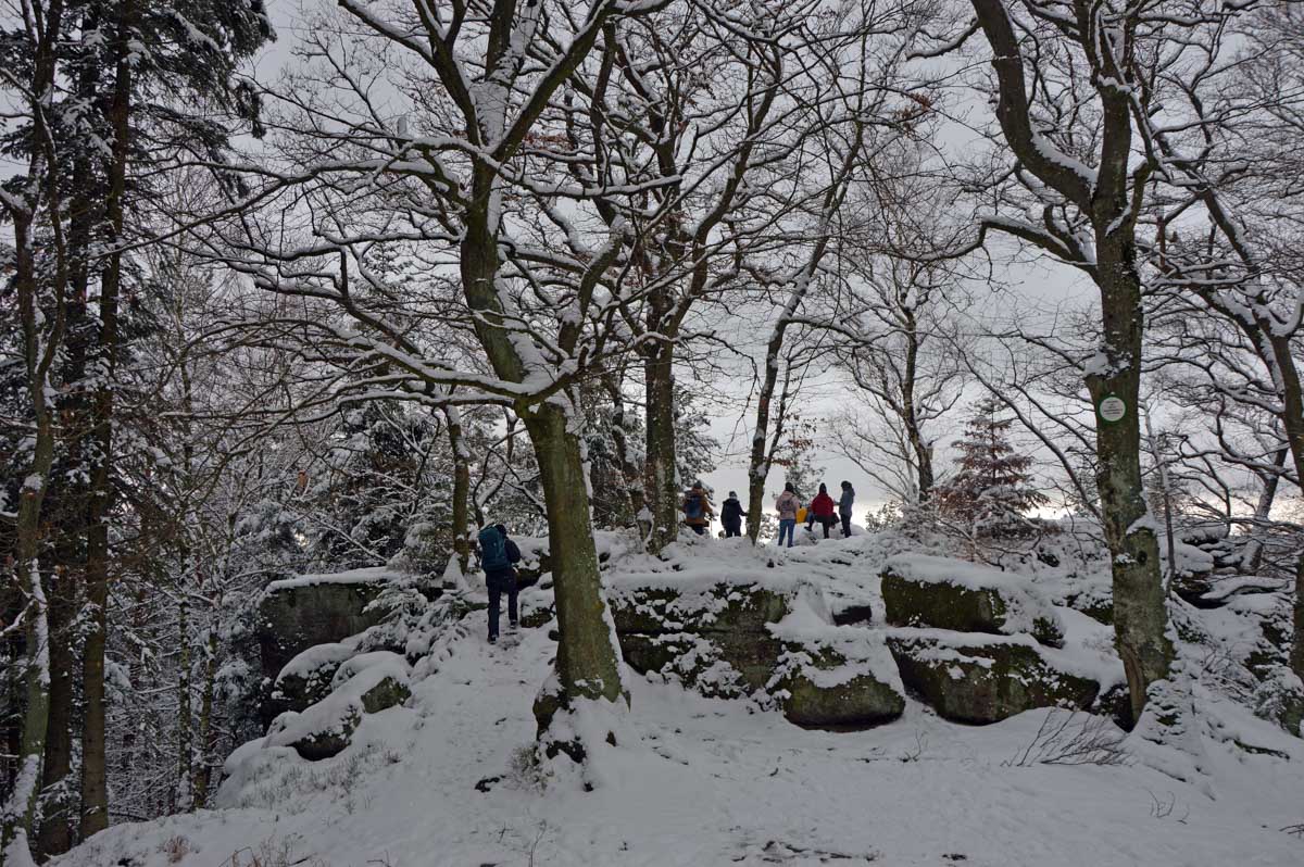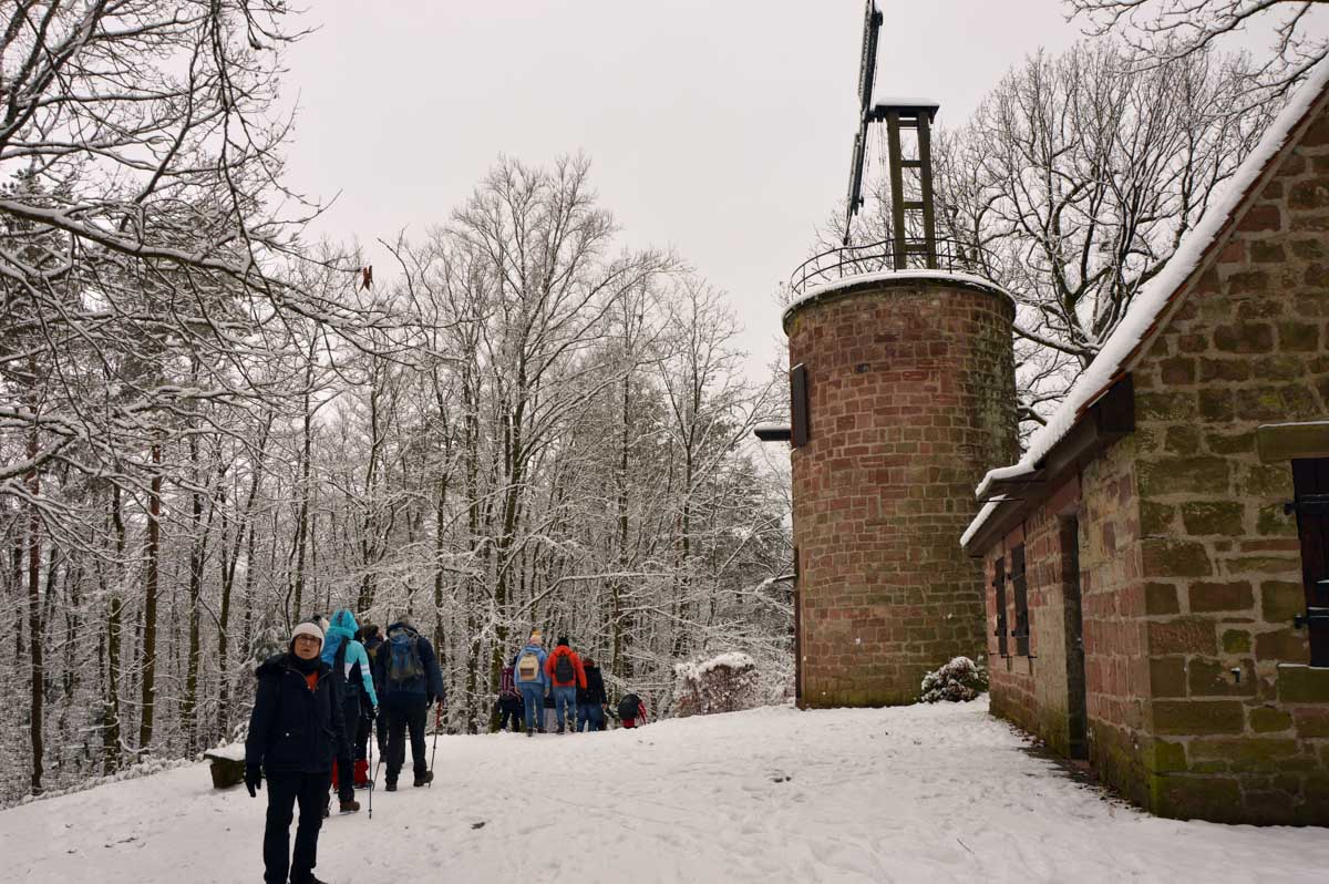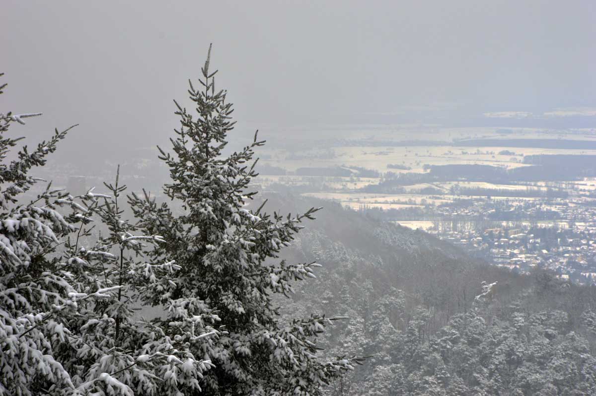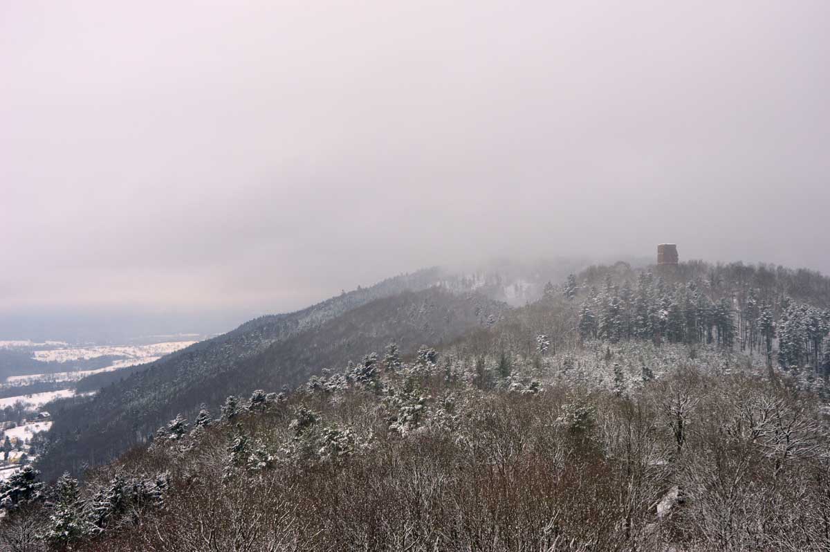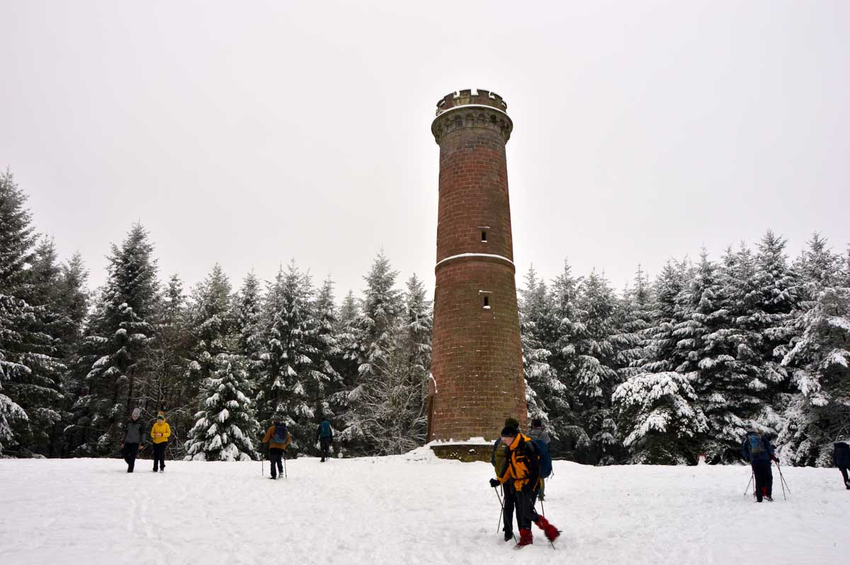 Top départ ensuite pour le point culminant de notre randonnée : la Tour du Brotsch, édifiée en 1897 par le Club Vosgien à 530 mètres d’altitude au sommet du… Brotschberg. Que c’est original. On en a profi… enfin nous en profitâmes pour admirer la vue à 350° (je n’ai pas vu les dix autres à cause du vertige) sur le massif et la plaine enneigés.