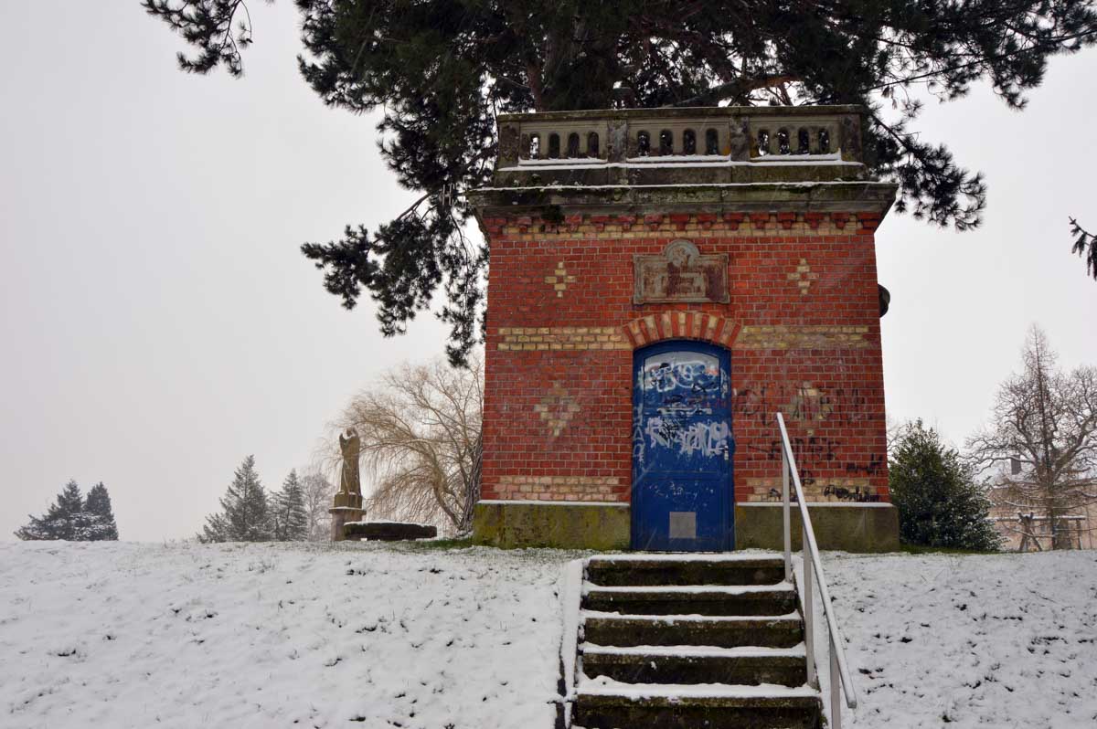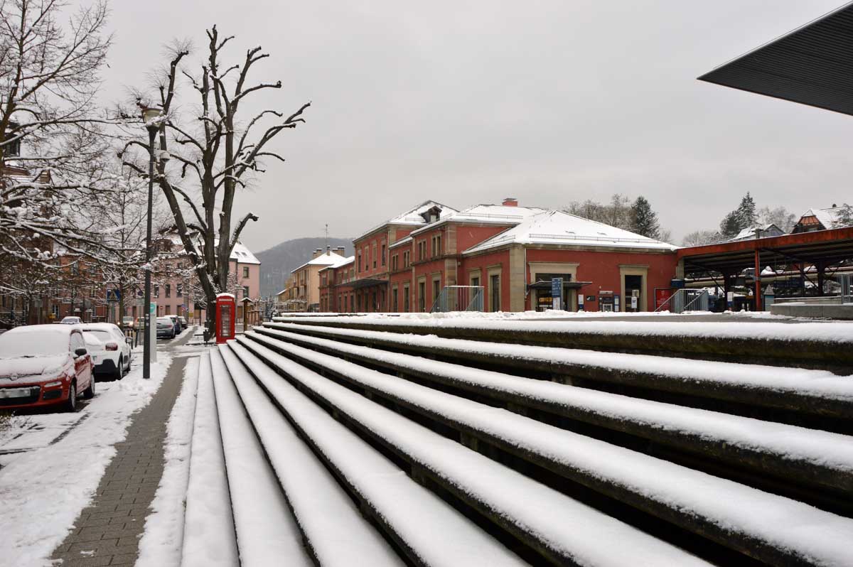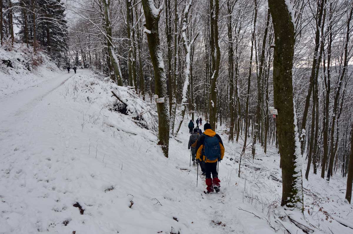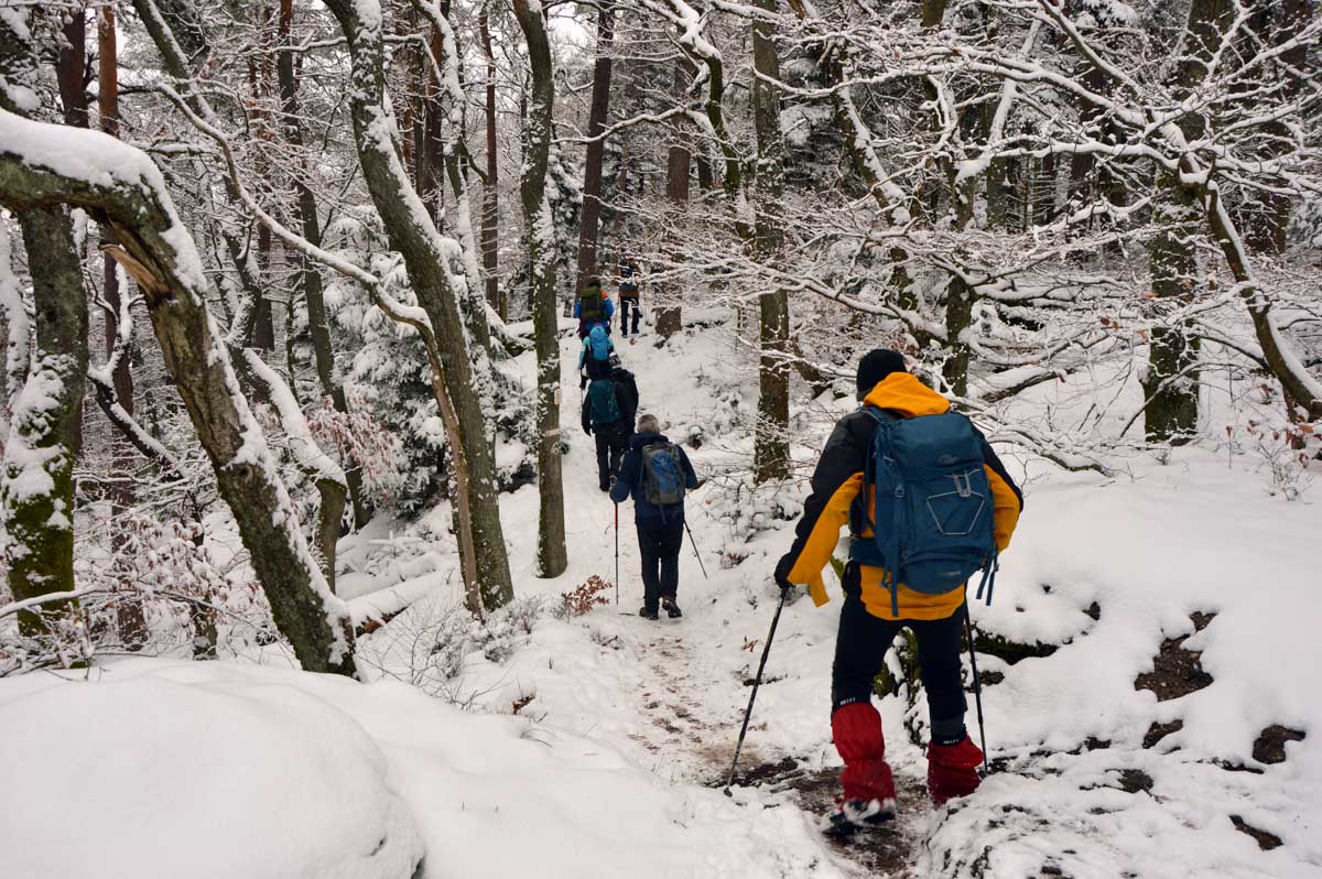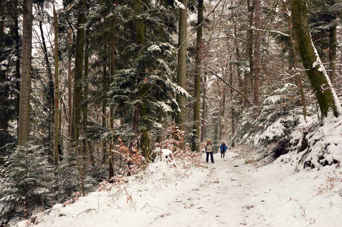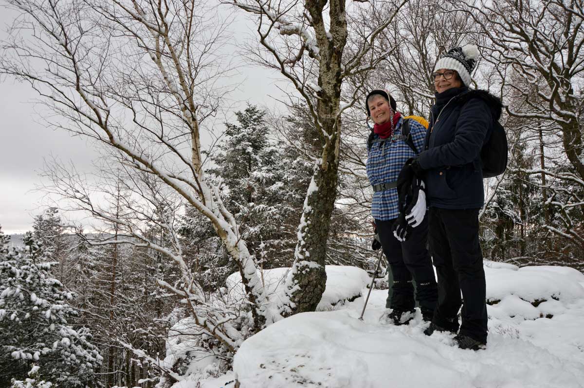 Top départ ensuite pour le point culminant de notre randonnée : la Tour du Brotsch, édifiée en 1897 par le Club Vosgien à 530 mètres d’altitude au sommet du… Brotschberg. Que c’est original. On en a profi… enfin nous en profitâmes pour admirer la vue à 350° (je n’ai pas vu les dix autres à cause du vertige) sur le massif et la plaine enneigés.