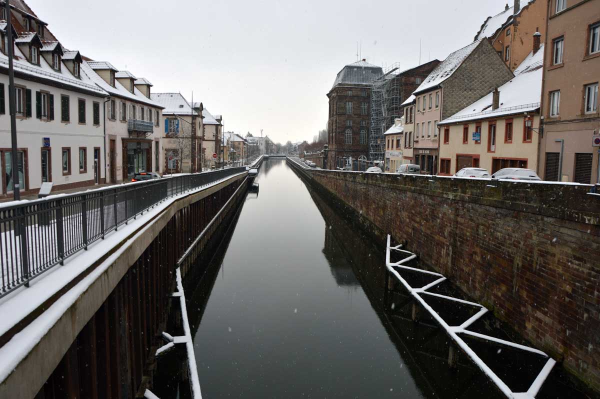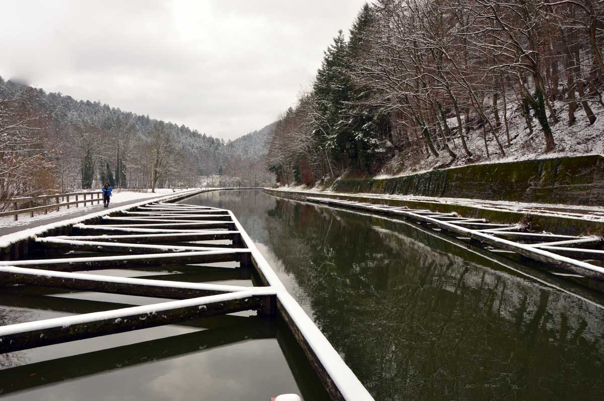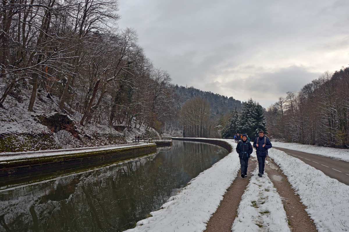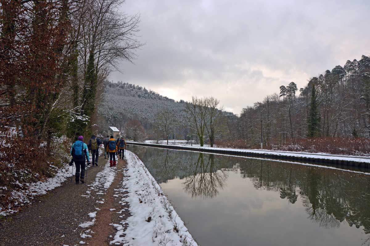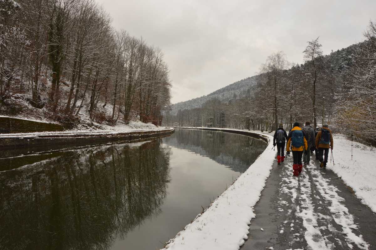 De quoi je ne vous ai pas parlé ? Ah oui, de la grotte. Celle du Brotsch. Sous le rocher du Brotsch. Dans une ambiance de Brotsch avec une météo de Brotsch. La grotte est hantée par le fantôme d’une aubergiste de Saint-Gall mais comme il n’y avait pas de vent, on n’a pas… enfin nous n’entendîmes pas ses cris. Et enfin, on a long… nous pûmes longer le canal de la Marne au Rhin, qui donc relie la Marne au Rhin (je précise pour ceux qui poseraient la question), depuis le milieu du 19ème siècle. Drôle de lumière hivernale d’ailleurs, par ici. A ce propos justement, je vous laisse, je vais me faire un stock de souvenirs neigeux et froids, mais merveilleux, pour les ressortir au mois d’août !