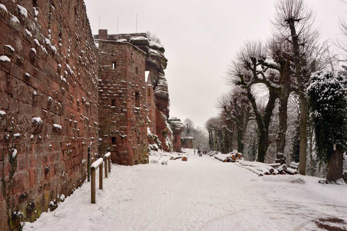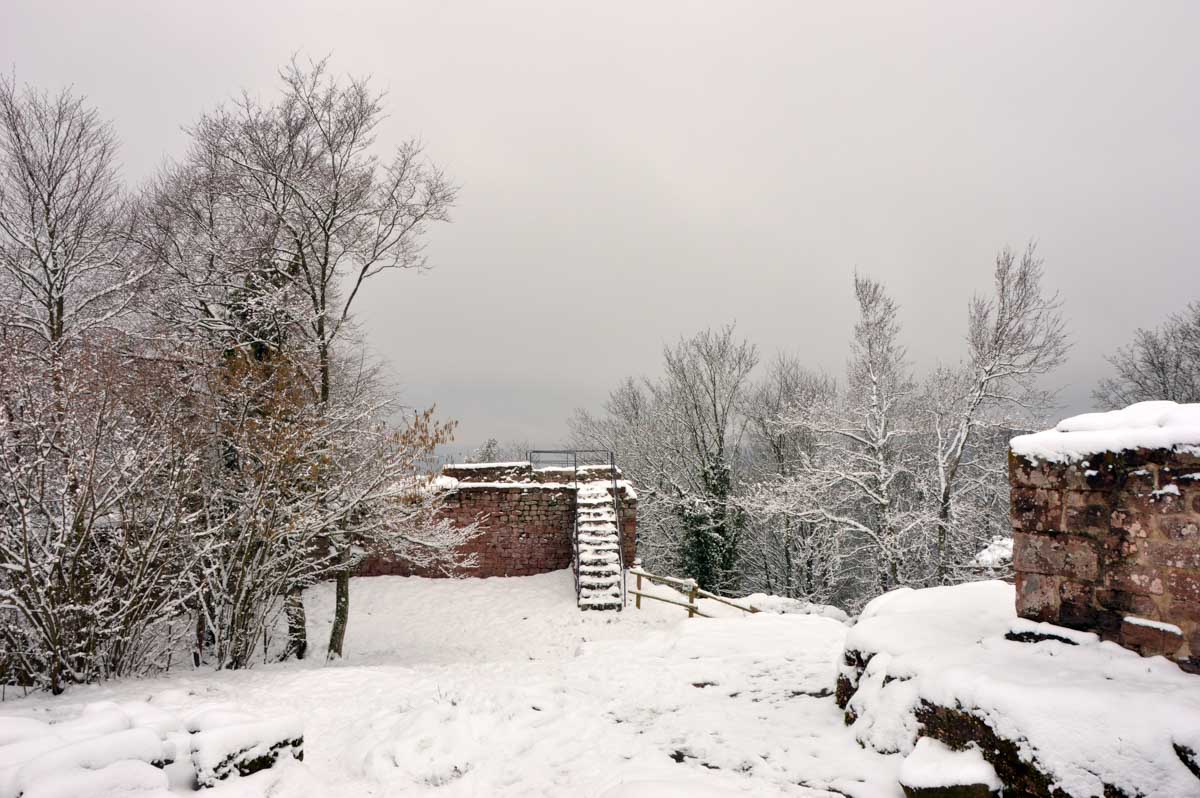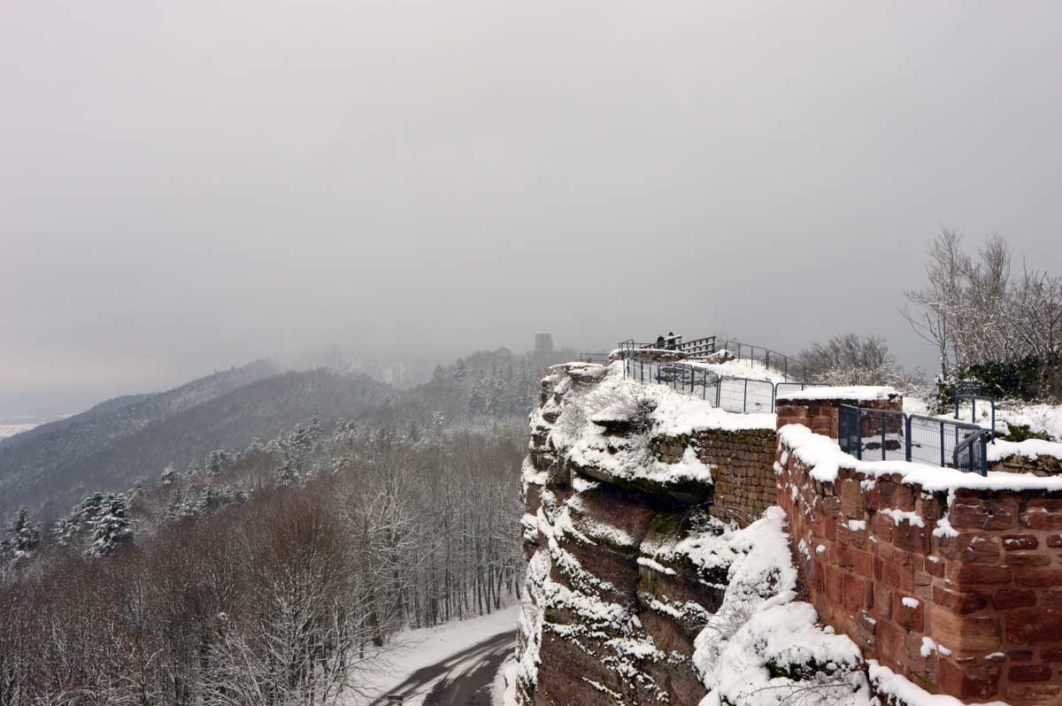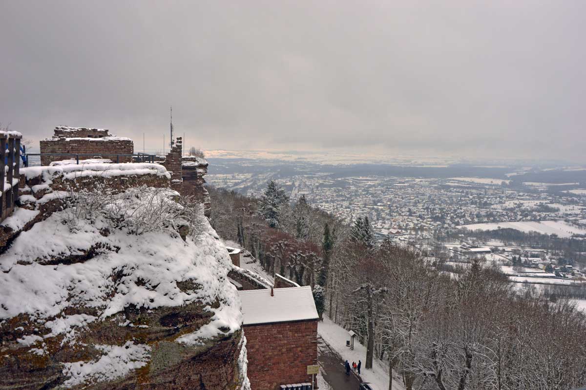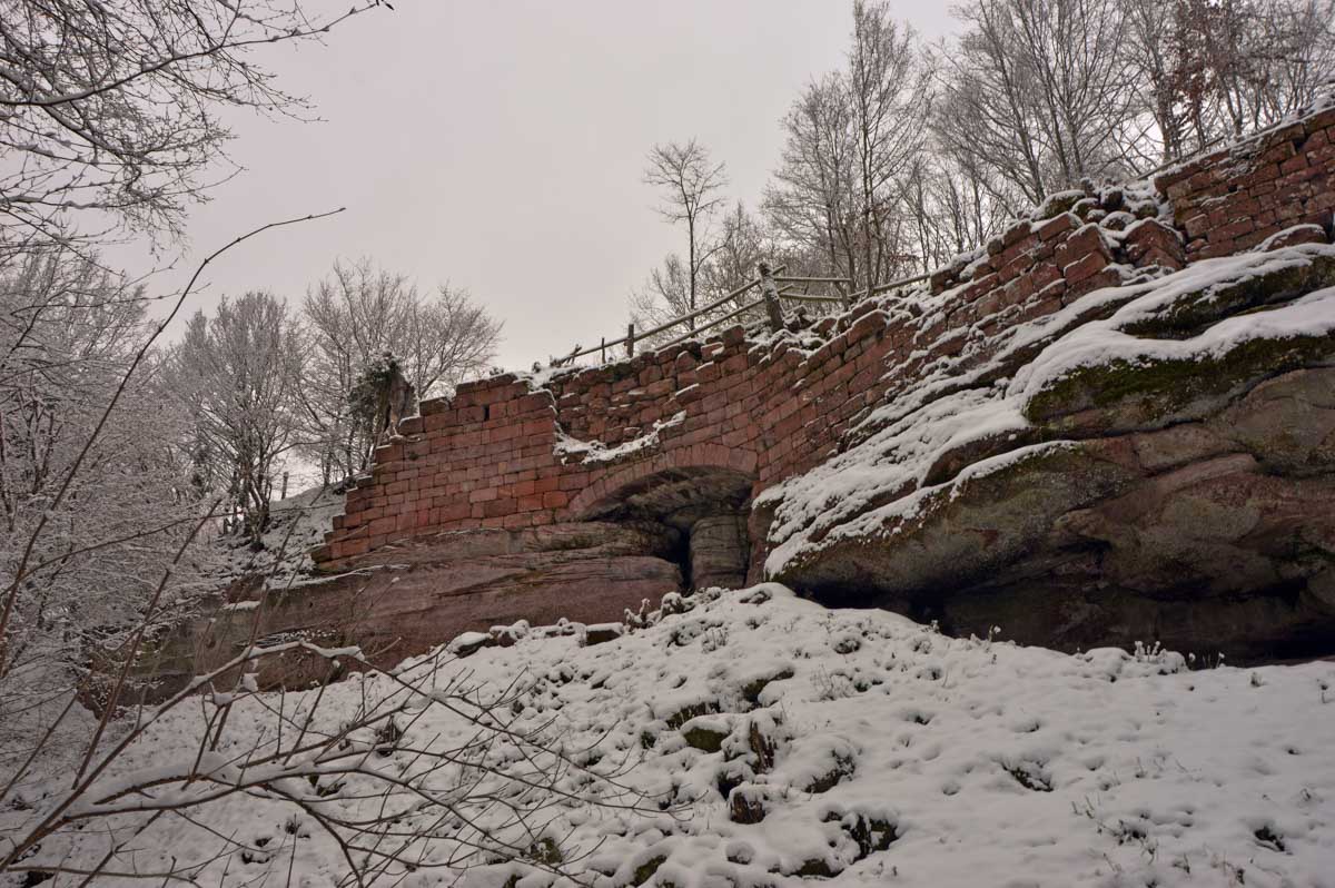 Attention, je vais faire dans la grande littérature : et le voici surgi de la nuit des temps tel un vaisseau de pierre envoyé par un passé mystérieux. C’est le Haut-Barr qui développe sa majesté aux contours révélés par le ciel blanc et la neige. Ouah ! M’est venue toute seule celle-là ! Imposant ou pas, on est mont… nous grimpâmes au sommet de l’édifice, franchissant le pont du diable où je faillis défaillir, aux prises avec le vertige. La vue est imprenable sur la plaine, sur le village de Haegen et sur le Grand Geroldseck. On en parlera plus tard, de celui-là.