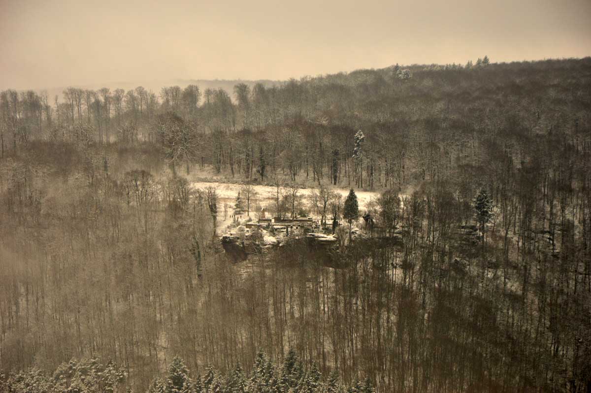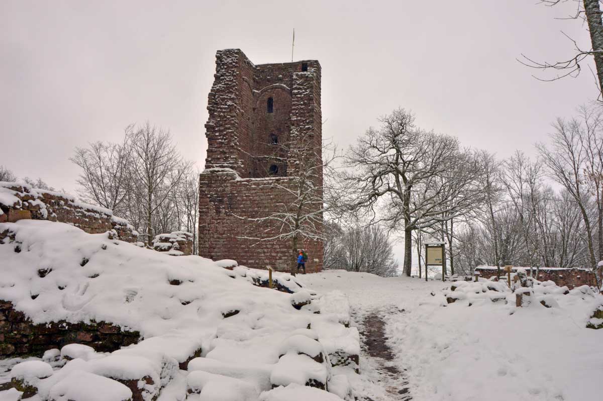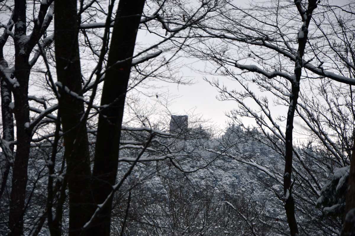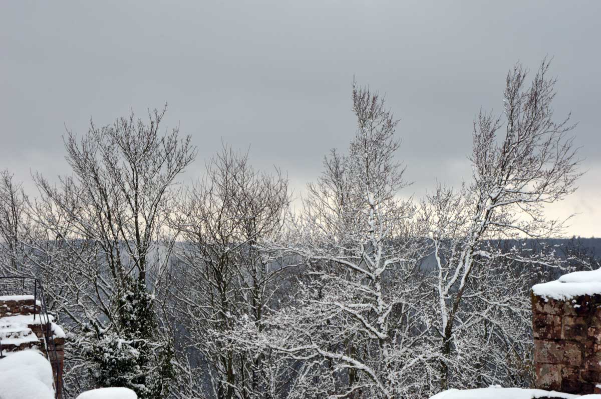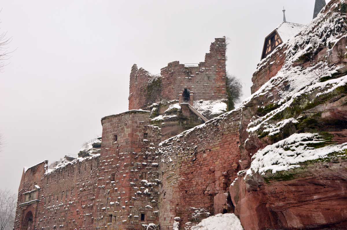 Attention, je vais faire dans la grande littérature : et le voici surgi de la nuit des temps tel un vaisseau de pierre envoyé par un passé mystérieux. C’est le Haut-Barr qui développe sa majesté aux contours révélés par le ciel blanc et la neige. Ouah ! M’est venue toute seule celle-là ! Imposant ou pas, on est mont… nous grimpâmes au sommet de l’édifice, franchissant le pont du diable où je faillis défaillir, aux prises avec le vertige. La vue est imprenable sur la plaine, sur le village de Haegen et sur le Grand Geroldseck. On en parlera plus tard, de celui-là.