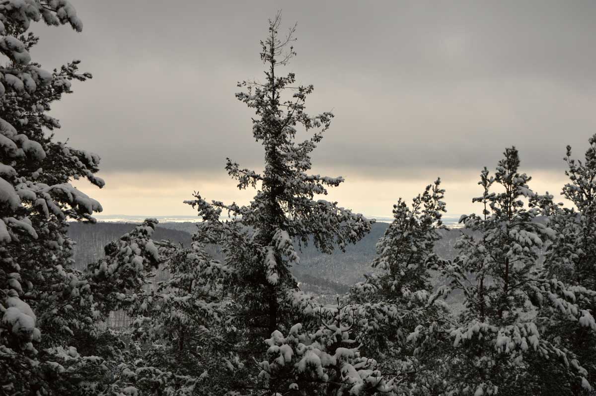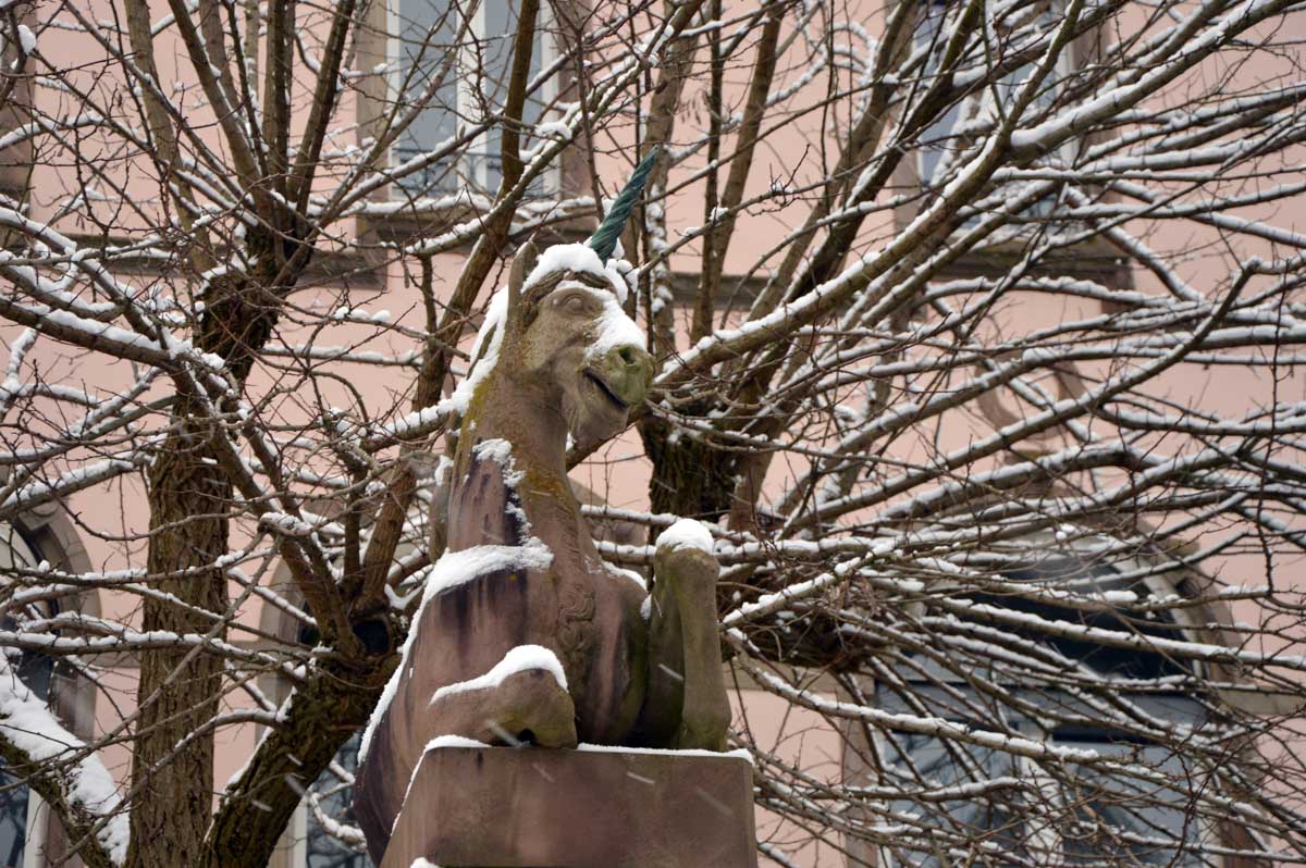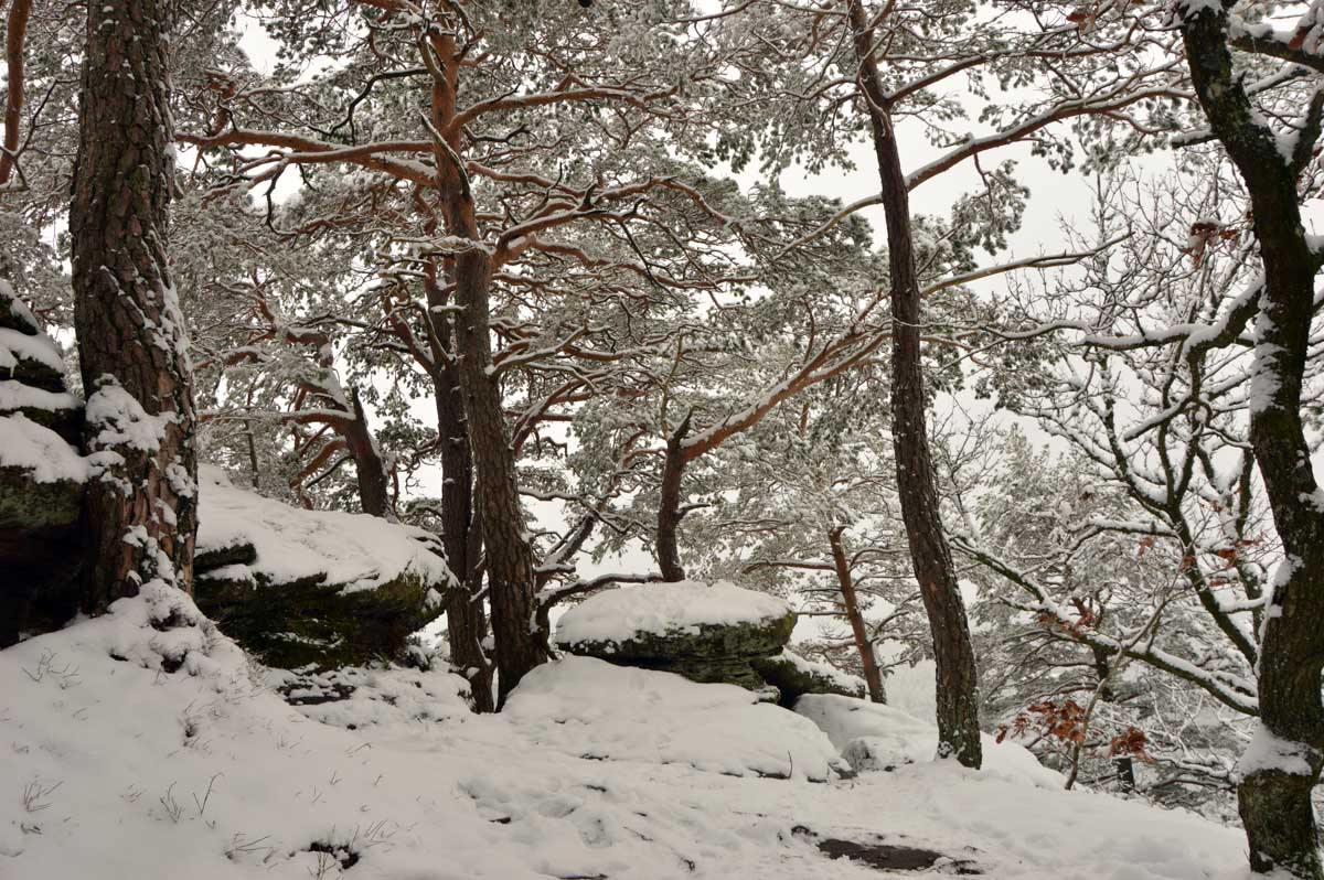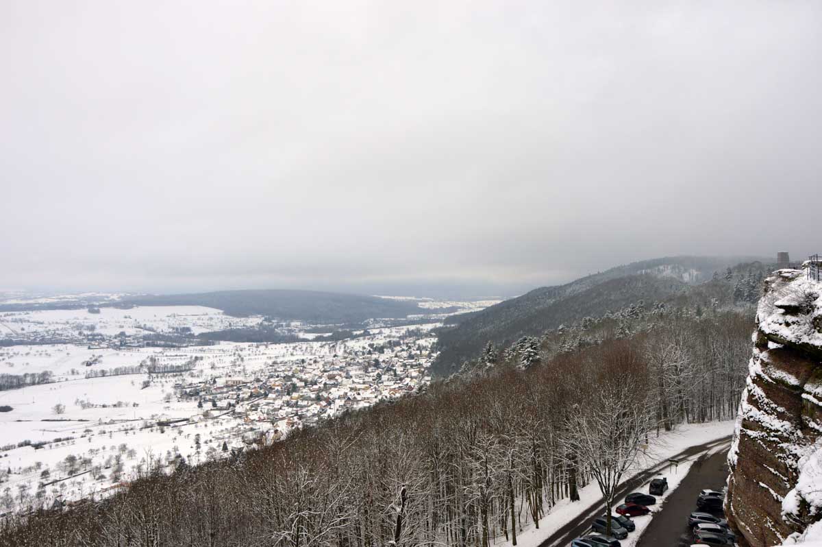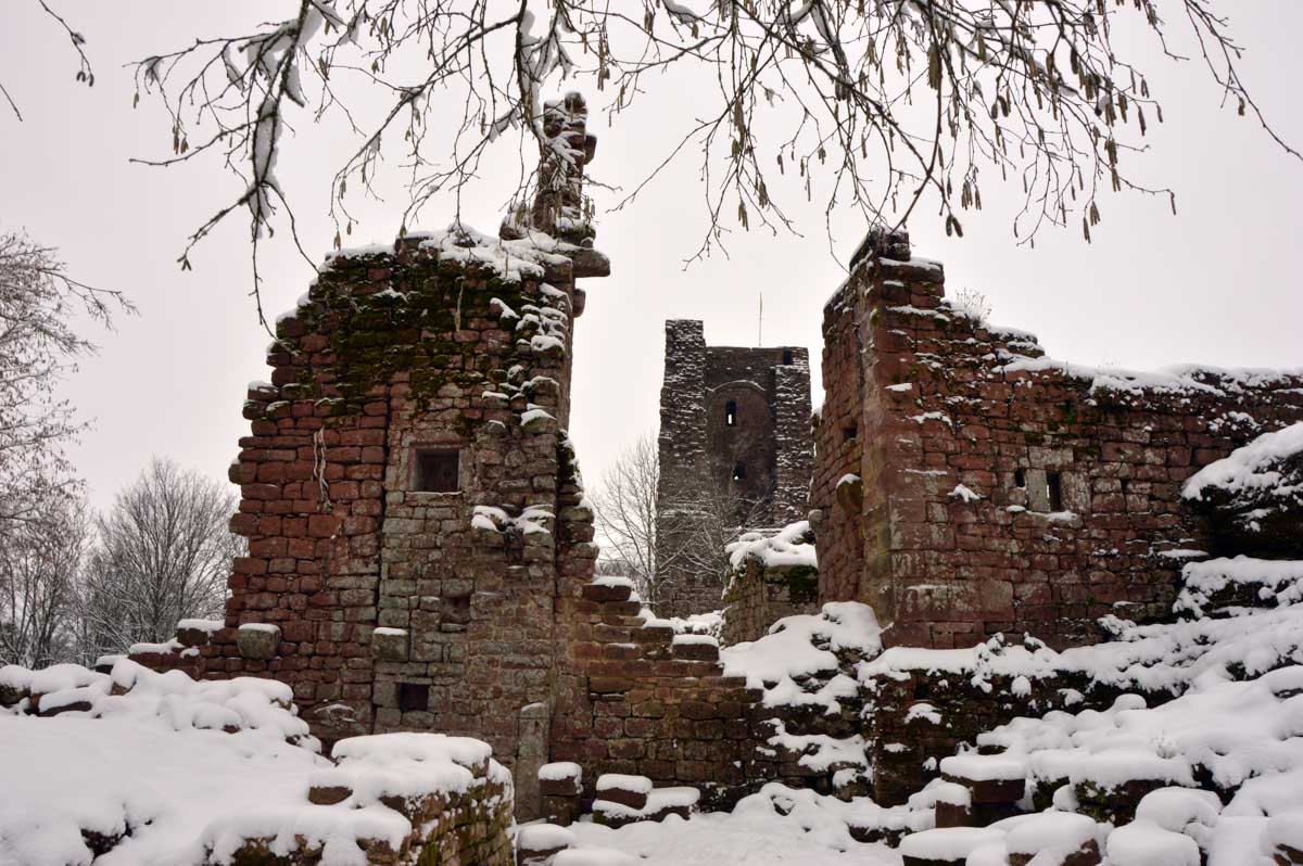 Attention, je vais faire dans la grande littérature : et le voici surgi de la nuit des temps tel un vaisseau de pierre envoyé par un passé mystérieux. C’est le Haut-Barr qui développe sa majesté aux contours révélés par le ciel blanc et la neige. Ouah ! M’est venue toute seule celle-là ! Imposant ou pas, on est mont… nous grimpâmes au sommet de l’édifice, franchissant le pont du diable où je faillis défaillir, aux prises avec le vertige. La vue est imprenable sur la plaine, sur le village de Haegen et sur le Grand Geroldseck. On en parlera plus tard, de celui-là.