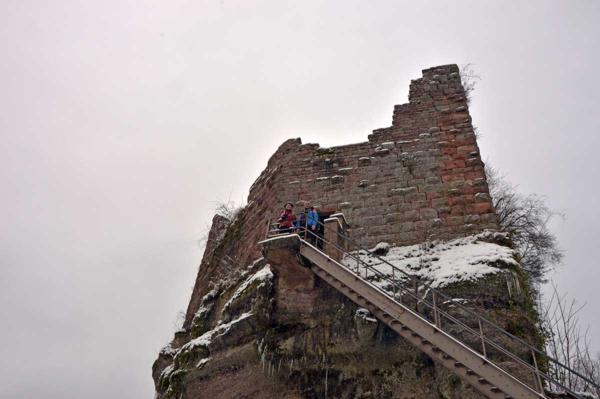 Puis donc, on arrive dans l’un des plus vieux châteaux-forts des Vosges, érigé sans doute à partir de 1100. Classé aux Monuments Historiques dès 1898 c’est le ? Le ? Ben faut suivre ! Le Grand-Geroldseck ! Où un abri nous a permis d’organiser la pause déjeuner.