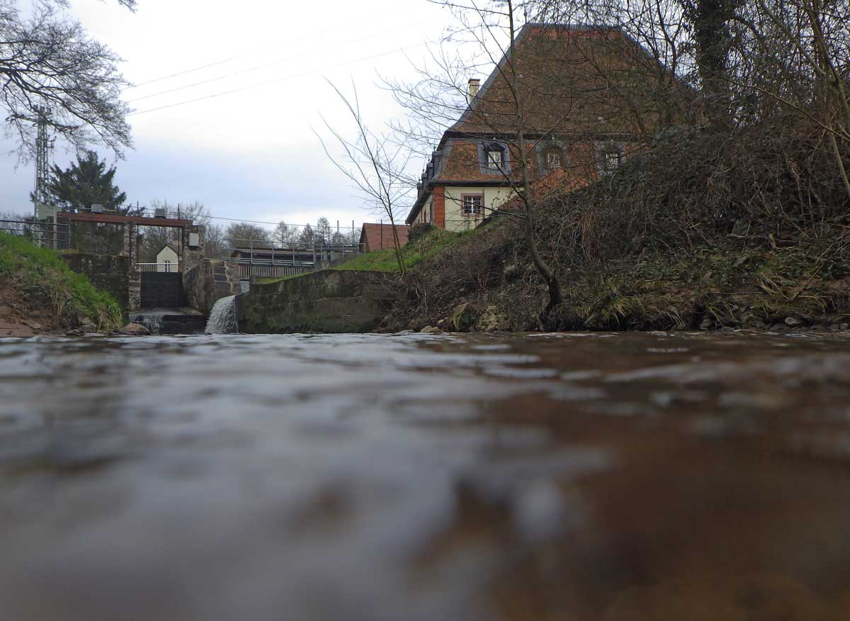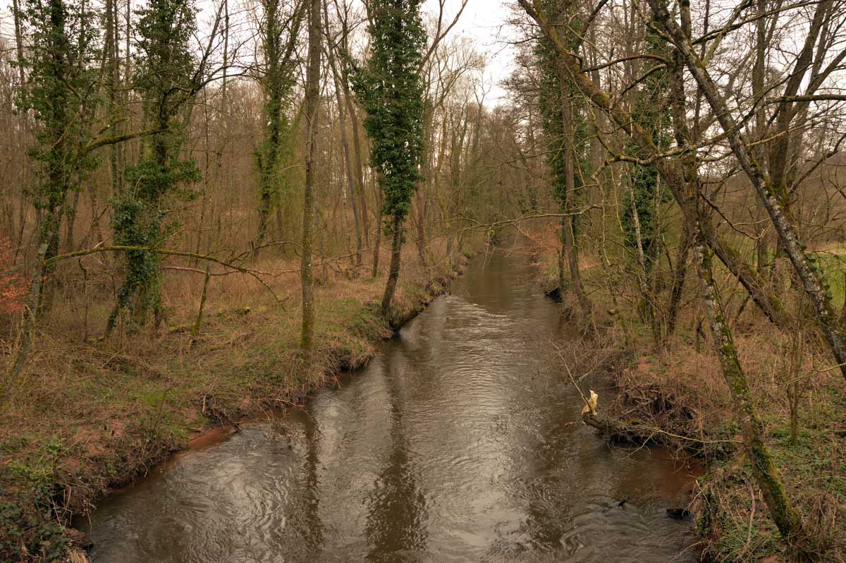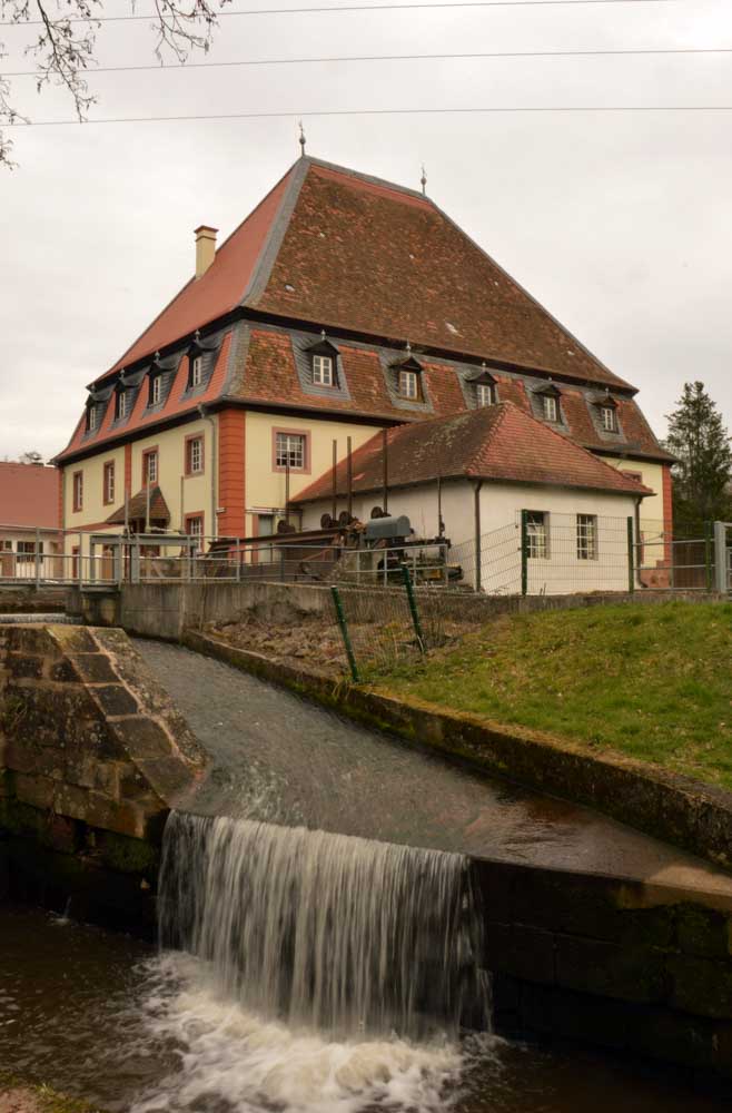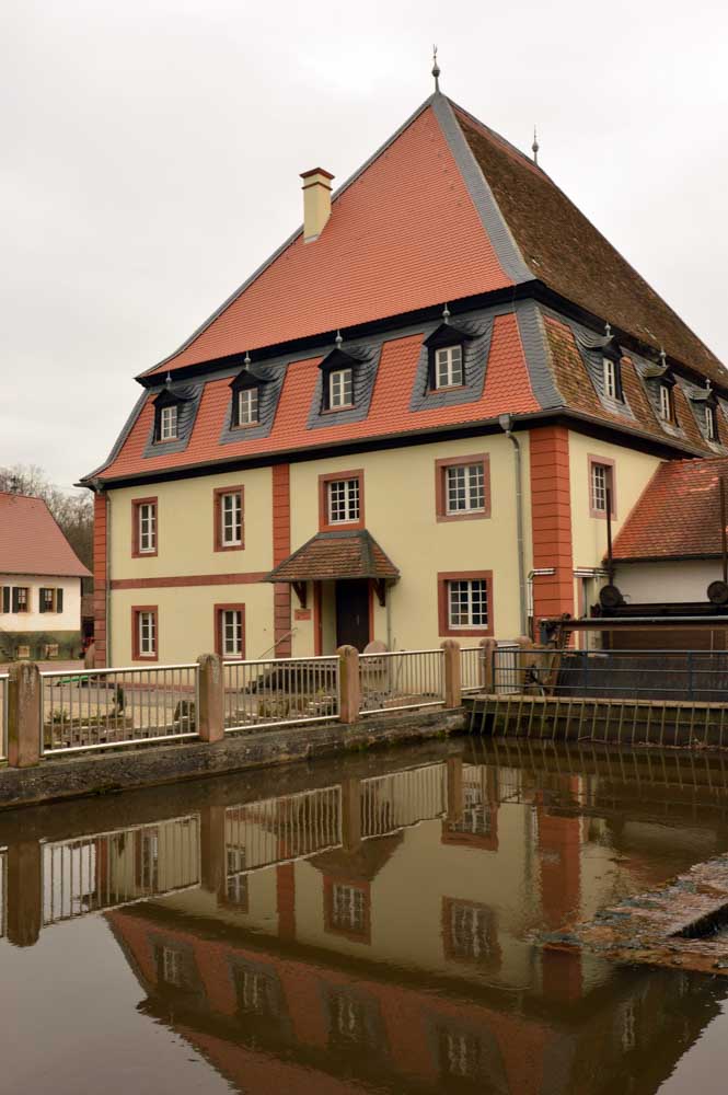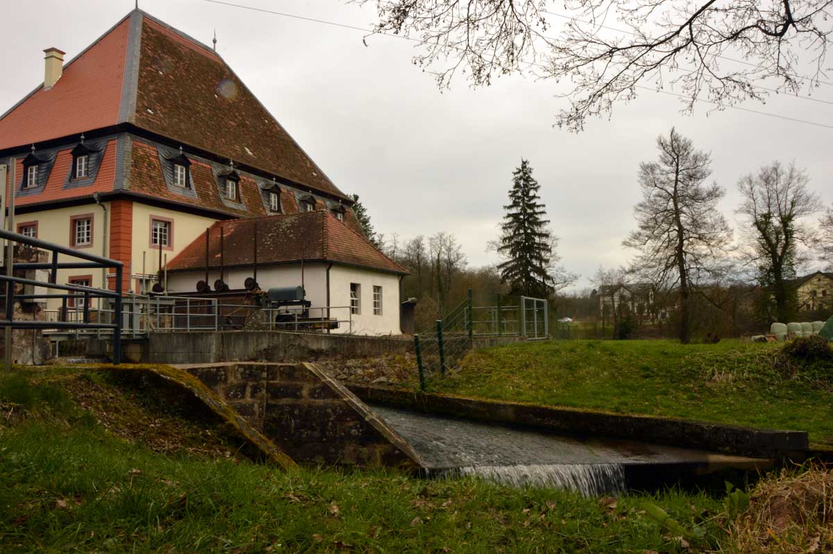Parfois, la Lauter s’étale et forme des plages, d’autres fois elle a creusé des petits canyons. Aussi, je m’attendais à voir surgir un Indien aussi sauvage que la rivière, le torse luisant, les peintures viriles et les plumes flamboyantes, m’embarquant telle une jeune pionnière de l’Ouest, innocente et terrifiée (encore que…) sur son fier étalon… Eh du calme Coyote-En-Rut, tu pues le cheval ! Moi je continue à pied. Et donc nous voilà à longer la Lauter jusqu’au Moulin de Bienwald. Moi je m’imaginais un truc avec des ailes qui tournent. Que dalle ! C’est un moulin à eau. Belle bâtisse quand même, dont j’aurais bien fait mon château. M’y serais installée avec Coyote-en-Rut et vas-y la vie de rentière débridée (donc sans le cheval…).