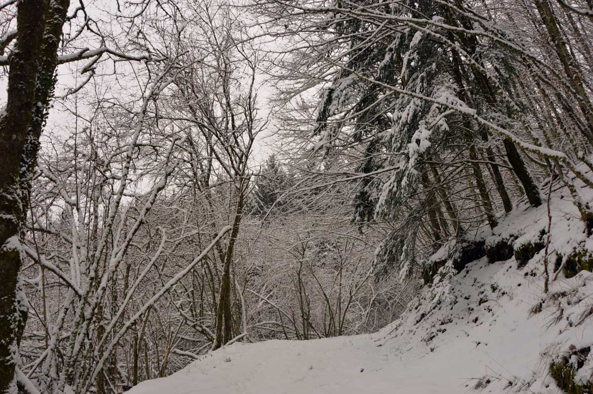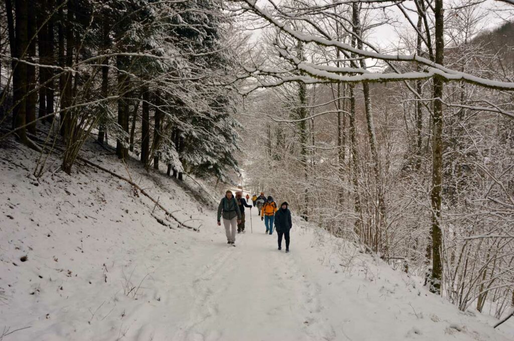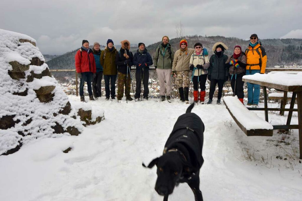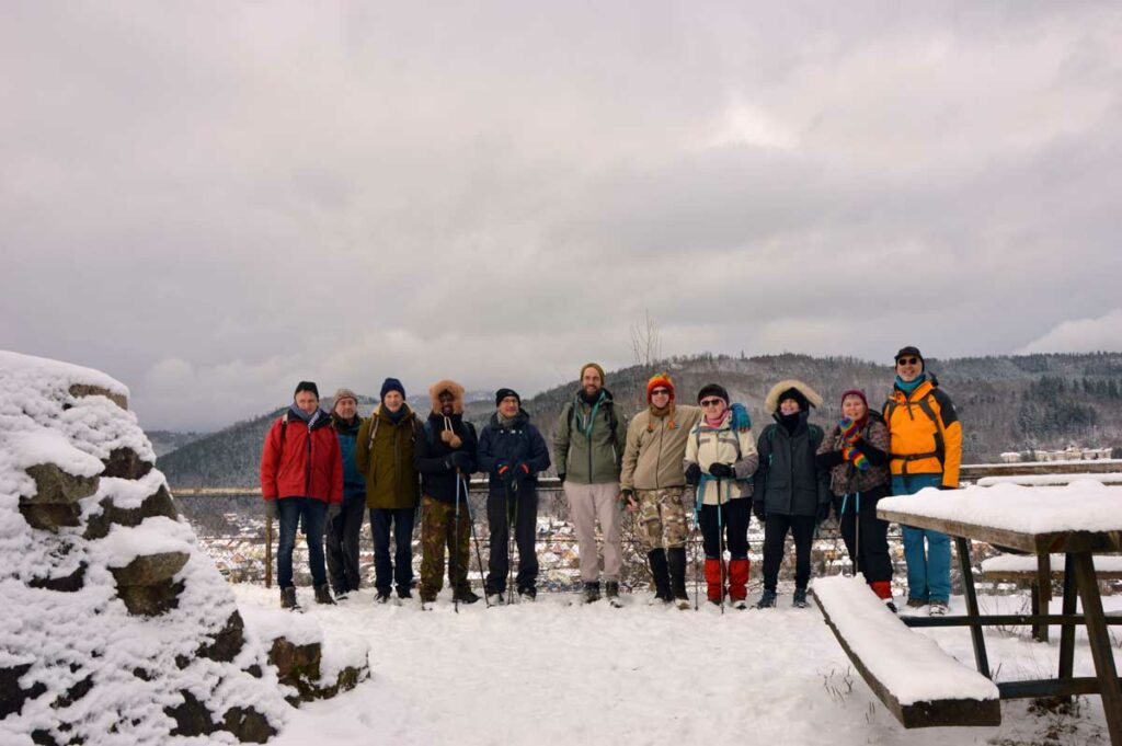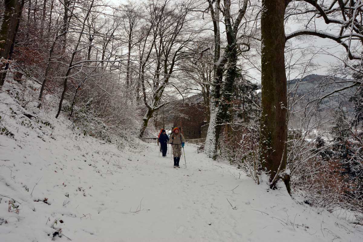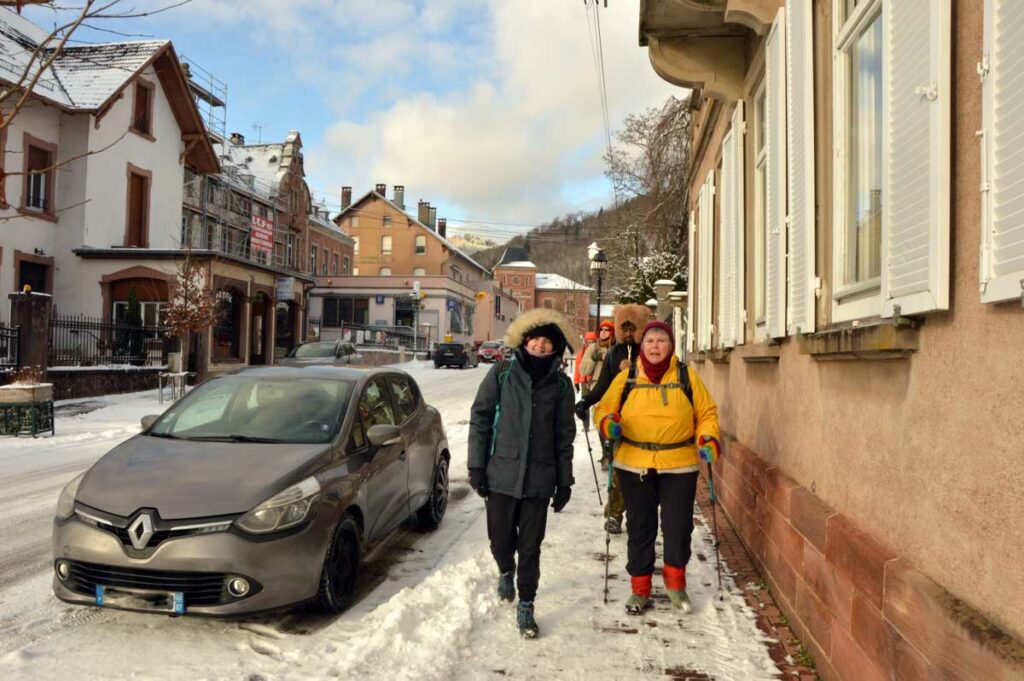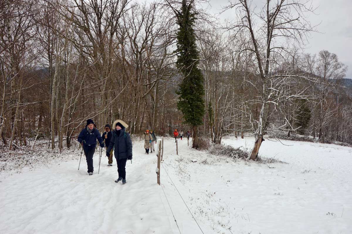 Montée au château et à la Vierge Blanche de Schirmeck avant un tour par Barembach et une montée vers le GR5 dans la neige devenue tempête. Mais déjeuner au sec sous abri, avant de poursuivre la randonnée dans la neige. Que du bonheur !