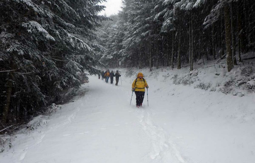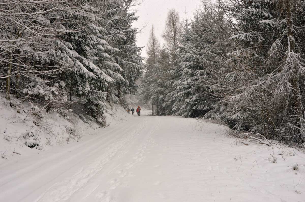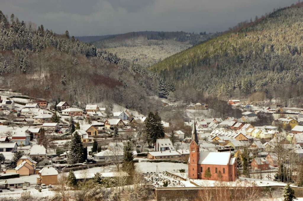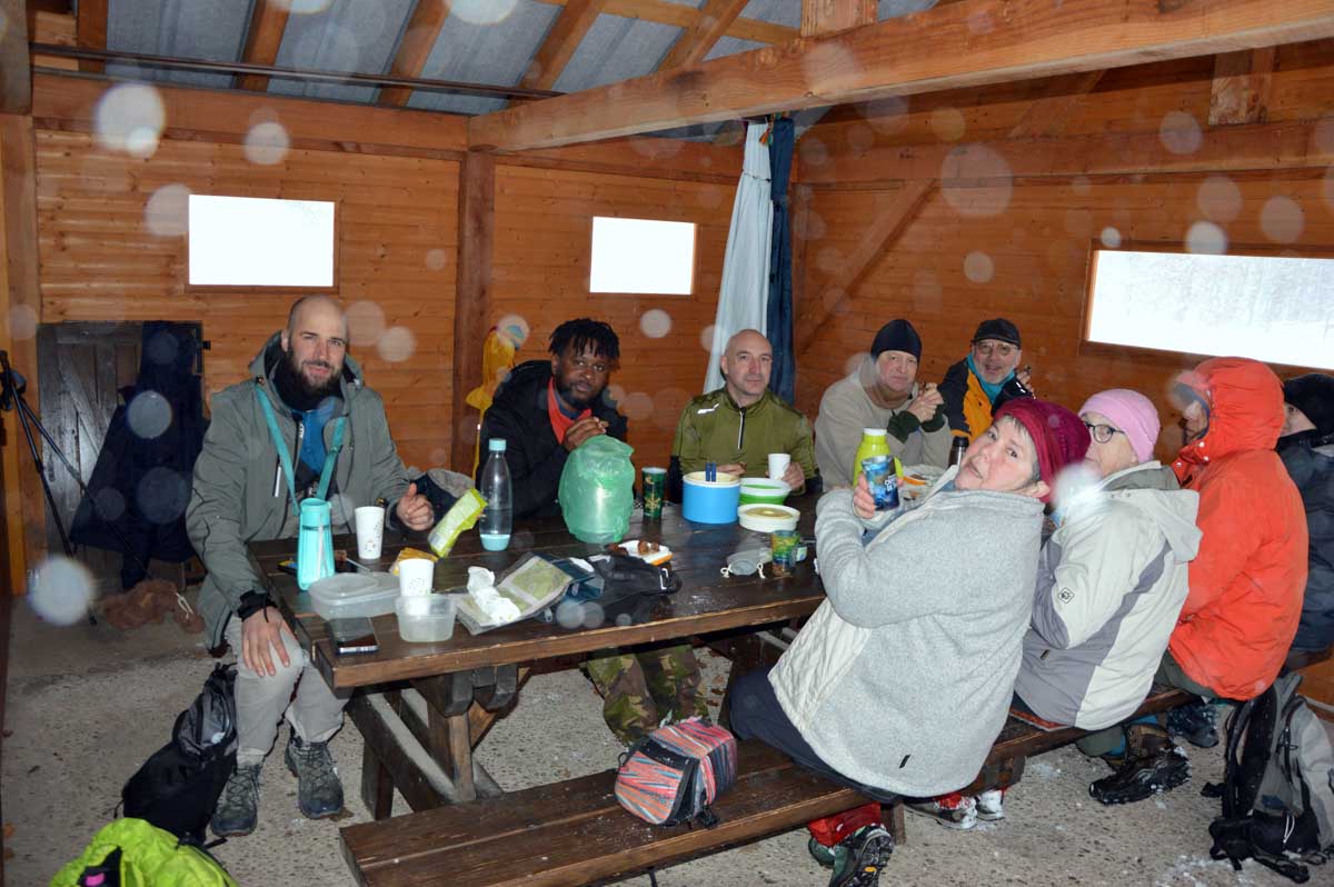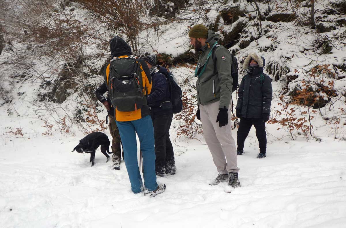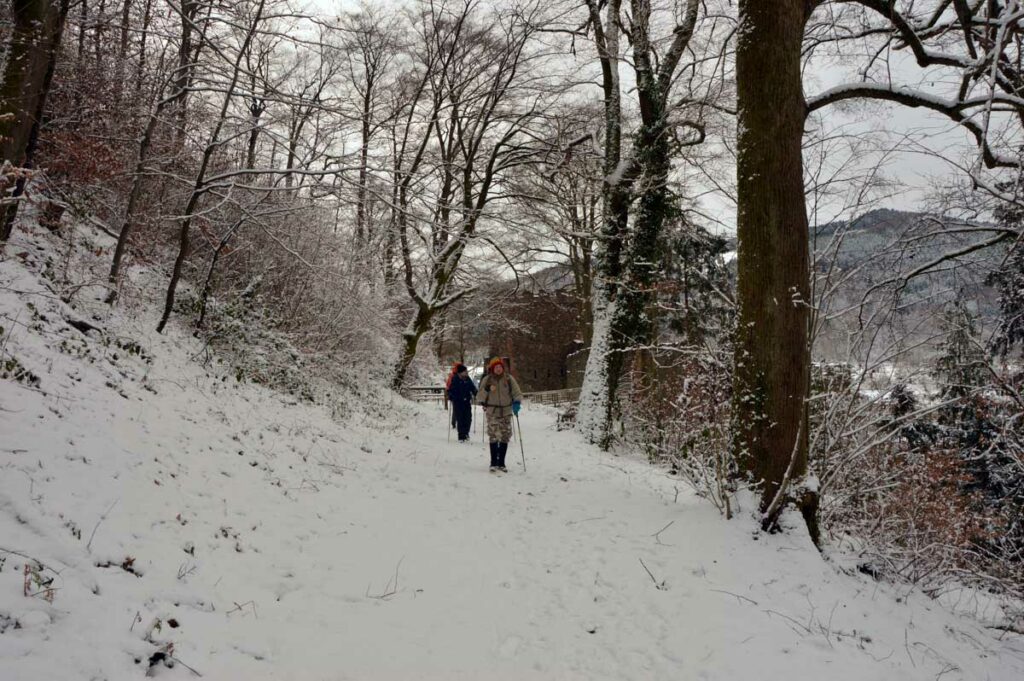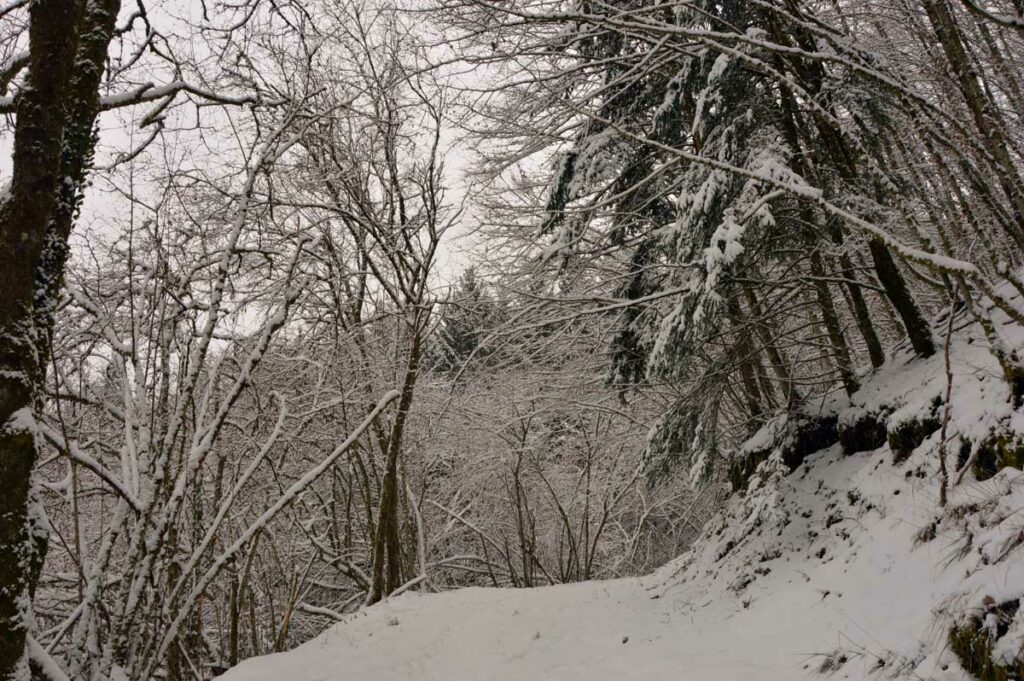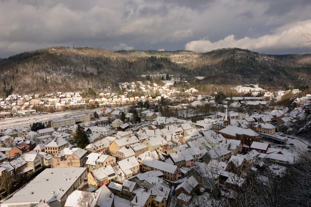 Montée au château et à la Vierge Blanche de Schirmeck avant un tour par Barembach et une montée vers le GR5 dans la neige devenue tempête. Mais déjeuner au sec sous abri, avant de poursuivre la randonnée dans la neige. Que du bonheur !