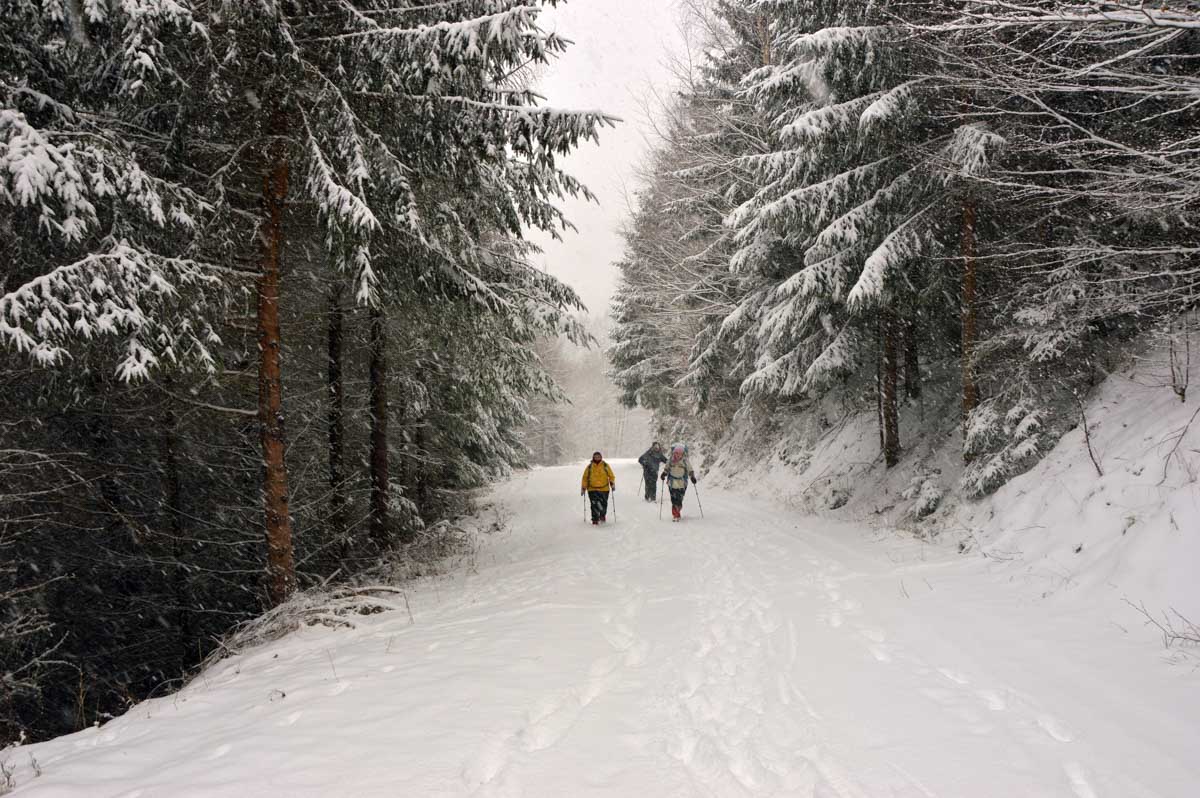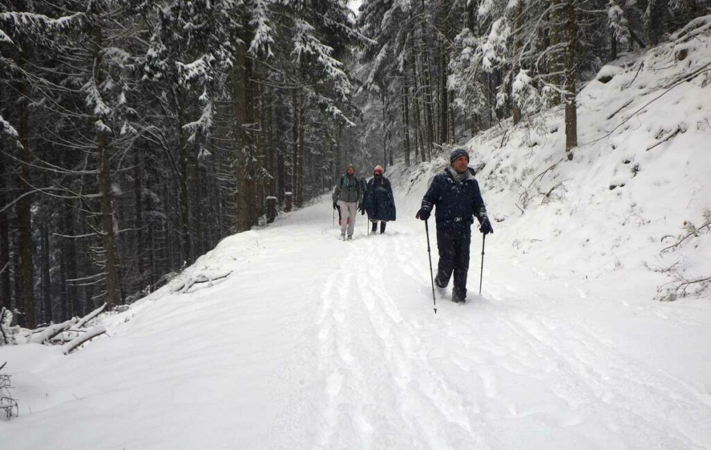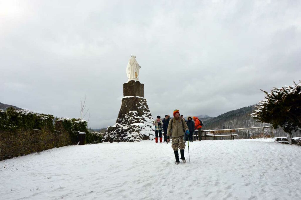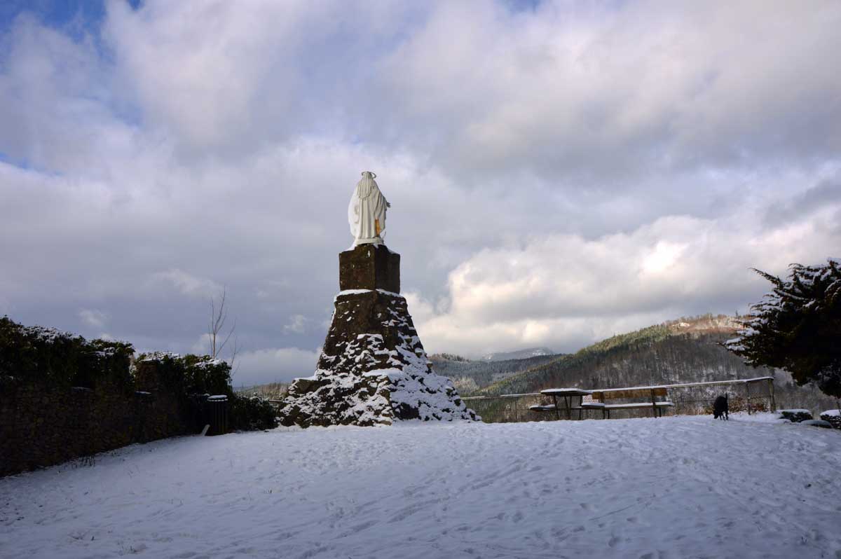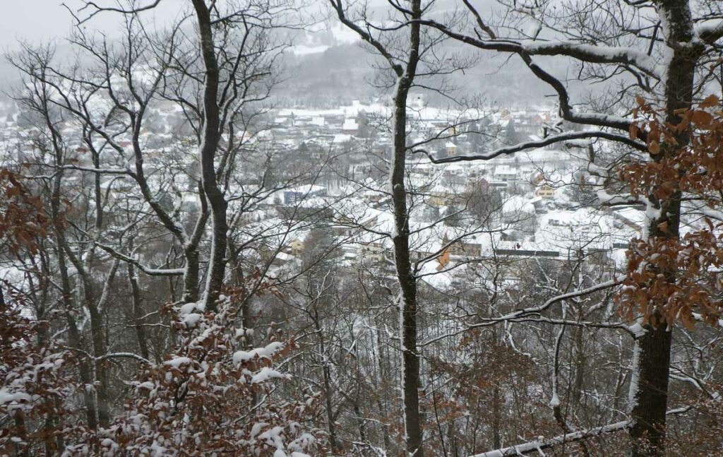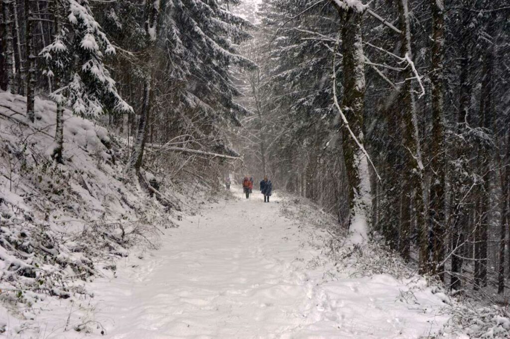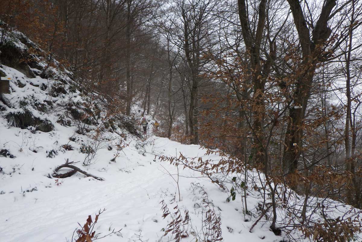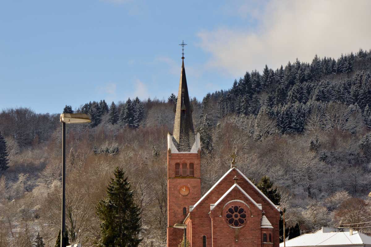 Montée au château et à la Vierge Blanche de Schirmeck avant un tour par Barembach et une montée vers le GR5 dans la neige devenue tempête. Mais déjeuner au sec sous abri, avant de poursuivre la randonnée dans la neige. Que du bonheur !