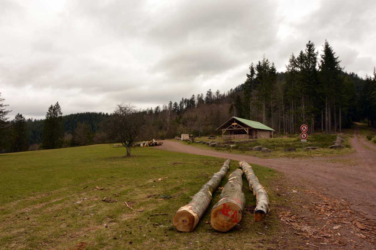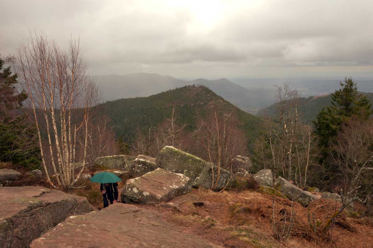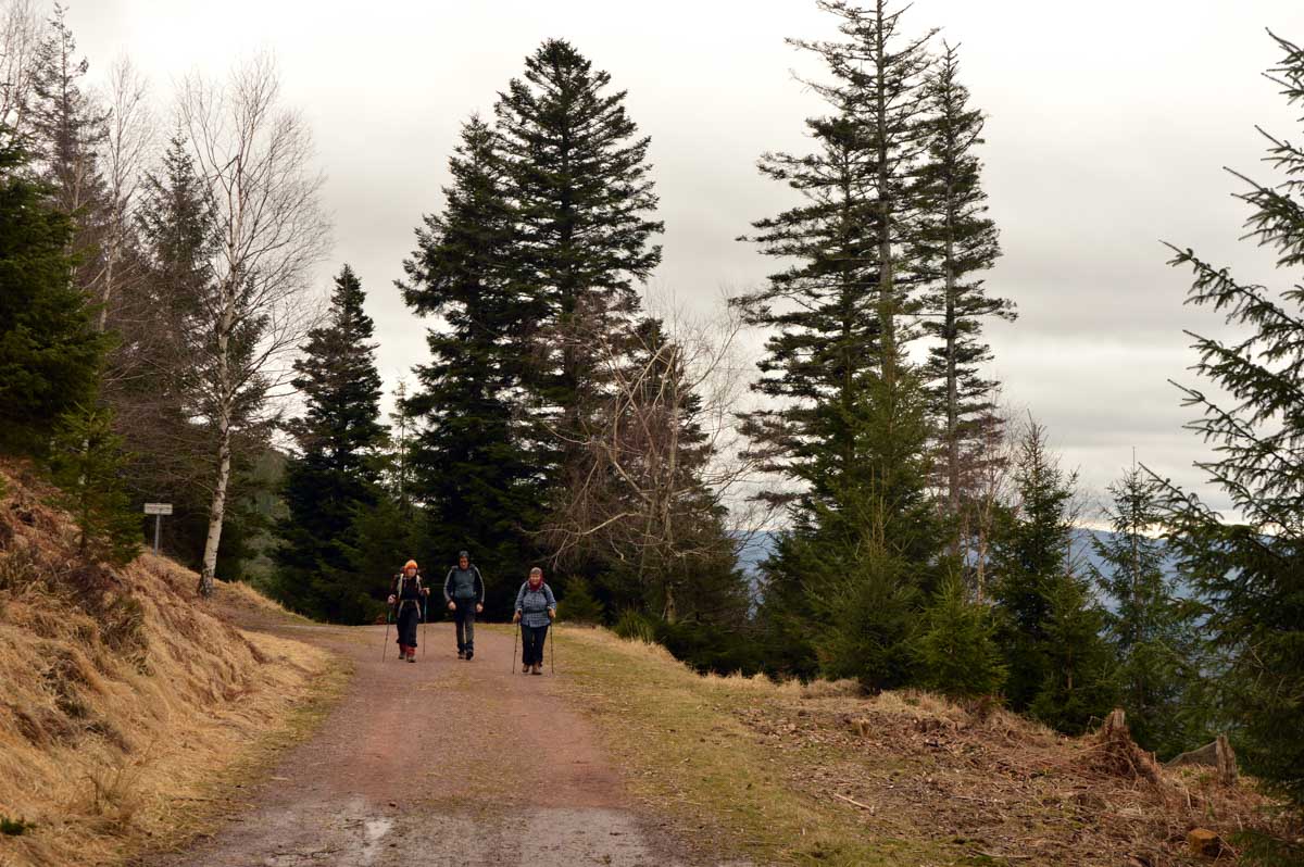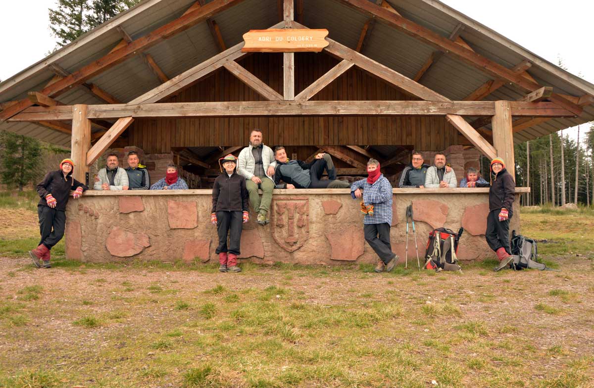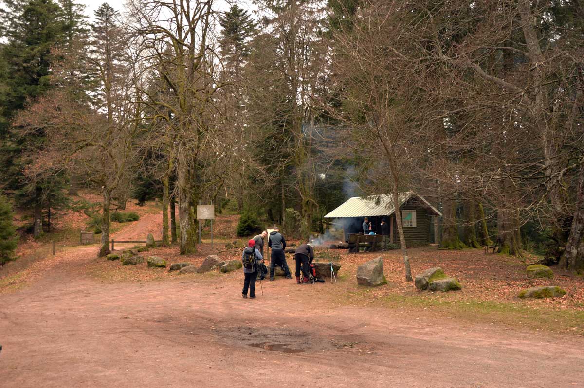 Au Col du Donon (pourquoi aurait-on cherché un nom plus compliqué ?), pour narguer celles et ceux qui ne sont pas venus aujourd’hui, nous avons pris un café-tarte. C’est vrai qu’à lire, c’est moins classe que Kaffee-Kuchen, mais c’est très bon aussi, avec la tarte aux myrtilles faite maison. Les différentes formes d’énergie ainsi accumulées nous ont donné l’élan pour redescendre vers Schirmeck et comme il se doit, après y a voir tant échappé, nous avons enfin été trempés par l’averse quelques minutes avant de retrouver les voitures !