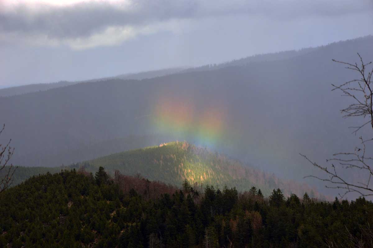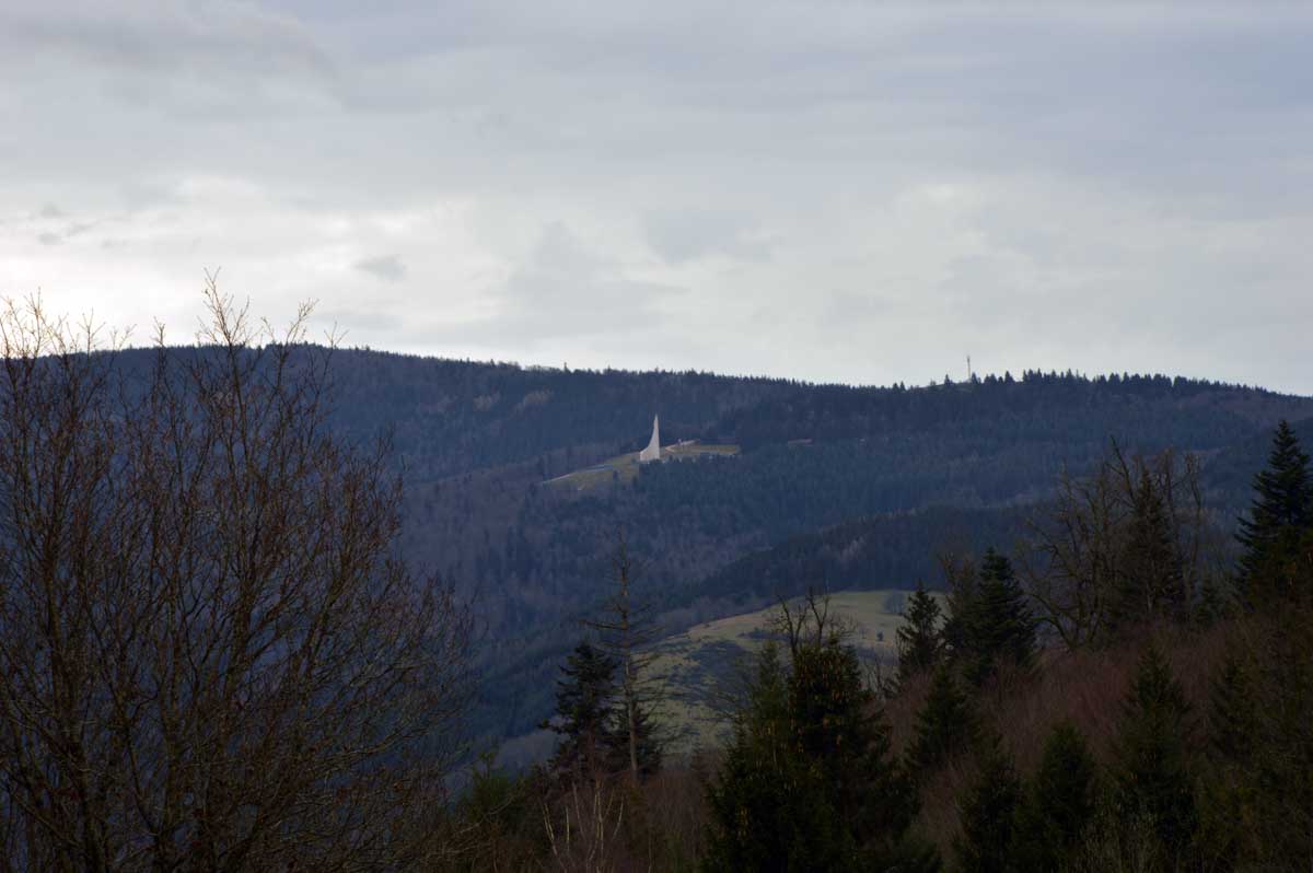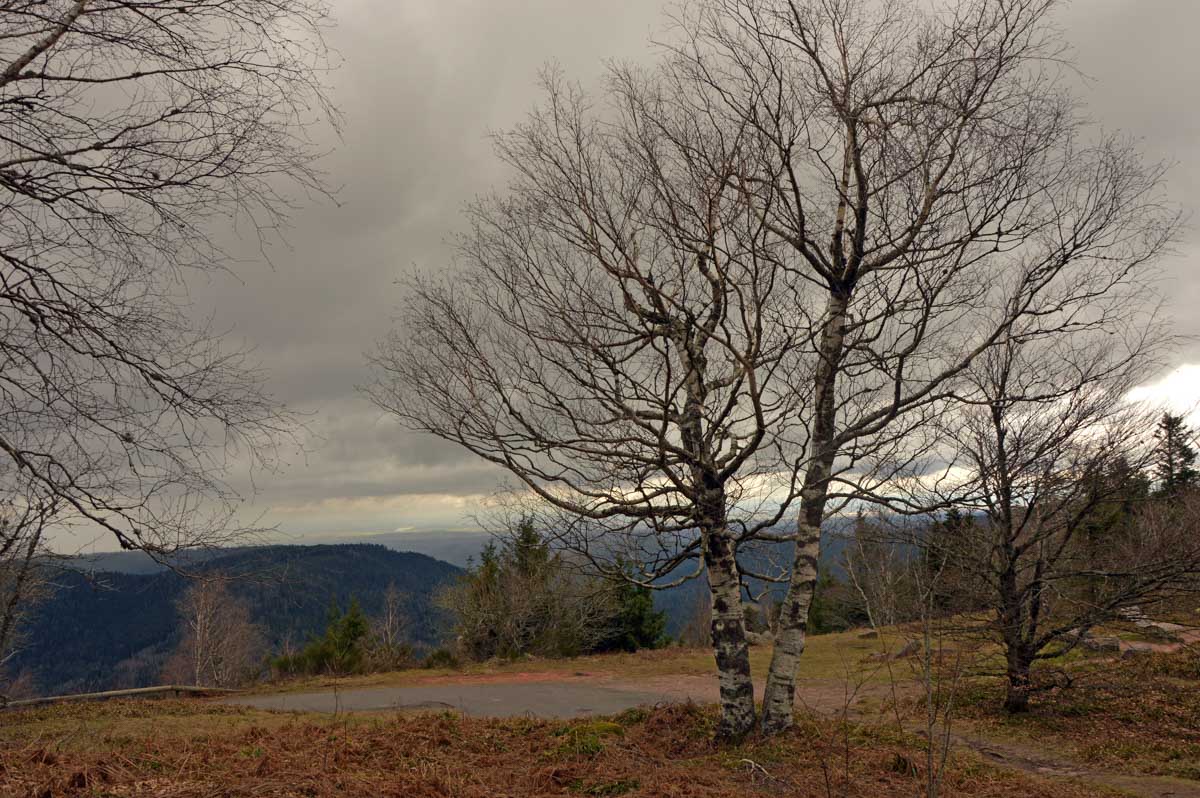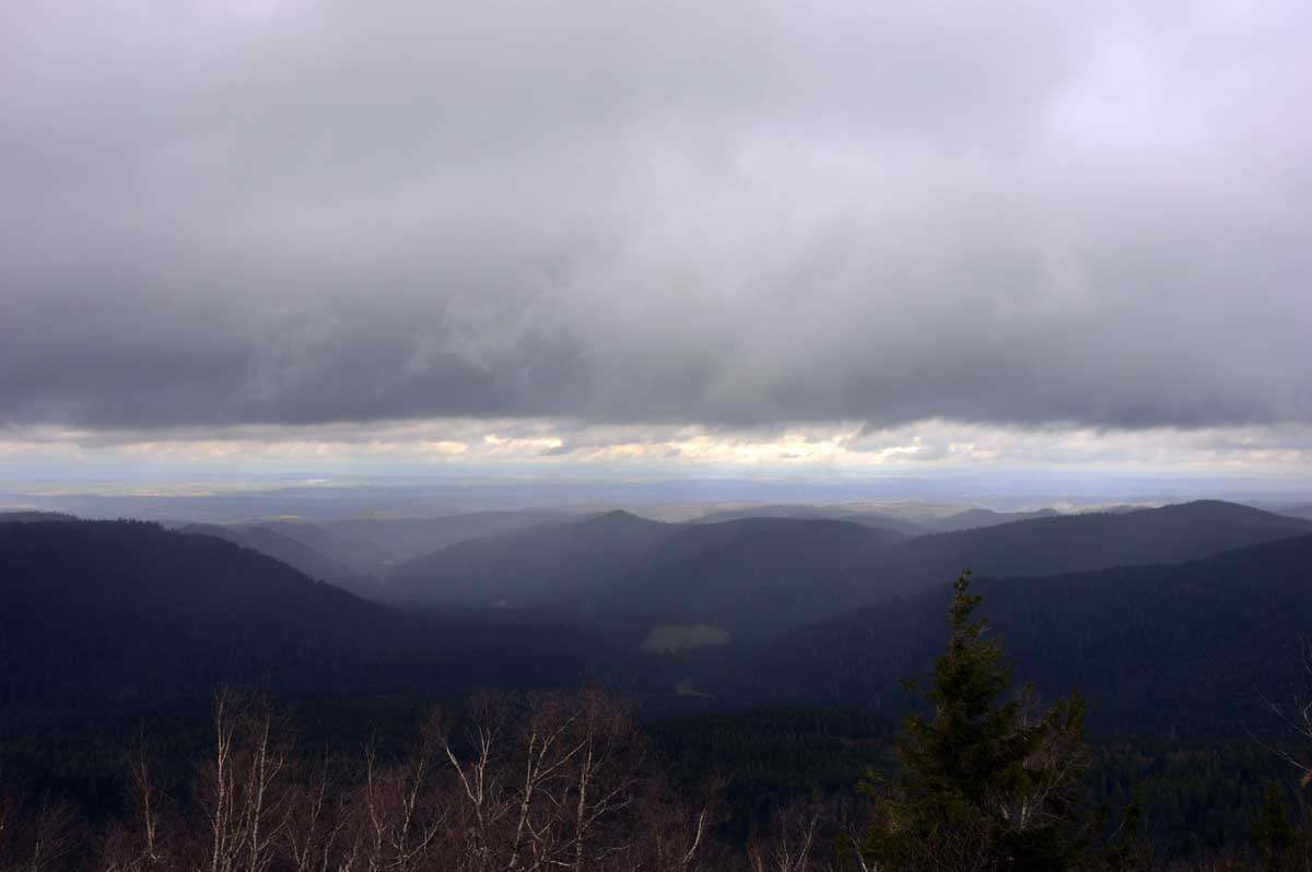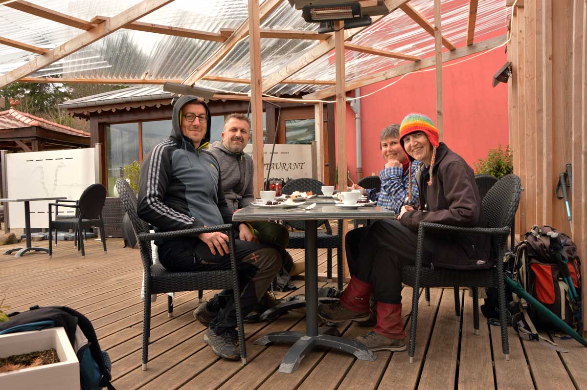 Au Col du Donon (pourquoi aurait-on cherché un nom plus compliqué ?), pour narguer celles et ceux qui ne sont pas venus aujourd’hui, nous avons pris un café-tarte. C’est vrai qu’à lire, c’est moins classe que Kaffee-Kuchen, mais c’est très bon aussi, avec la tarte aux myrtilles faite maison. Les différentes formes d’énergie ainsi accumulées nous ont donné l’élan pour redescendre vers Schirmeck et comme il se doit, après y a voir tant échappé, nous avons enfin été trempés par l’averse quelques minutes avant de retrouver les voitures !