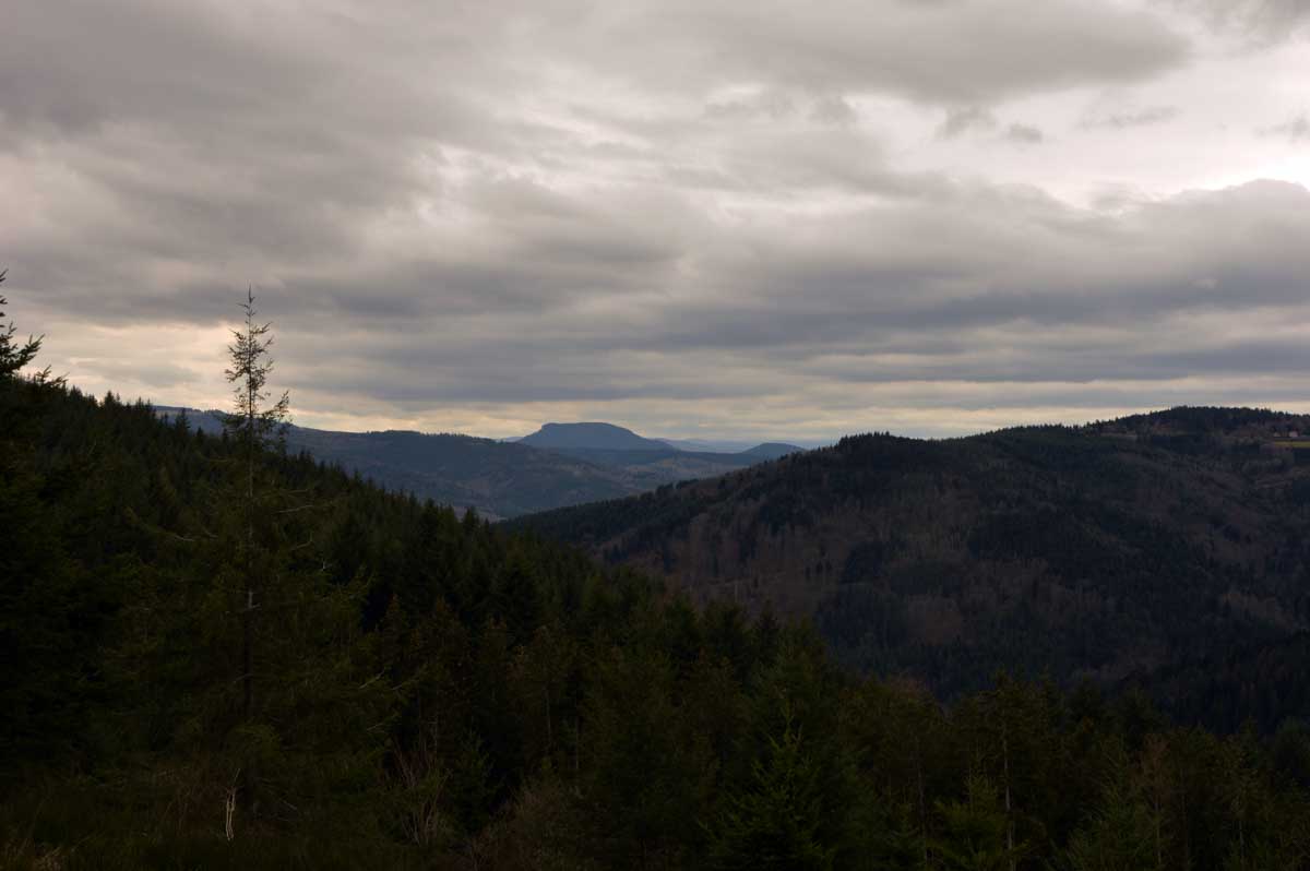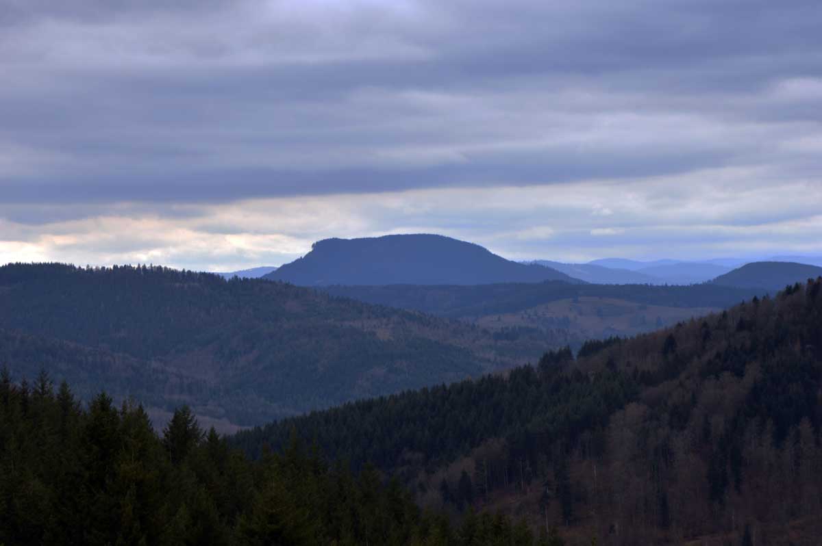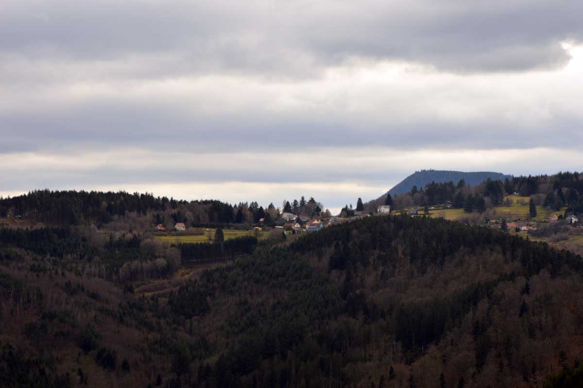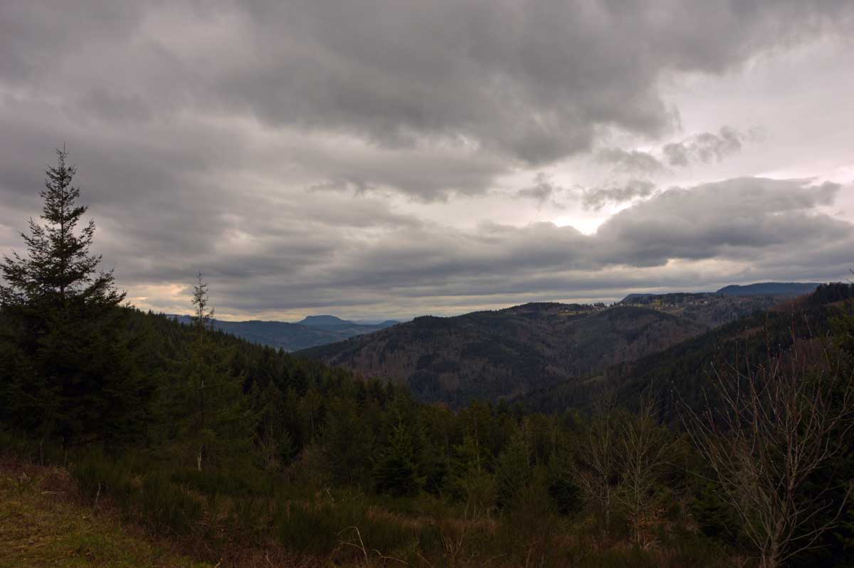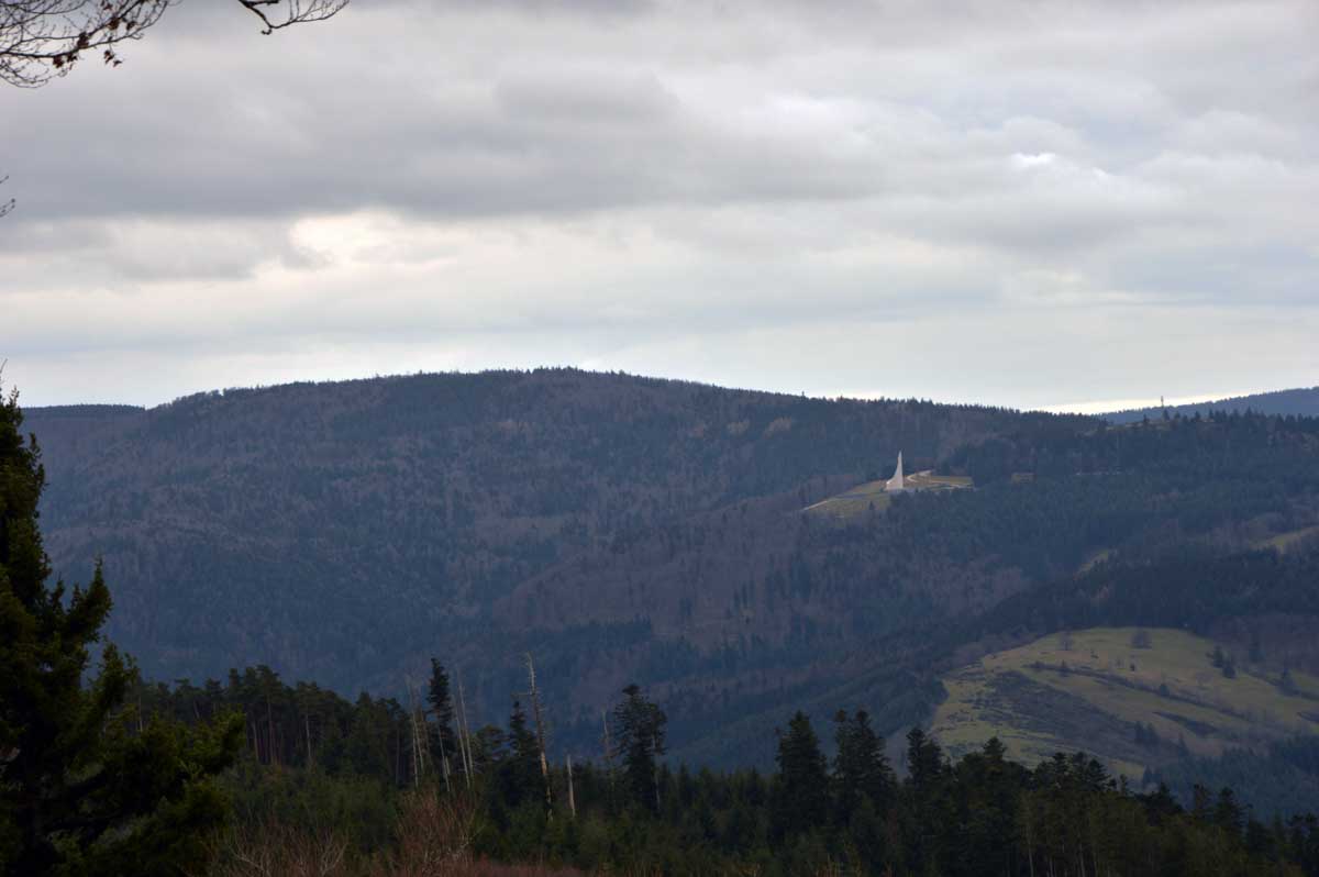 Au Col du Donon (pourquoi aurait-on cherché un nom plus compliqué ?), pour narguer celles et ceux qui ne sont pas venus aujourd’hui, nous avons pris un café-tarte. C’est vrai qu’à lire, c’est moins classe que Kaffee-Kuchen, mais c’est très bon aussi, avec la tarte aux myrtilles faite maison. Les différentes formes d’énergie ainsi accumulées nous ont donné l’élan pour redescendre vers Schirmeck et comme il se doit, après y a voir tant échappé, nous avons enfin été trempés par l’averse quelques minutes avant de retrouver les voitures !