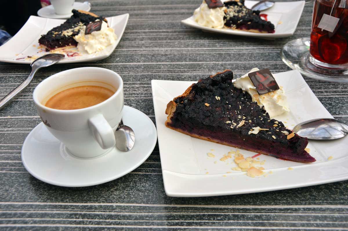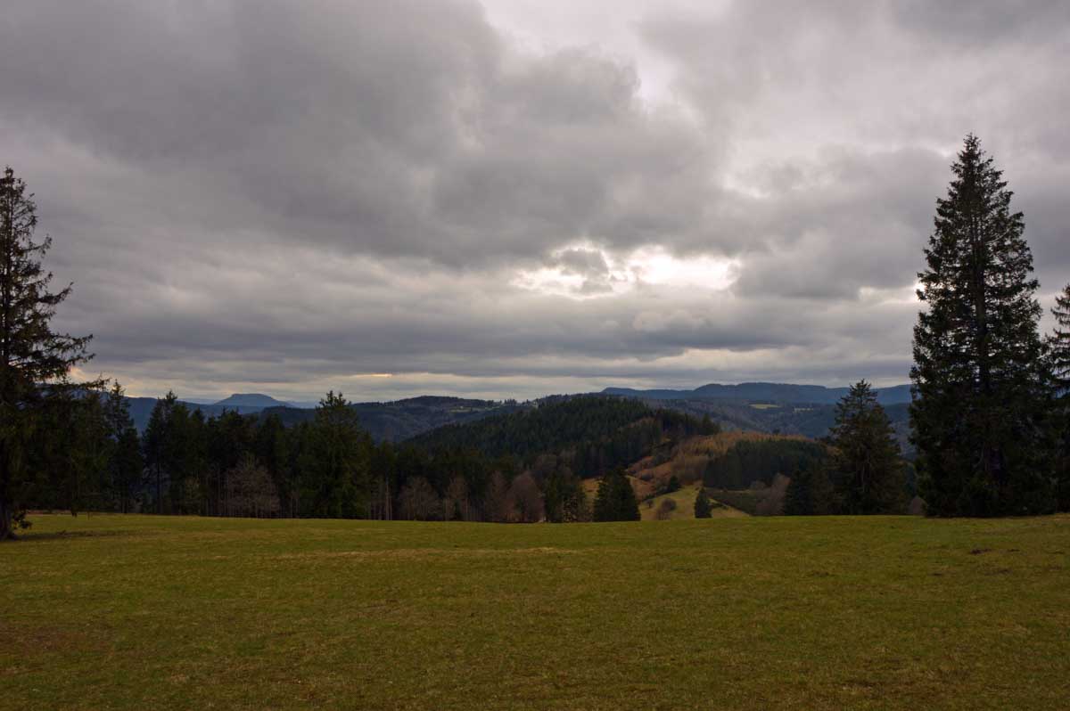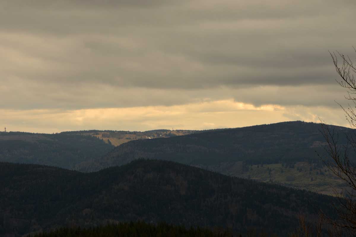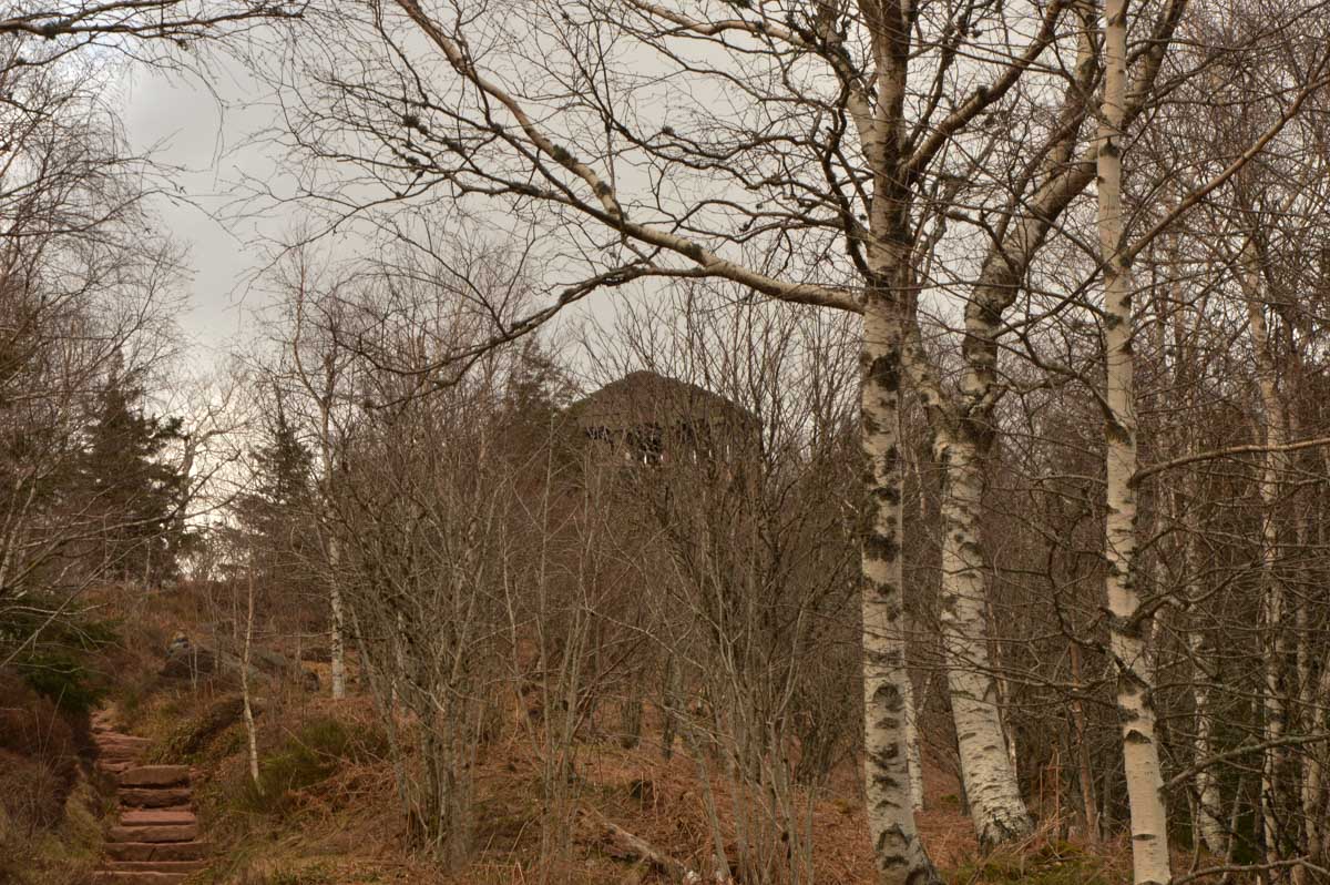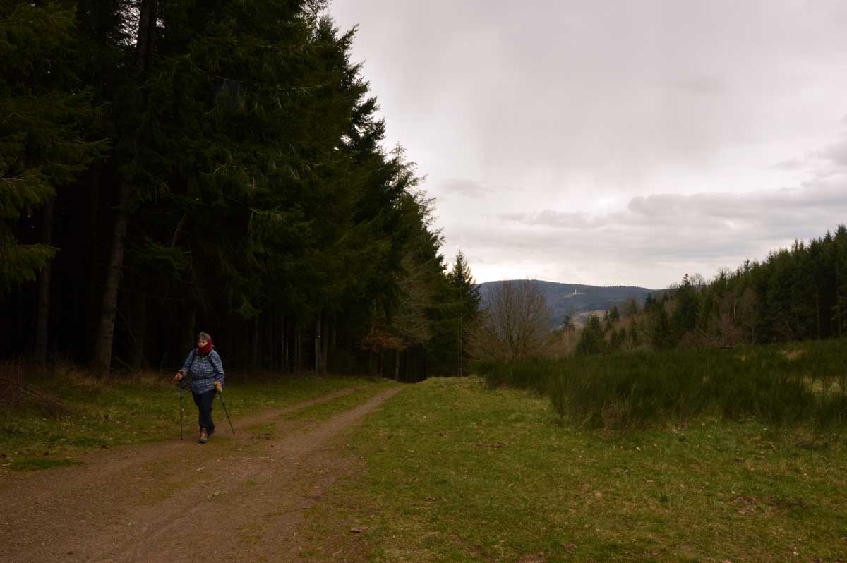 Au Col du Donon (pourquoi aurait-on cherché un nom plus compliqué ?), pour narguer celles et ceux qui ne sont pas venus aujourd’hui, nous avons pris un café-tarte. C’est vrai qu’à lire, c’est moins classe que Kaffee-Kuchen, mais c’est très bon aussi, avec la tarte aux myrtilles faite maison. Les différentes formes d’énergie ainsi accumulées nous ont donné l’élan pour redescendre vers Schirmeck et comme il se doit, après y a voir tant échappé, nous avons enfin été trempés par l’averse quelques minutes avant de retrouver les voitures !