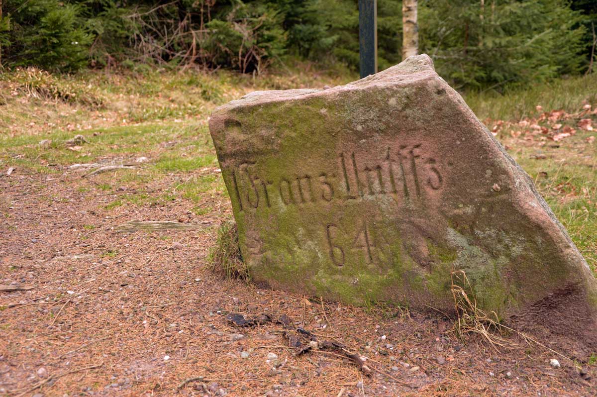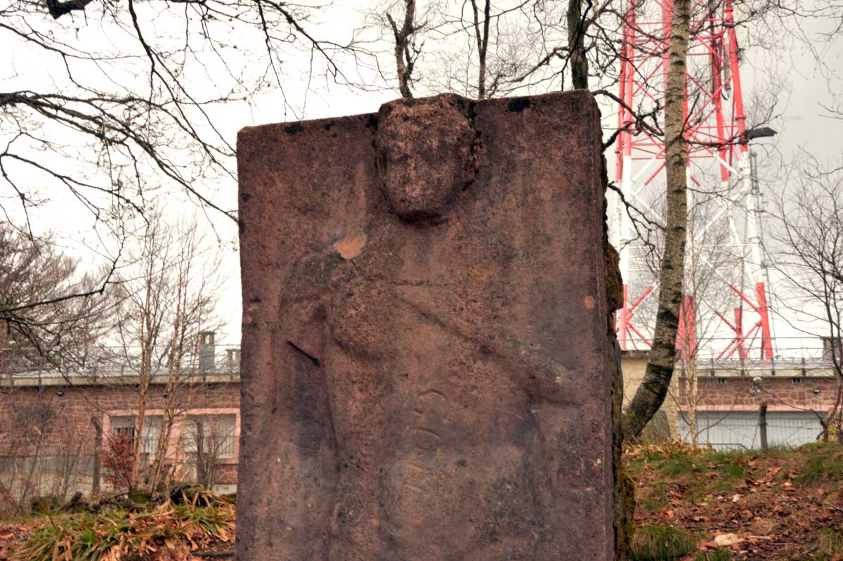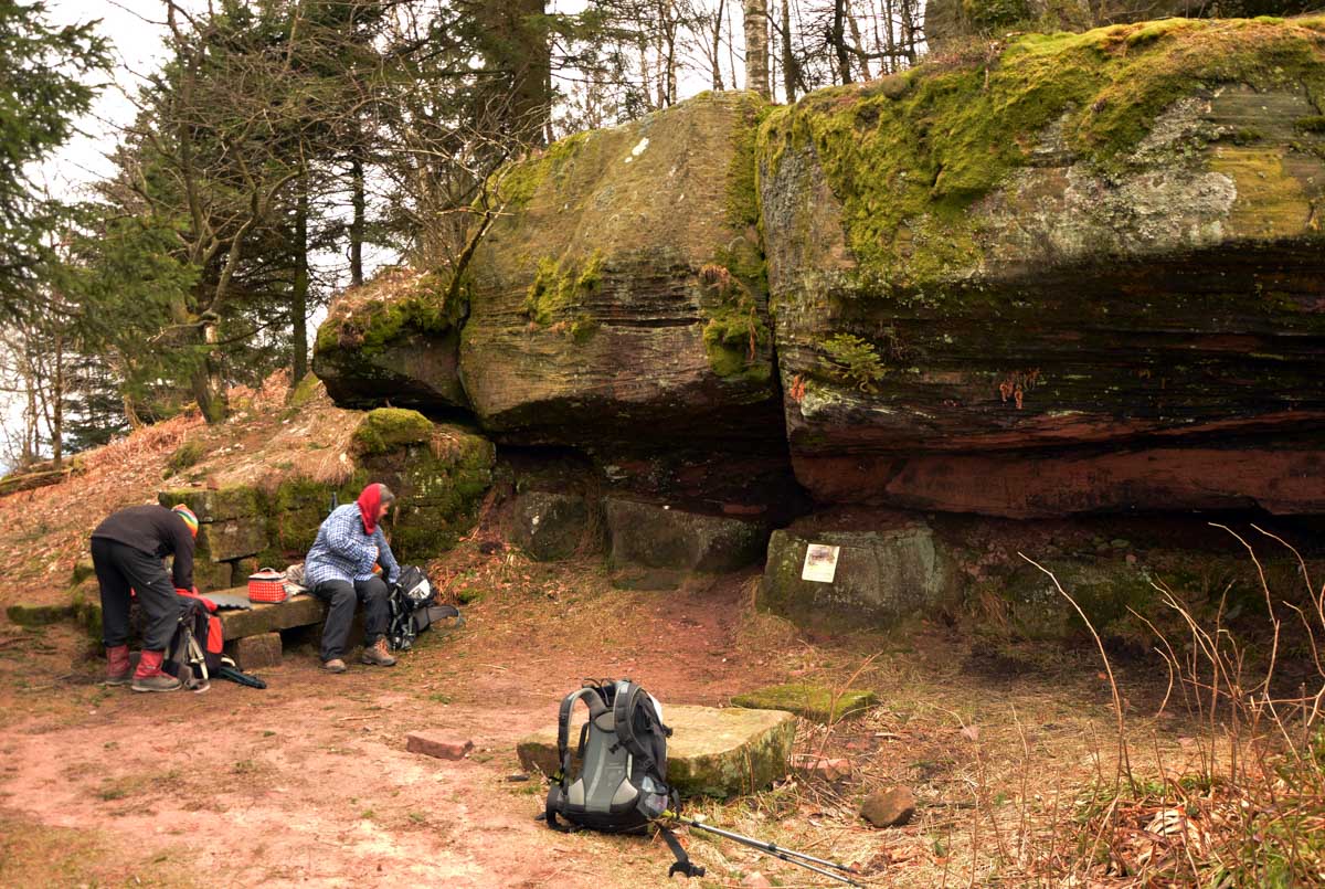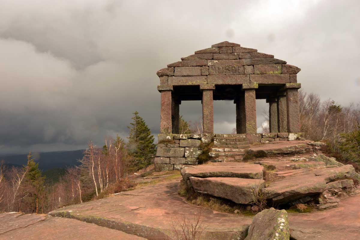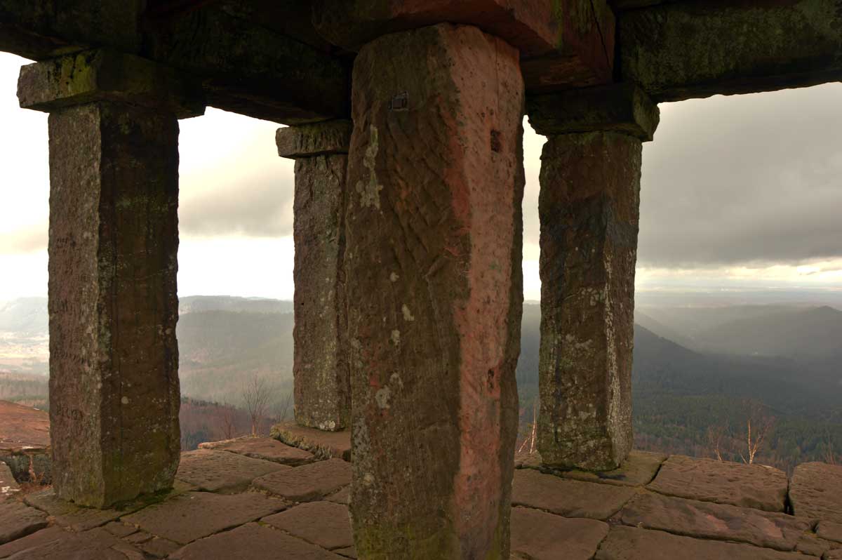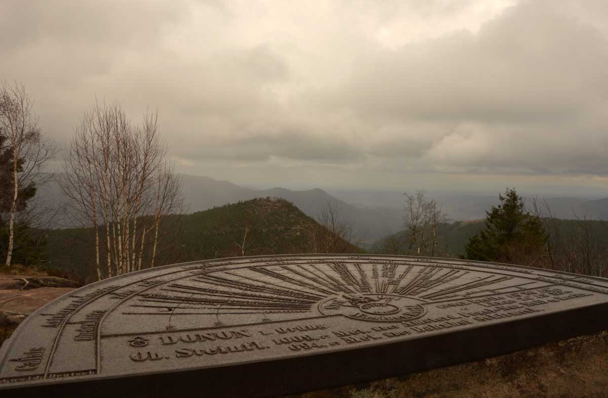 Une montée tout en douceur, et voilà déjà le Col entre les deux Donon (ils se sont pas foulés, pour le nom) et les premières vues sur les Vosges, le Climont, la Chatte Pendue (rien à voir avec un félin dépressif), et les hauteurs du Rocher de Mutzig. Et là, grimpette sur le Grand Donon, à 1009 mètres d’altitude. Les soldats de la Première Guerre Mondiale nous avaient aménagé un coin pour le casse-croûte avec même un jeu de marelle gravé dans le grès et que, depuis plus d’un siècle, des milliers de fessiers fatigués n’ont pas réussi à effacer.