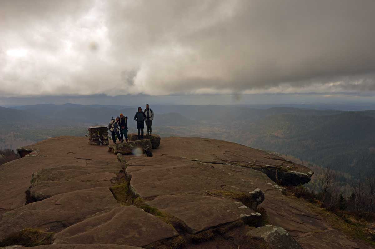 Attention envolée lyrique : dans le vent frais balayant la plateforme sommitale, nous posâmes pour une photo dans cet environnement gréseux et dénudé, sublimé par une lumière davantage surnaturelle que printanière, les nuages bas rappelant à nos esprits vagabonds que les éléments pouvaient se déchaîner sur un claquement de doigts des dieux hébergés ici.