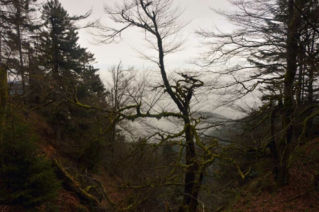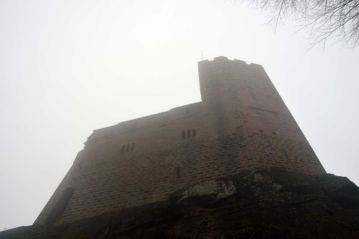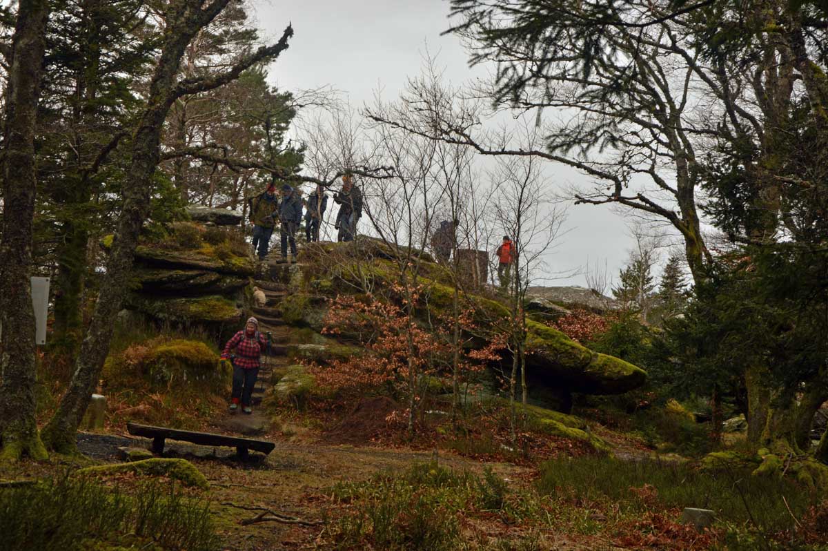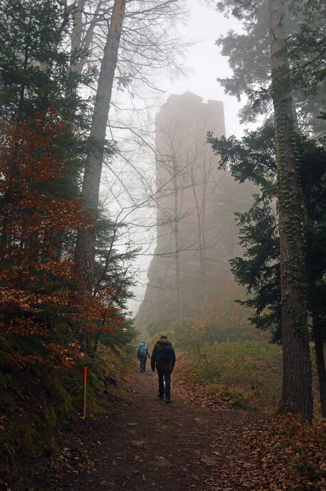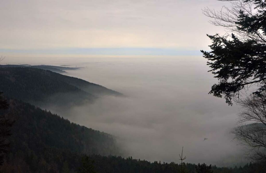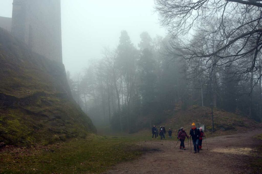 Tranquille montée vers le Lottelfels au sommet du Schneeberg à 961 mètres, pour retrouver la vue au-dessus du brouillard, puis descendre par une partie du sentier des sculptures et revenir à Wangenbour-Engenthal par son château… dans le brouillard.
