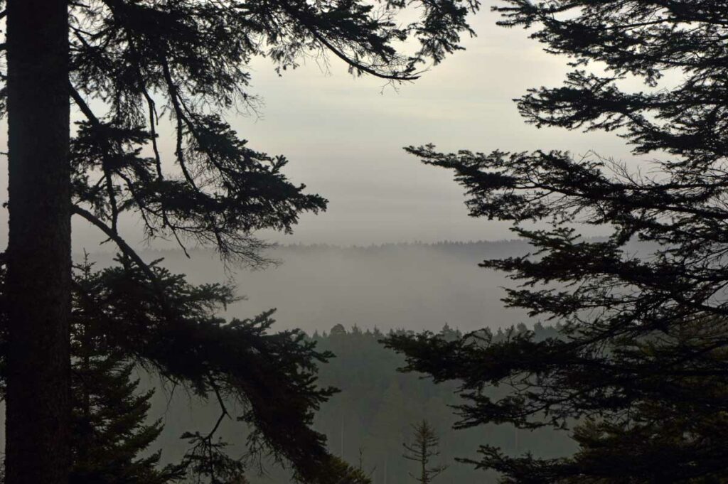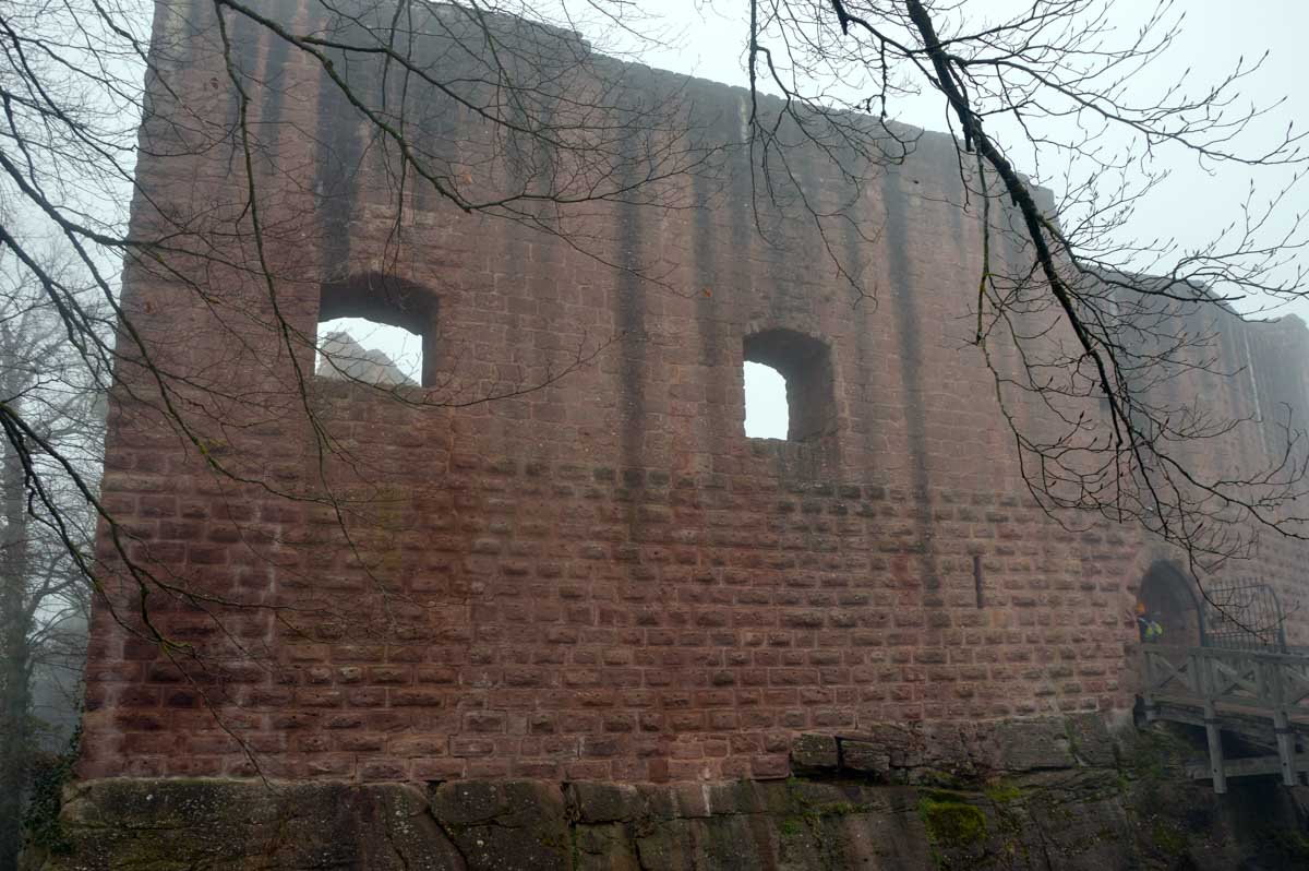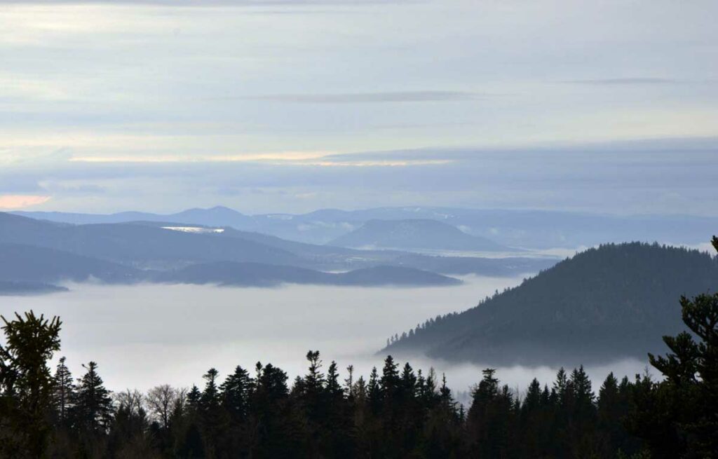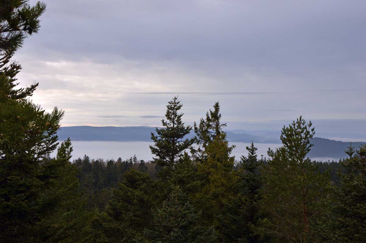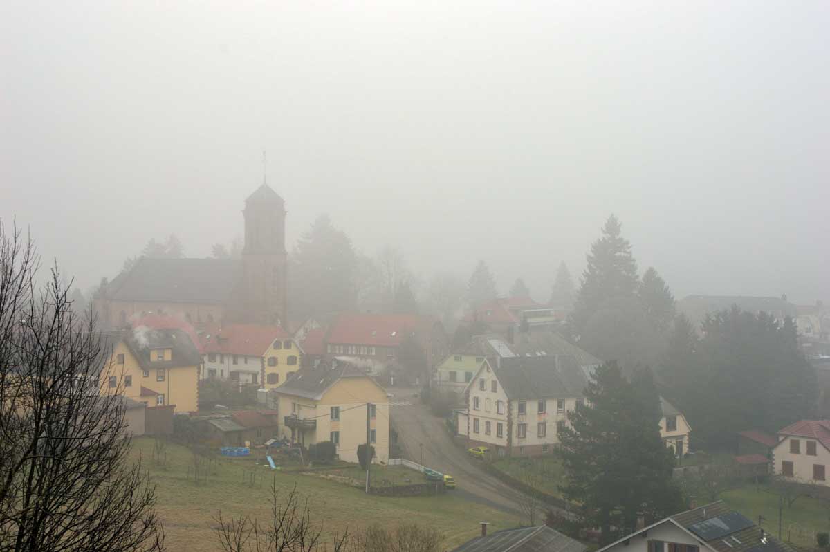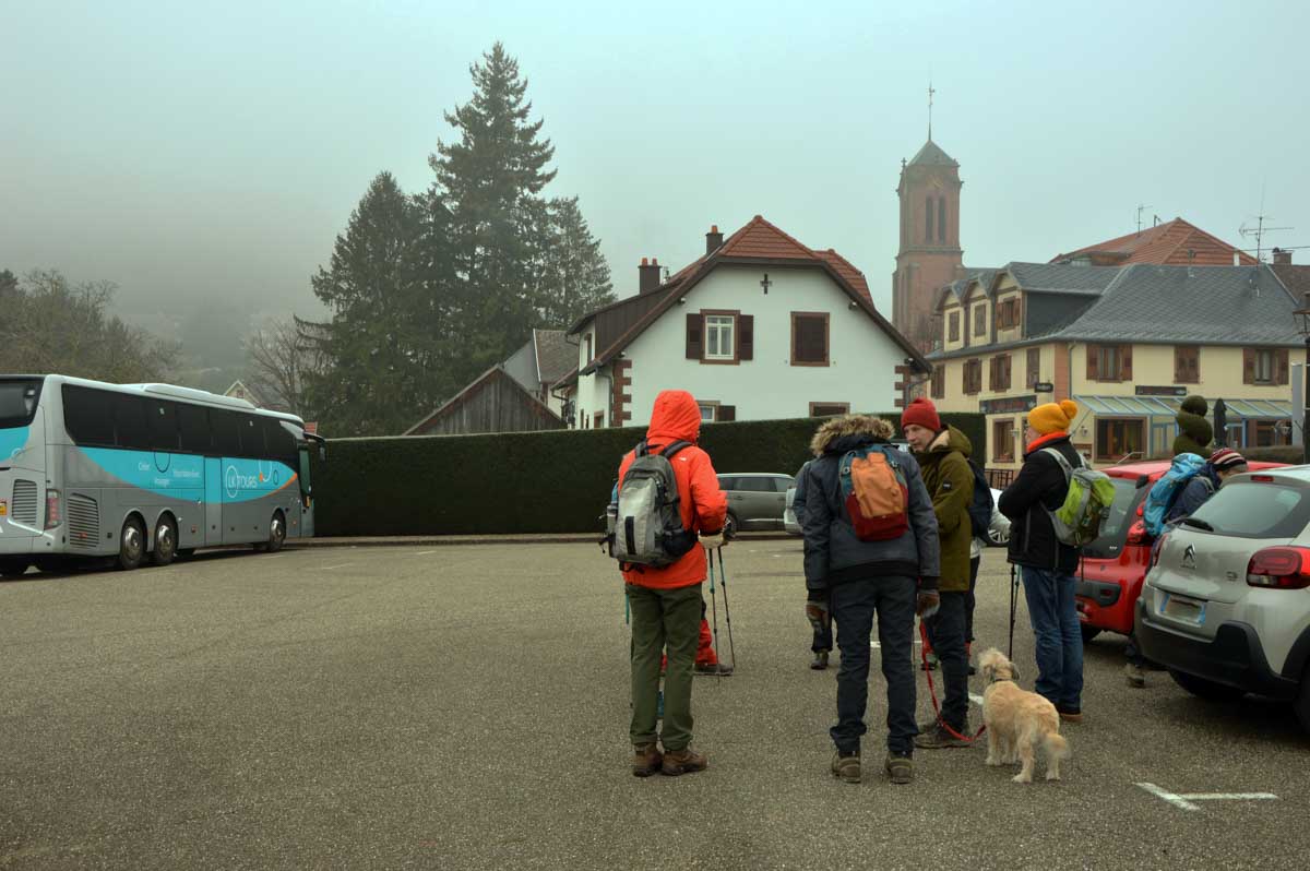 Tranquille montée vers le Lottelfels au sommet du Schneeberg à 961 mètres, pour retrouver la vue au-dessus du brouillard, puis descendre par une partie du sentier des sculptures et revenir à Wangenbour-Engenthal par son château… dans le brouillard.