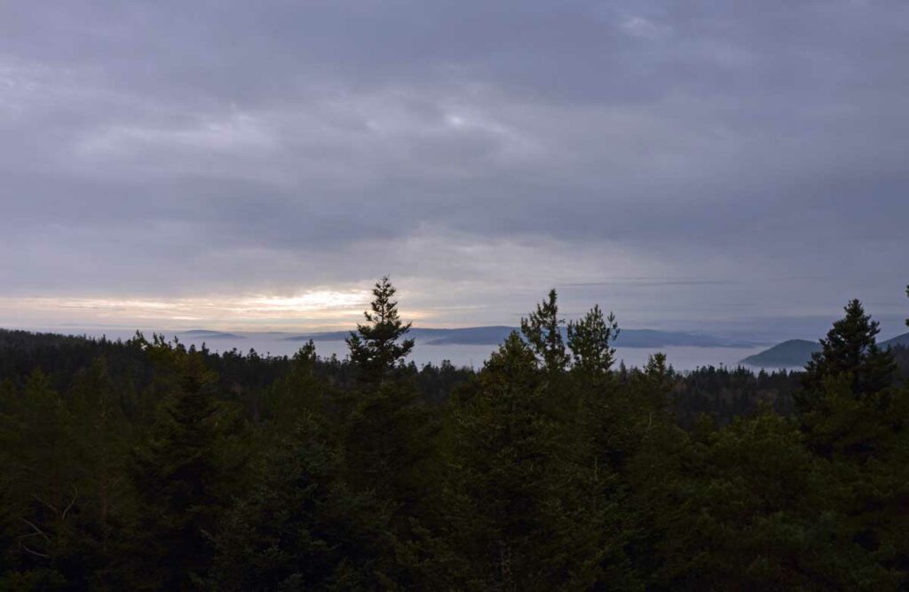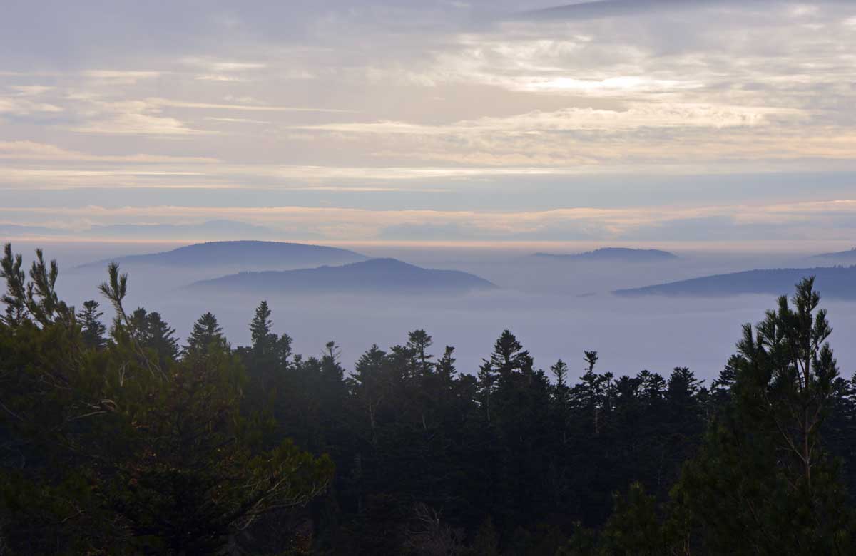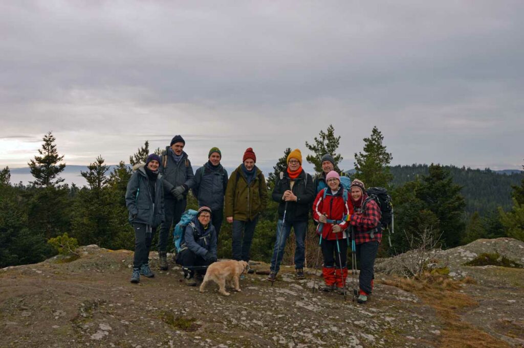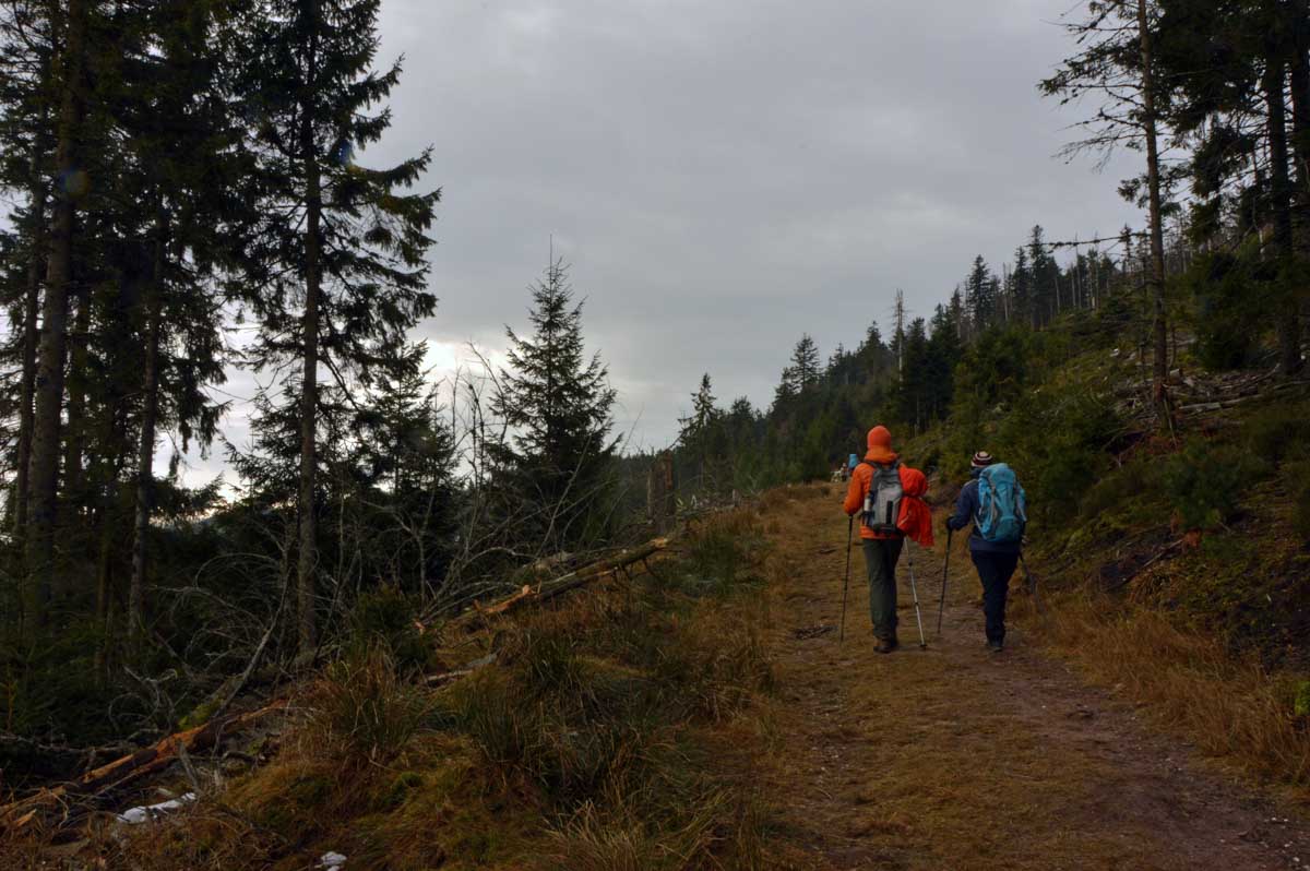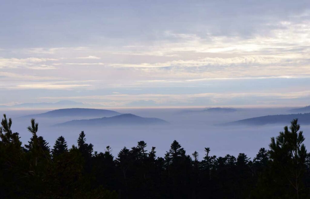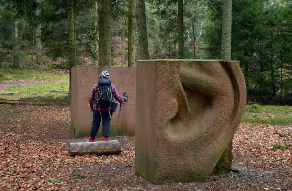 Tranquille montée vers le Lottelfels au sommet du Schneeberg à 961 mètres, pour retrouver la vue au-dessus du brouillard, puis descendre par une partie du sentier des sculptures et revenir à Wangenbour-Engenthal par son château… dans le brouillard.
