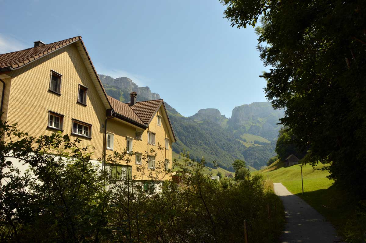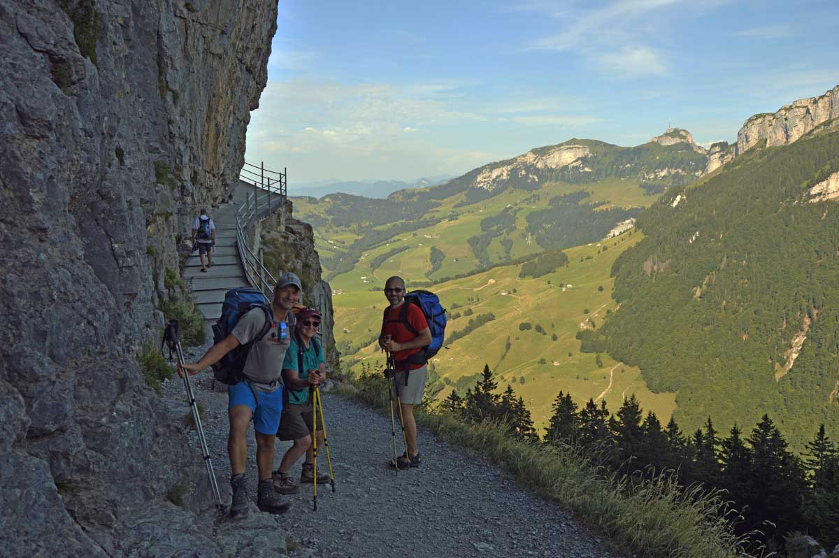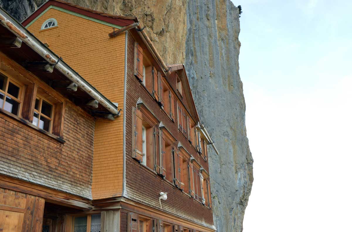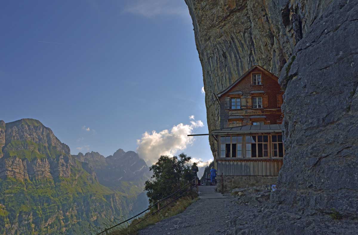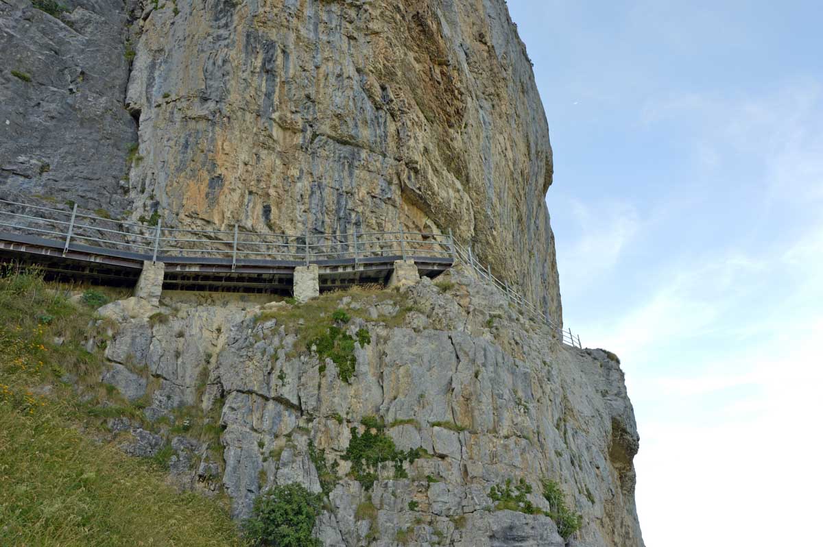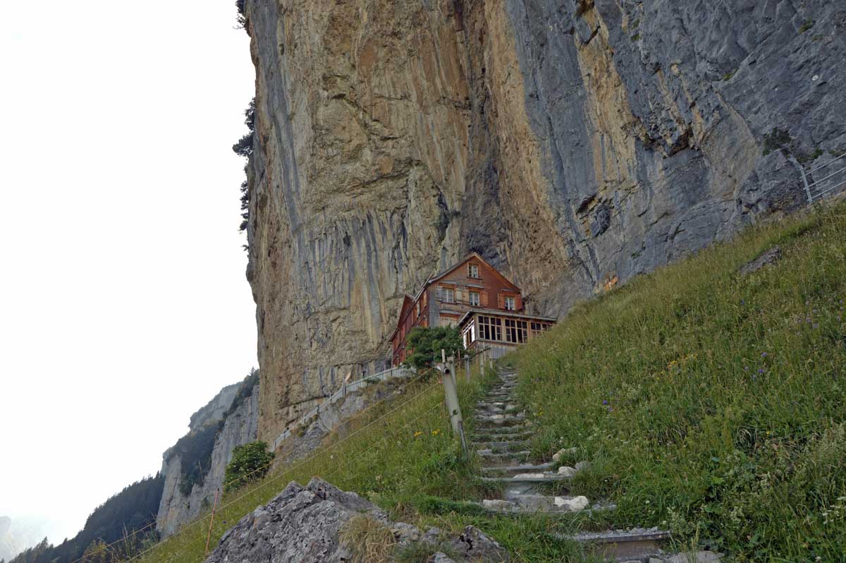 La Suisse, c’est tellement petit qu’ils ont plié le terrain pour faire davantage de surface, et ils te collent une auberge dans le creux de la falaise. La preuve, le Äscher. Etonnant et tellement encastré dans la roche qu’il ne doit pas souvent pleuvoir dessus. Et des poules s’y baladent, tranquilles, à surveiller ce qui pourrait tomber des sacs des randonneurs. Un pot et me voilà à hurler sur un chemin vertigineux… Non mais ça va pas, non : Allez courage ma grande, lance-toi, marche le long de la falaise et ignore le vide. Et voilà !