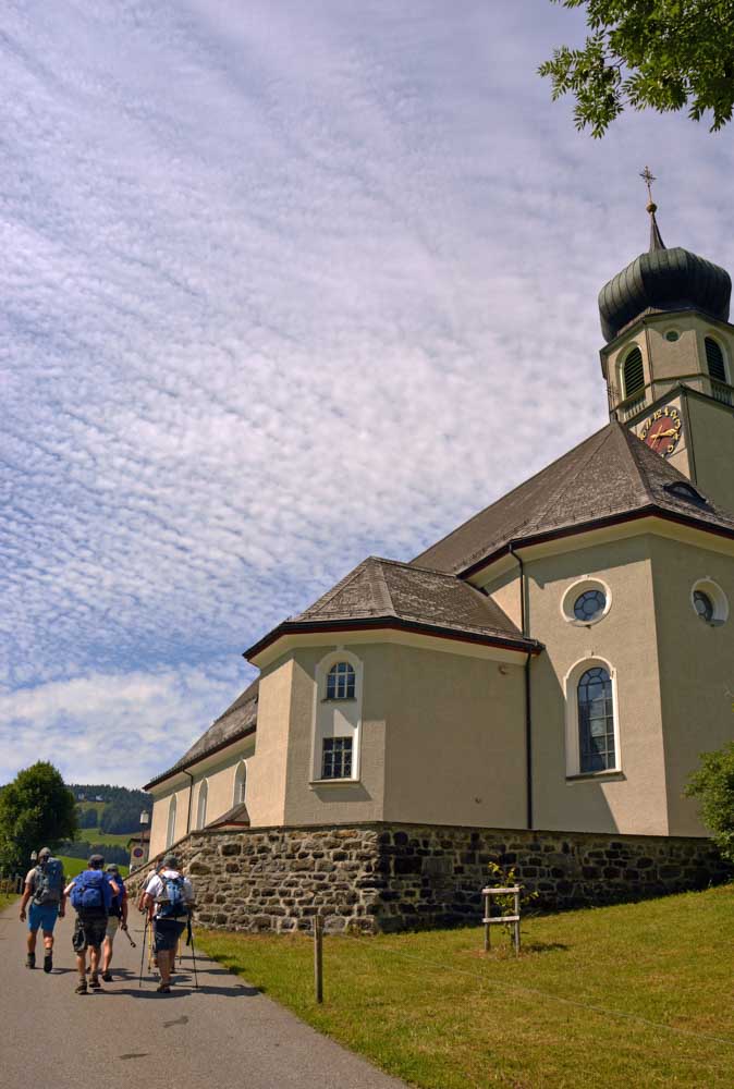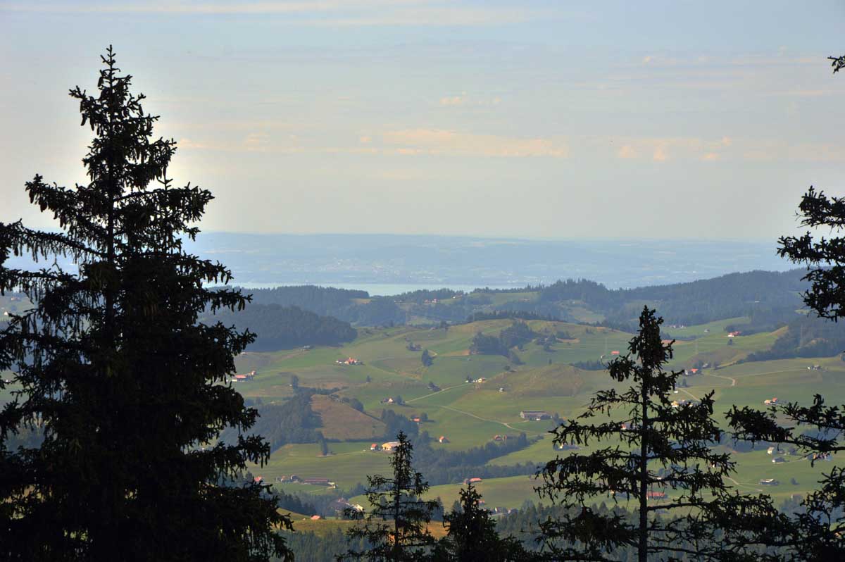 Découverte d’une chapelle en mode grotte, et ensuite toute une randonnée carrément dans une grotte. On me l’avait jamais faite, celle-là ! Et enfin à 18 heures, mon mot allemand préféré surgit : Gasthaus. Douche rapide (c’est règlementé), apéro en terrasse avec vue spectaculaire jusqu’au Lac de Constance. Et là, romantique en diable, la Karina-Iris rota sa bière en admirant le coucher du soleil sur les reliefs suisses, allemands et autrichiens. Quelle vue, mais quelle vue, grandiose, magnifique, bon j’économise mes adjectifs pour demain.