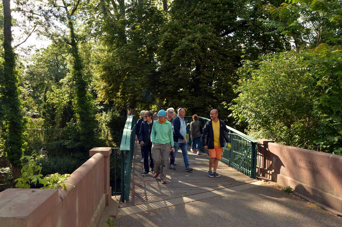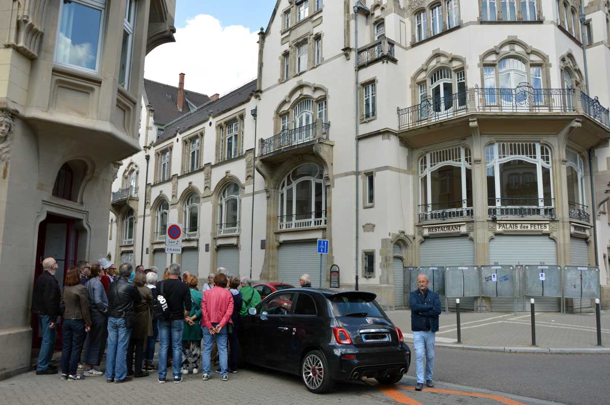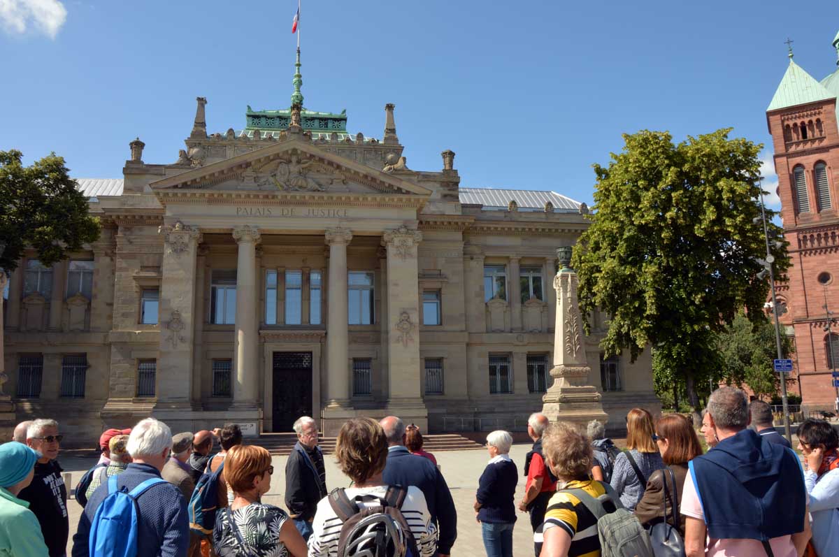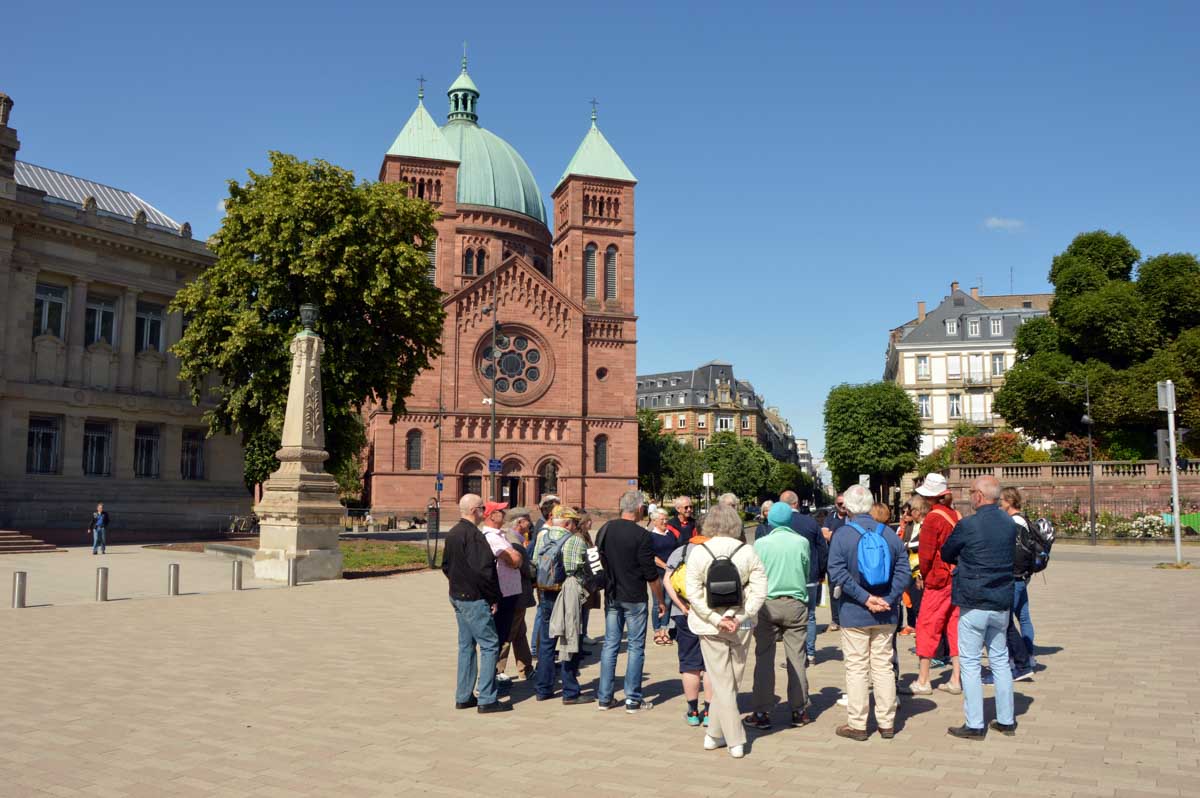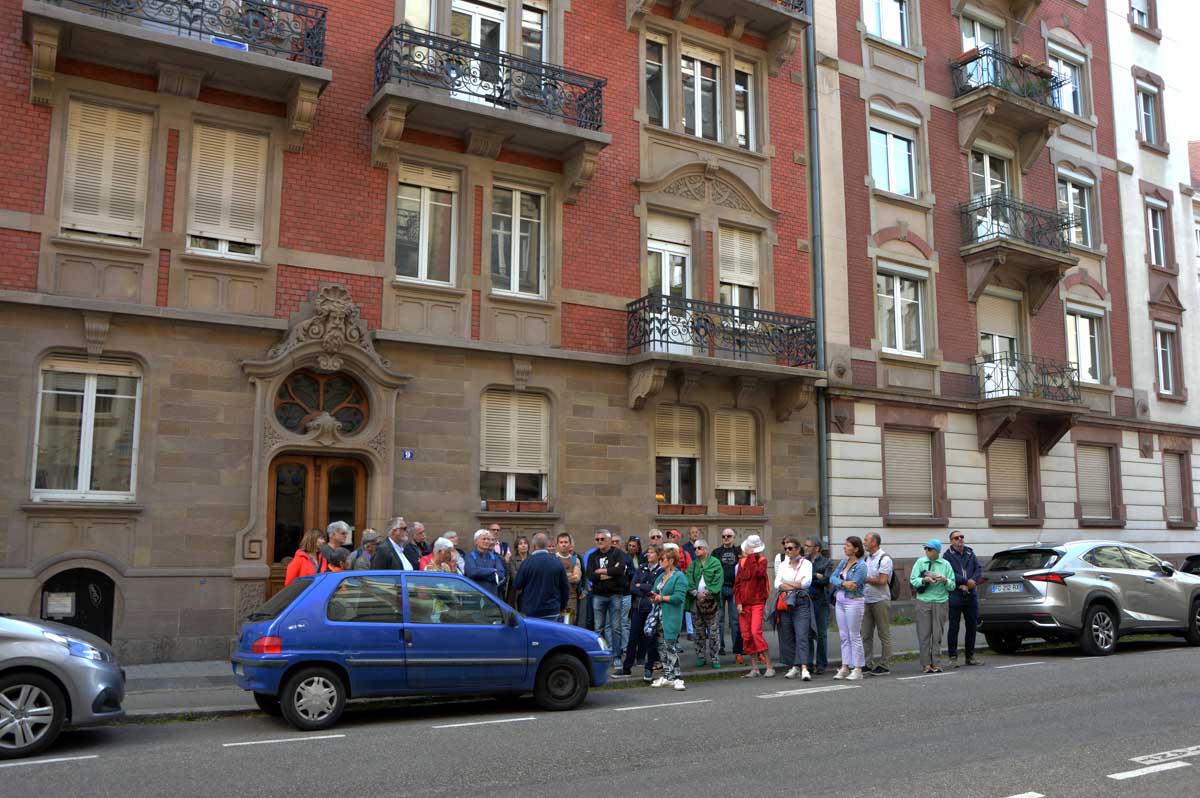 C’est donc au départ du tribunal qu’environ quarante personnes sont parties le nez en l’air ; commençant par apprendre qu’il vaut mieux à Strasbourg ne pas se donner rendez-vous à l’église Saint-Pierre-le-Jeune. Pourquoi ? Parce qu’il y en a deux ! Et pour apprendre à l’arrivée que M. Strauss-Durkheim était un visionnaire car il a légué sa fortune à l’aide aux aveugles… Oui fallait l’oser celle-là, notre animateur l’a fait !