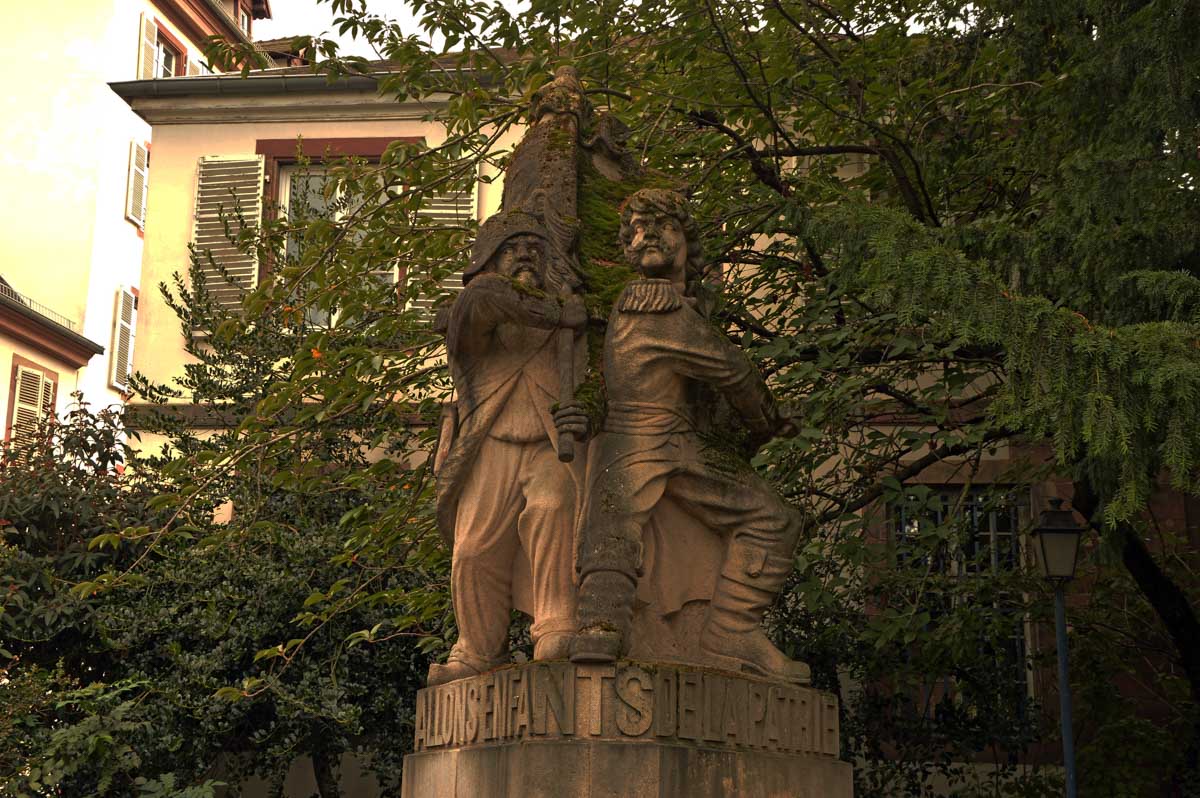 Si tu vas à Marseille, tu trouveras la brasserie le Strasbourg, logique. Mais nous on a mieux, Place Broglie à Strasbourg, l’endroit où a retenti pour la première fois la Marseillaise ! Celle que je chante chaque fois que la France gagne l’Eurovision. Un pied en avant sur une grosse pierre, un bras tendu vers l’avenir, le fessier enjupaillé, le buste altier, le téton conquérant, la coiffe très peu phrygienne, la voix puissante et un rien éraillée par des agapes alcoolisées : allons z’enfants de la Patrie, le jour… et jusqu’au bout, quand il s’agit d’abreuver nos sillons. Eh oui mon canard, tout ça sur la façade de la Banque de France à Strasbourg.