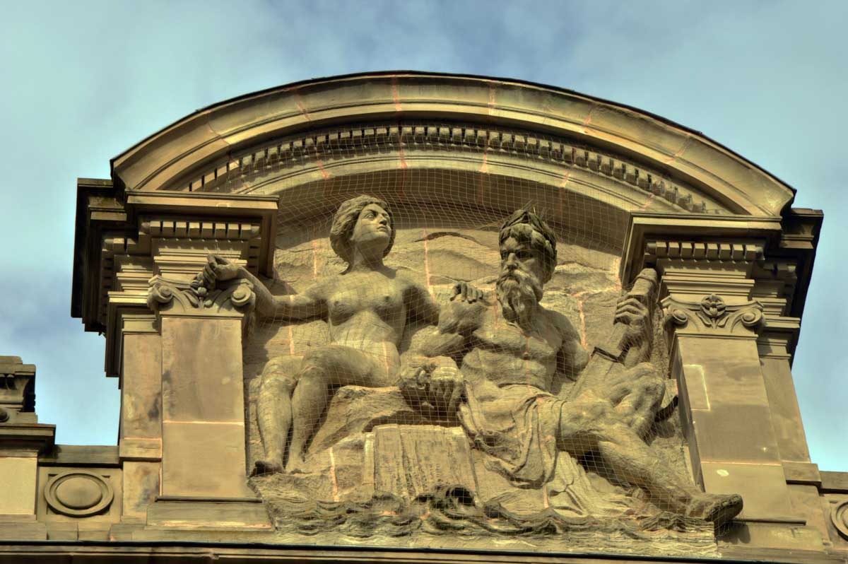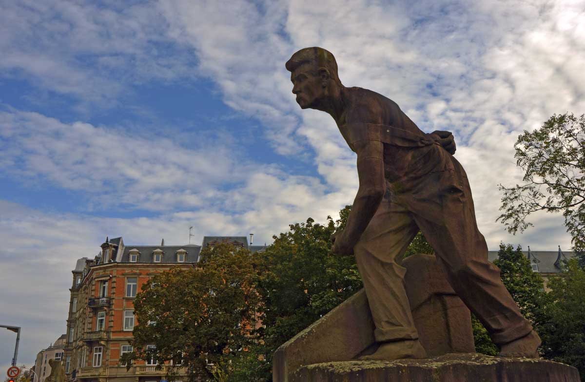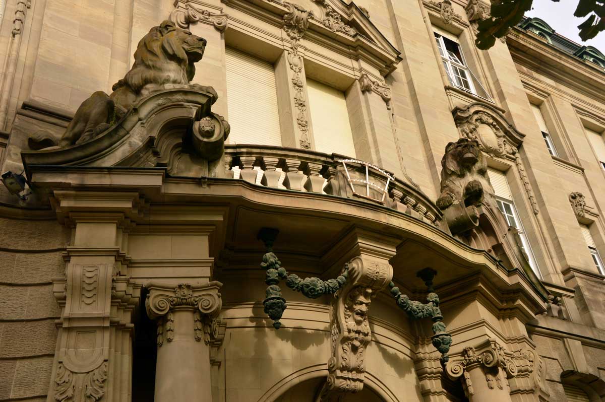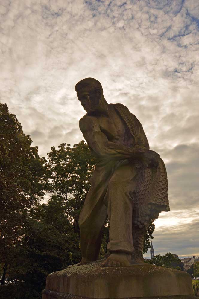Devenue la préfecture, oui là où tu faisais ta carte aussi grise que ta mine en voyant le tarif, l’ancienne résidence de Guillaume 1er n’a pas échappé à sa paire de lions. Un petit tour par le Rhin et la Moselle, le premier barbu et ténébreux comme je les aime, la deuxième seins nus (c’est pas moi qu’ait posé pour Alfred !), et les deux avec des grosses mains. Et nous aboutîmes (il est juste çui-là ?) au Pont Kennedy. Il date de 1906 quand fallait relier l’Avenue des Vosges à celle de la Forêt-Noire. Là il a vu grand l’Alfred. Des colosses, pêcheurs, bateleurs… Les métiers disparus du Rhin, quoi.