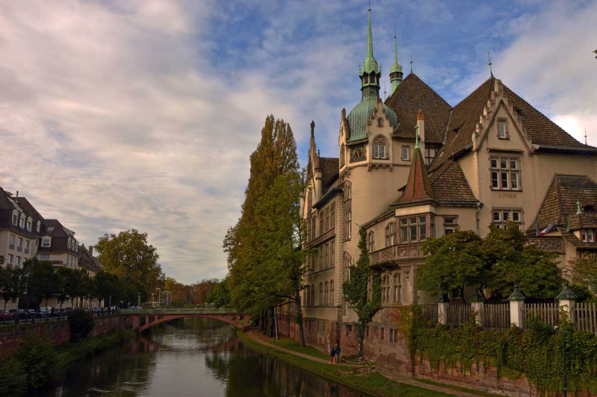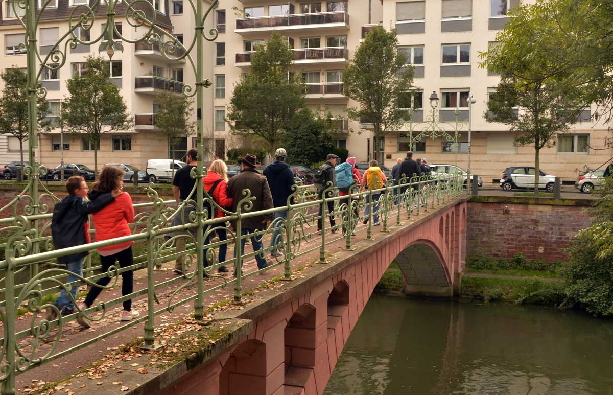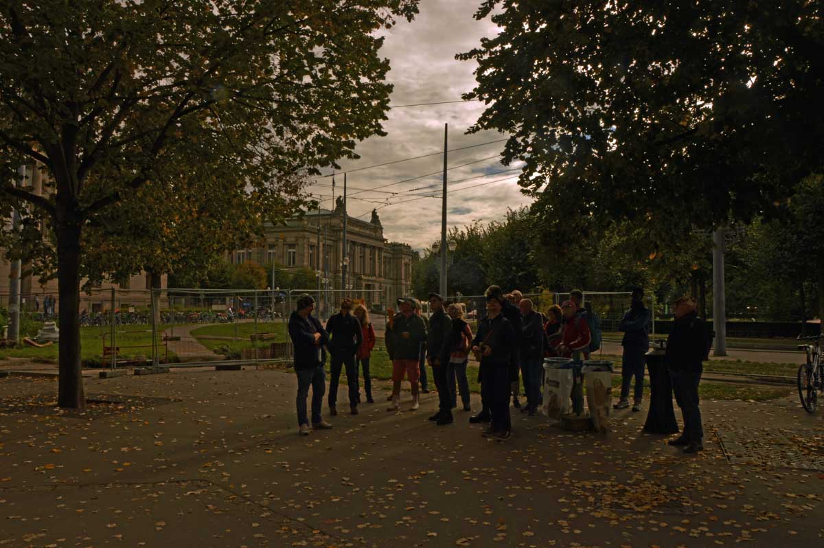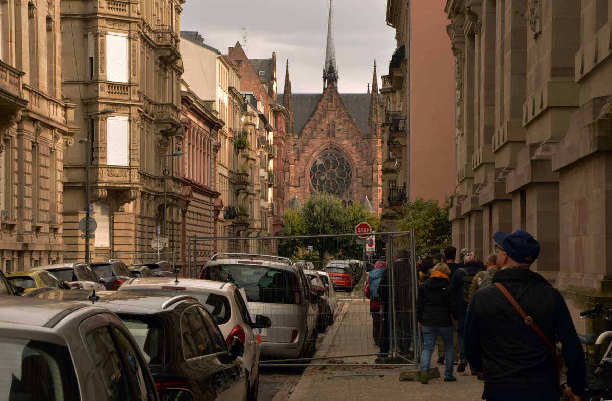 Pour le retour de notre sortie culturelle, on a choisi l’automne. Nous flânâmes (aussi bizarre que le « vous flânâtes ») dans les rues de Strasbourg, le nez en l’air. Enfin plutôt une narine et un œil en l’air, et l’autre narine et l’autre œil sur le trottoir vu le terrain miné sur lequel nous évoluâmes. Je fais allusion aux égarements canins qui font qu’un teckel modèle de base peut t’envoyer à l’hosto aussi sûrement qu’une peau de banane, l’odeur en plus.
