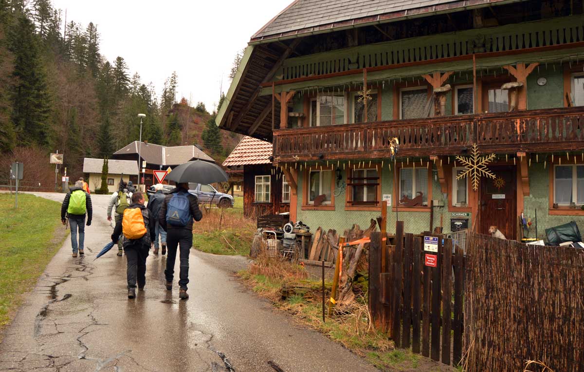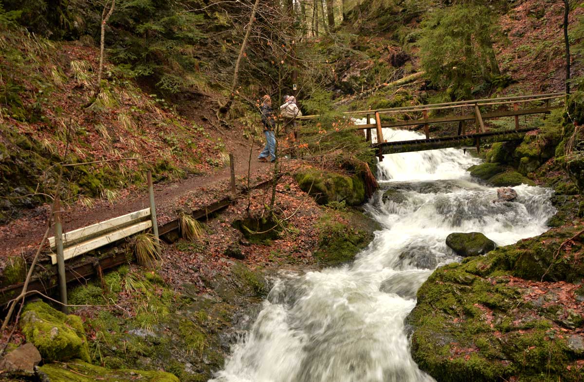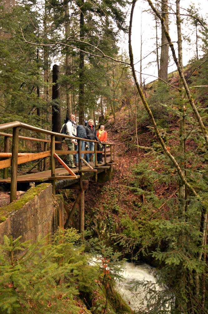 Depuis Lörrach, la surprise a été le Wehratal, un majestueux canyon que nous avons traversé en voiture par la L148. Des images tellement inattendues qu’une pensée fusa : faut qu’on aille un jour randonner par là ! Et voilà Todtmoos, dont le nom évoque la tourbière humide, ça annonçait la couleur. Béni sois-tu Jean Marius, inventeur du parapluie ! Entre capage et décapage, nous avons remonté la très belle Rabenschlucht avec ses petits ponts. A première vue, le nom fait peur, mais ça veut simplement dire le ravin des corbeaux.