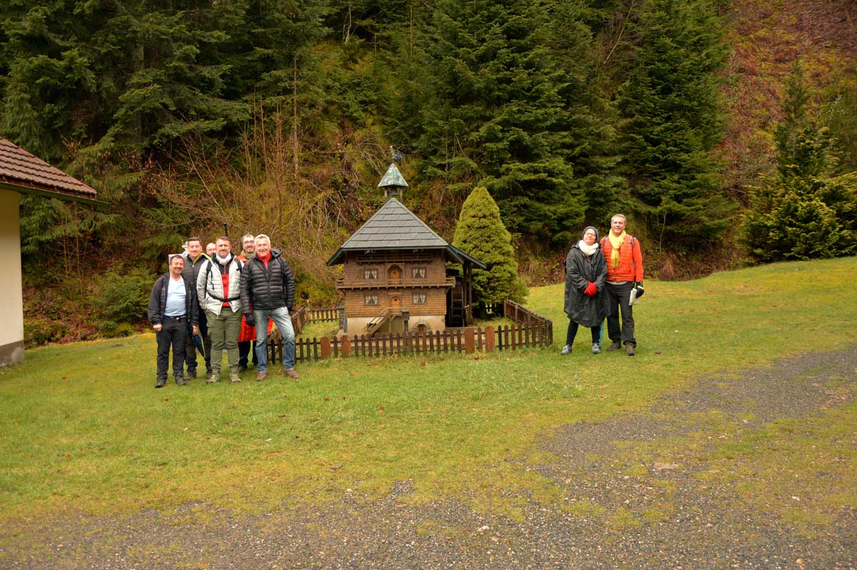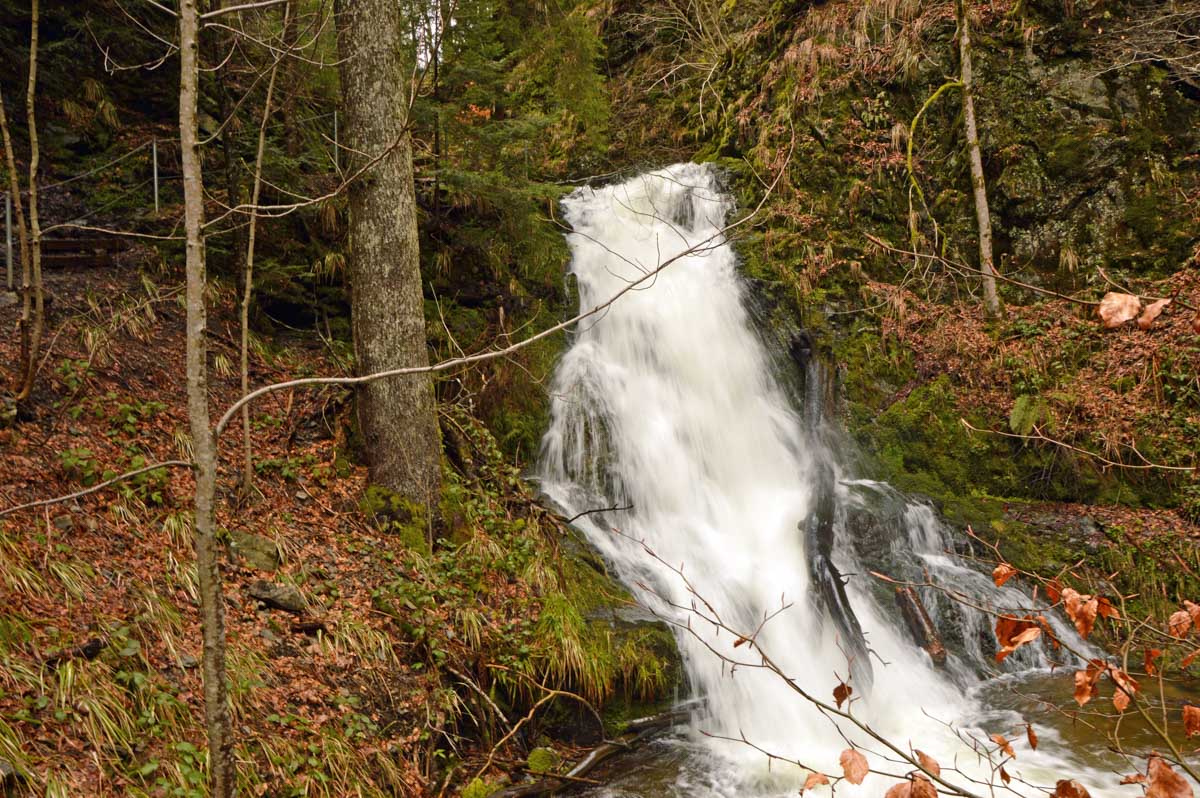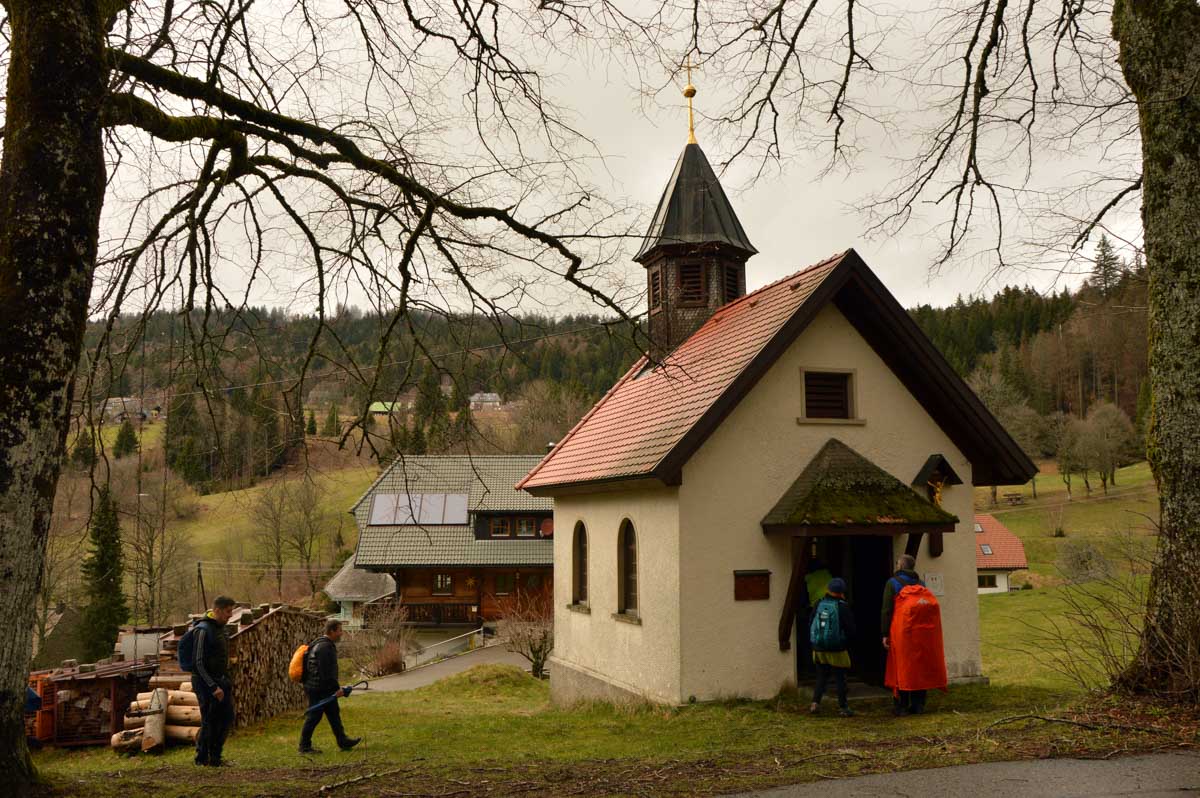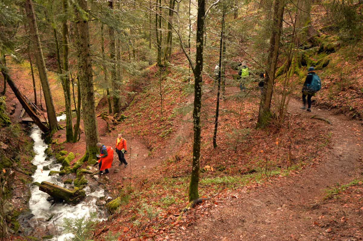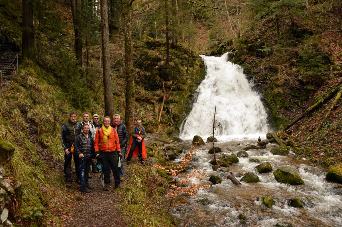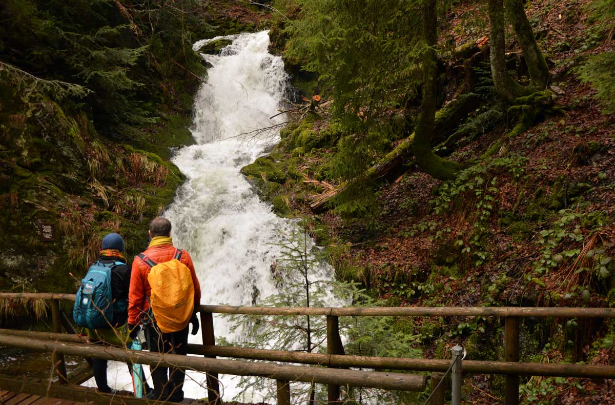 Bien que n’ayant rien à nous faire pardonner (ça se saurait), nous avons péleriné sans pélerines mais avec des capes de pluie au Liebfraubrunnen (la fontaine de la Vierge) et puis à la Herr Jesu Kapelle de Rütte (on comprend même sans traduction !). Ces formalités expiatoires accomplies, ce fut retour à la flotte, pardon, à l’eau, pour descendre le long des cascades de Todtmoos. Quel plaisir de les voir en pleine forme, loin des filets d’eau que nous avions pu voir ailleurs l’été dernier. De la vraie cascade des familles, virile, abondante, puissante, tonitruante, walkyrienne, en un mot : cascadante !
