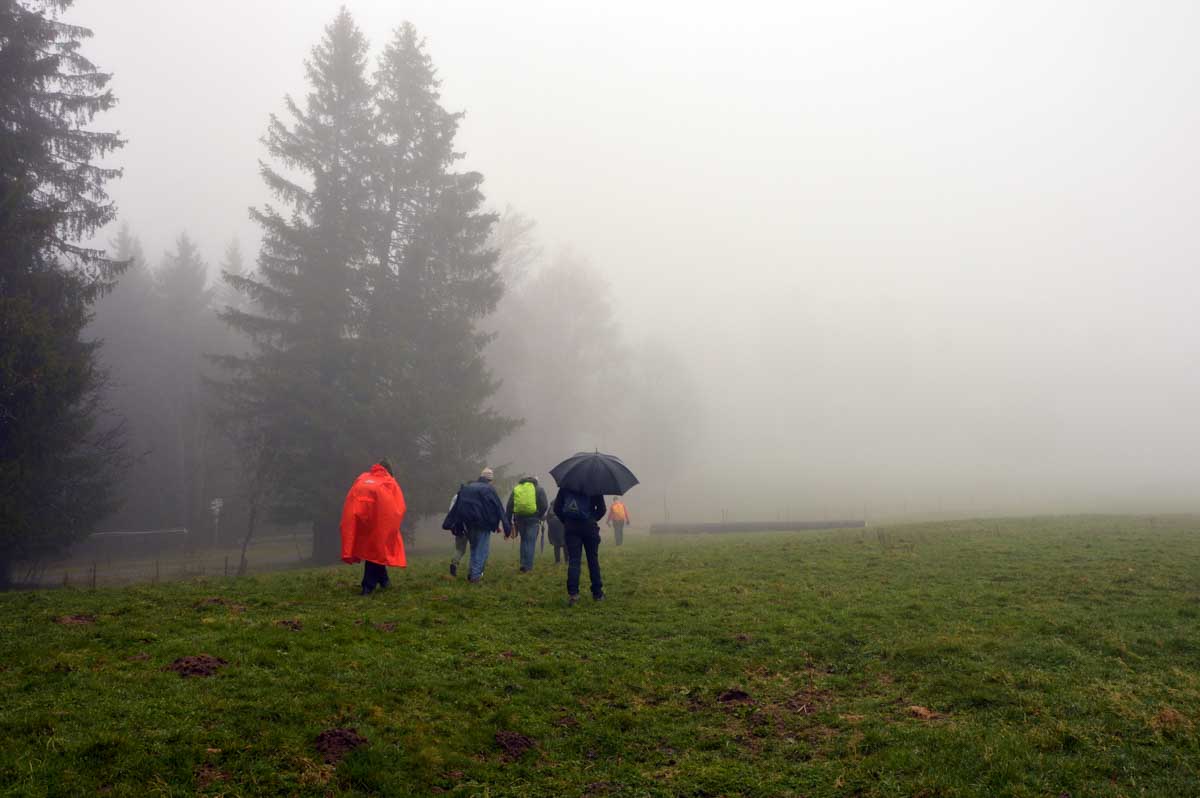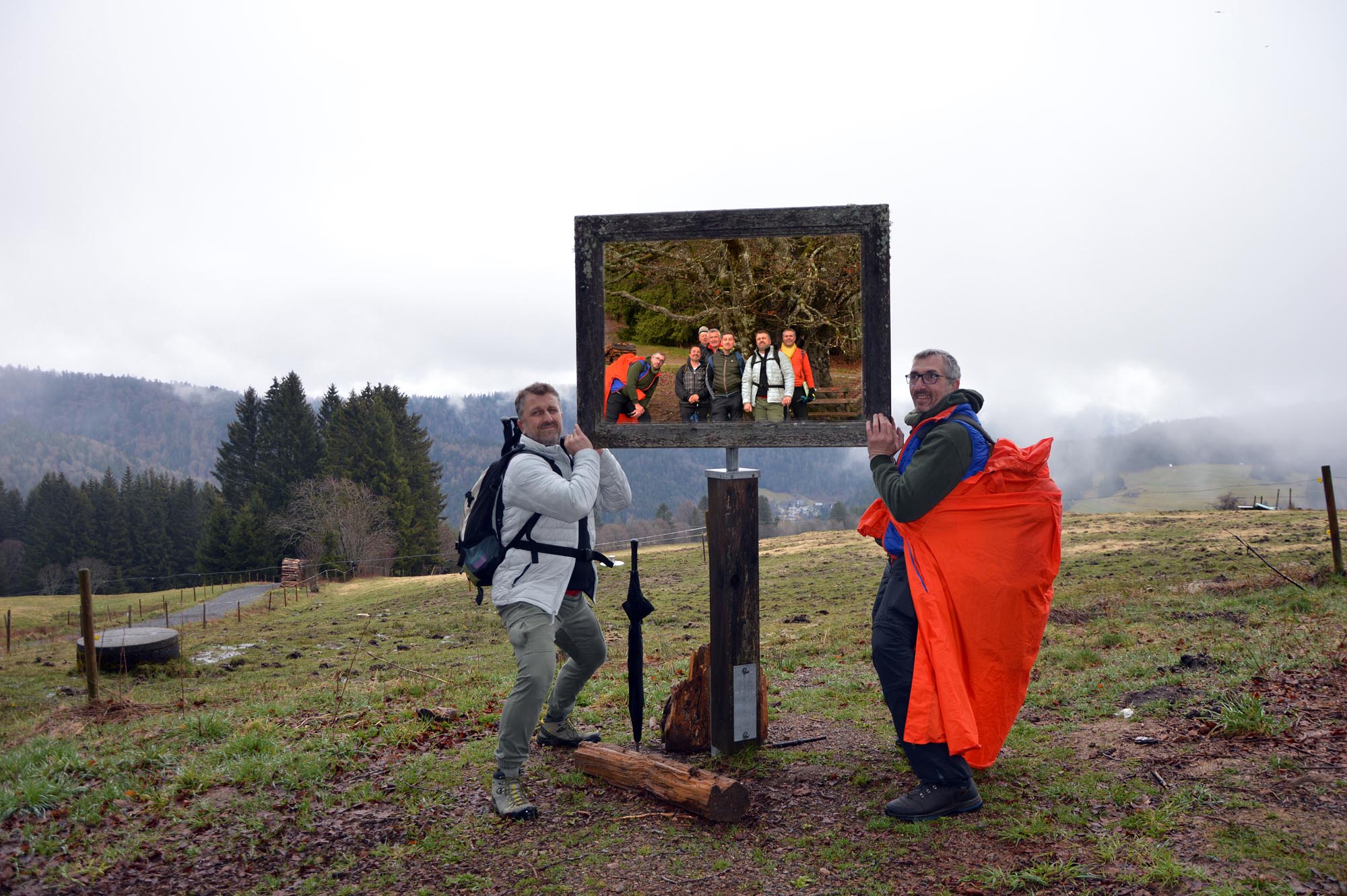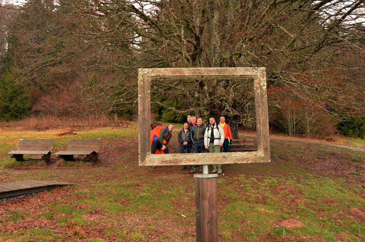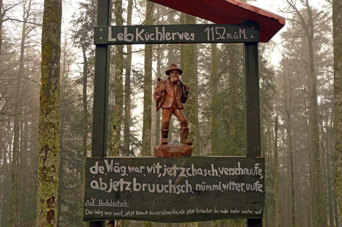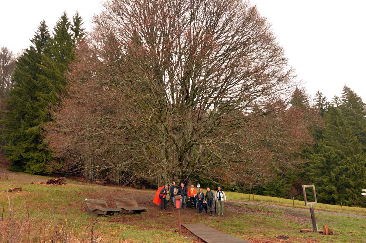 D’une sculpture animale à une autre, œuvres d’art forestières, nous n’avons même pas remarqué que nous montions, tu t’rends compte ? D’où l’arrivée au Col du Hochkopf et dans l’eau cette fois sous sa forme vaporeuse. La tête dans les nuages oui, mais c’est moins romantique dans la réalité ! A défaut de grimper à la tour pour voir le brouillard, nous avons parcouru le Panorama Weg pour arriver au vieux tilleul et ses Himmelsliegen, ses chaises longues célestes, quoi, et on y croit, on y croit, avec du soleil on peut y croire.