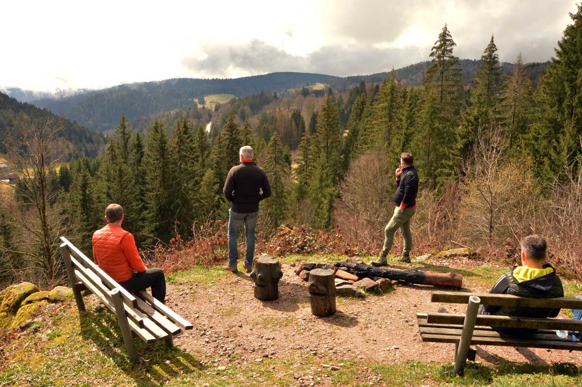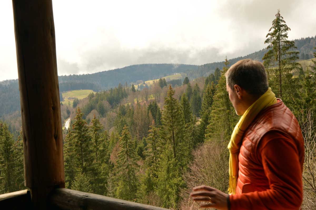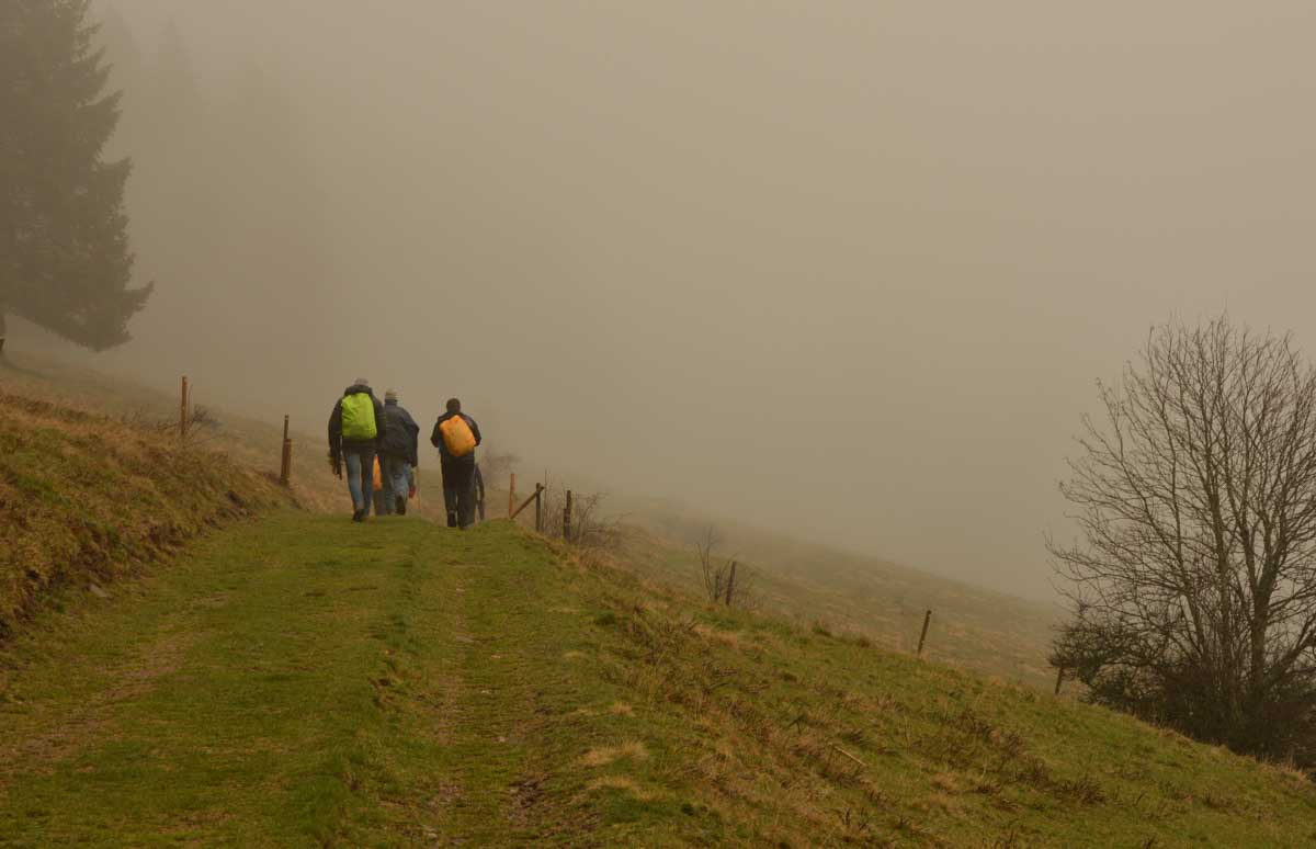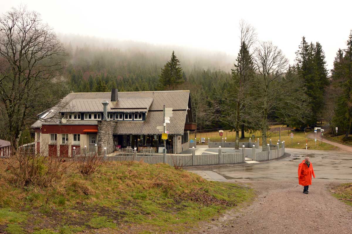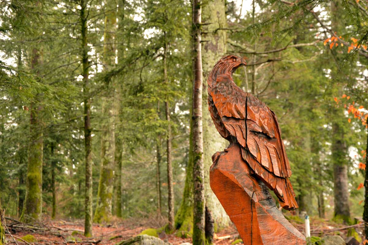 D’une sculpture animale à une autre, œuvres d’art forestières, nous n’avons même pas remarqué que nous montions, tu t’rends compte ? D’où l’arrivée au Col du Hochkopf et dans l’eau cette fois sous sa forme vaporeuse. La tête dans les nuages oui, mais c’est moins romantique dans la réalité ! A défaut de grimper à la tour pour voir le brouillard, nous avons parcouru le Panorama Weg pour arriver au vieux tilleul et ses Himmelsliegen, ses chaises longues célestes, quoi, et on y croit, on y croit, avec du soleil on peut y croire.