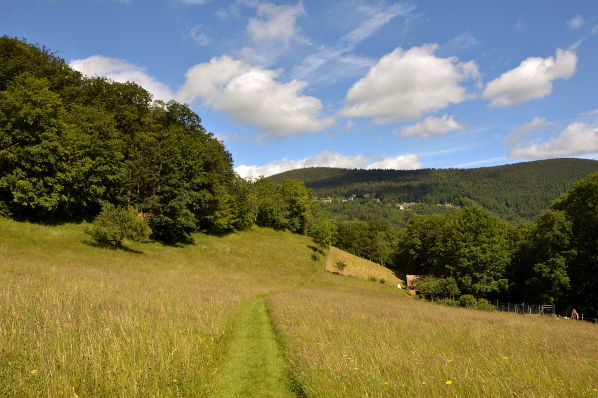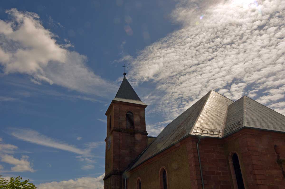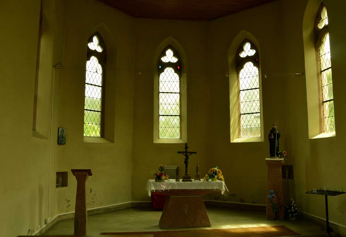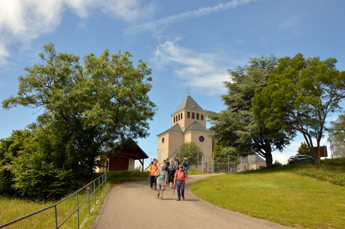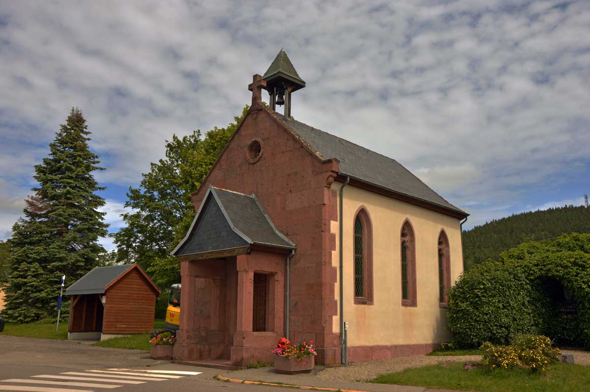 Donc nous quittâmes les Trois Epis par un soleil radieux et nous folâtrâmes à travers prés et forêts pour rejoindre Labaroche Eglise et son église Saint-Michel, avant de monter vers Labaroche tout court au-dessus de la Basse Baroche… Nous tentâmes de ne point nous démonter le cervelet avec ces roches et admirâmes la sobre chapelle Saint-Wandrille à Labaroche, avant de passer devant l’étrange église Saint-Joseph, sorte de bunker (d’ailleurs elle a été financée avec les dommages de guerre) érigé sur un truc déjà existant…